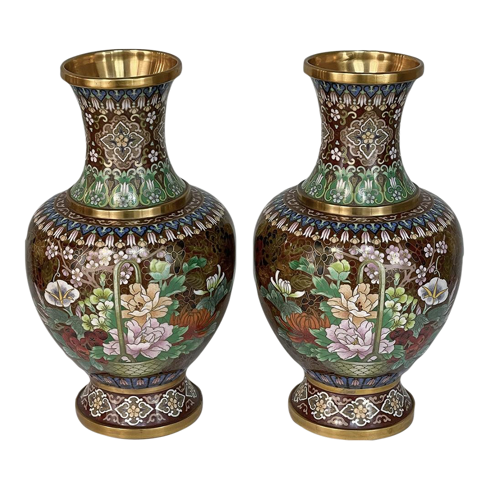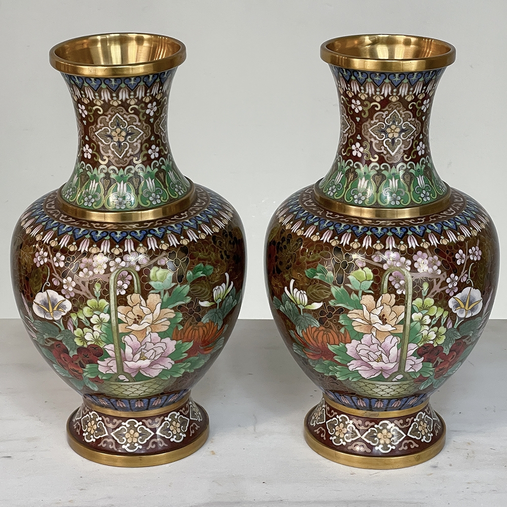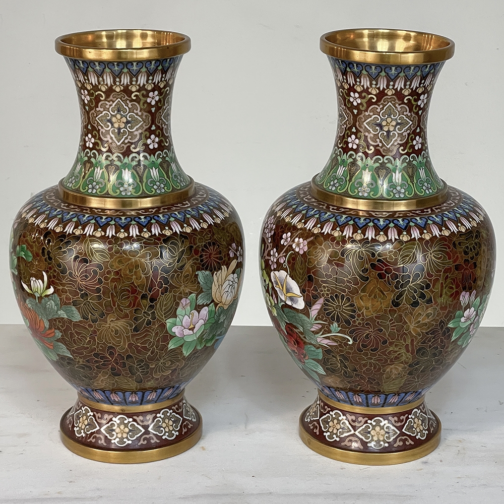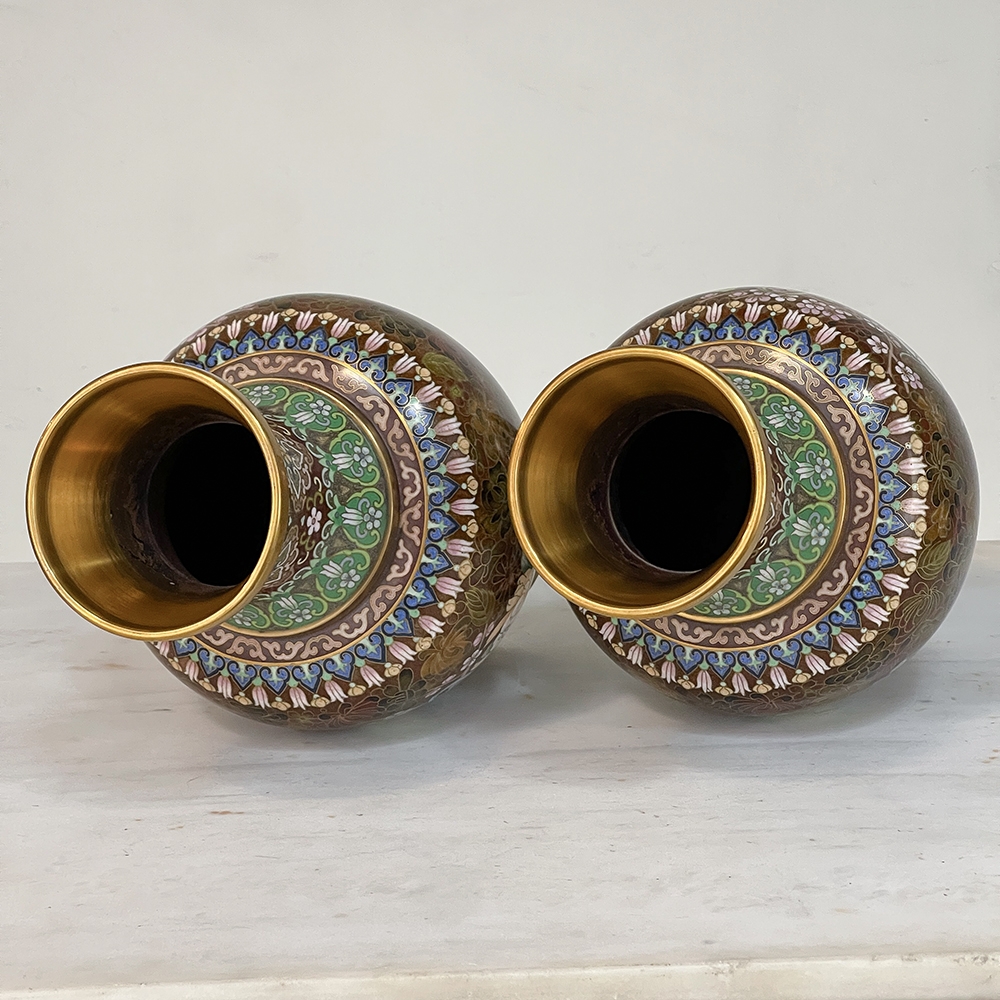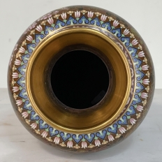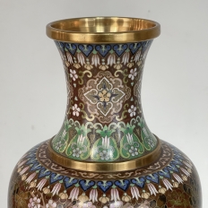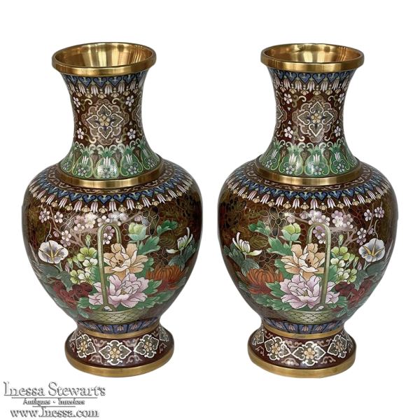 Pair Antique Cloissone Vases is an extraordinary example of the breed, displaying its well-preserved, rich coloration and exhibiting a large format design theme celebrating the natural beauty of flowers. Decorated in the round, brass wire was carefully affixed to the brass vase, then the spaces created were filled with various colors of enamel, with the resulting product being fired one last time to create the exquisite works of art before you. Cloissone techniques originated in the Far Orient, and were copied by many nations including France, which chose to call the process Champleve. This pair feature the most popular combinations of colors with a rich dark cerulean blue as the background making the colorful flowers burst to life!