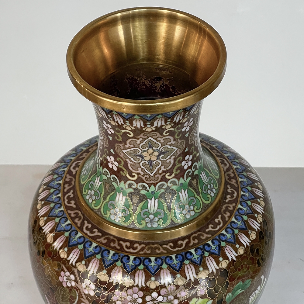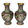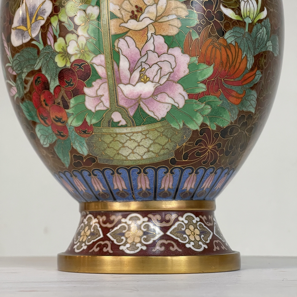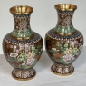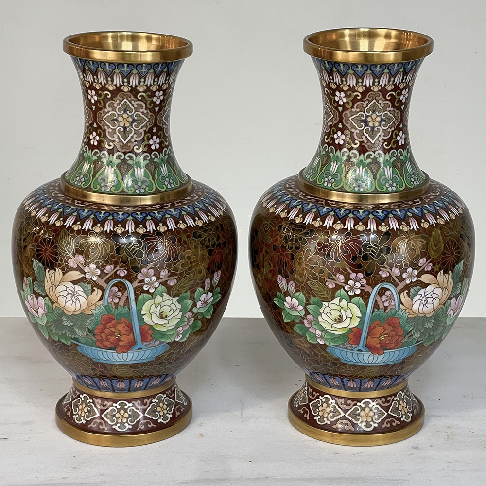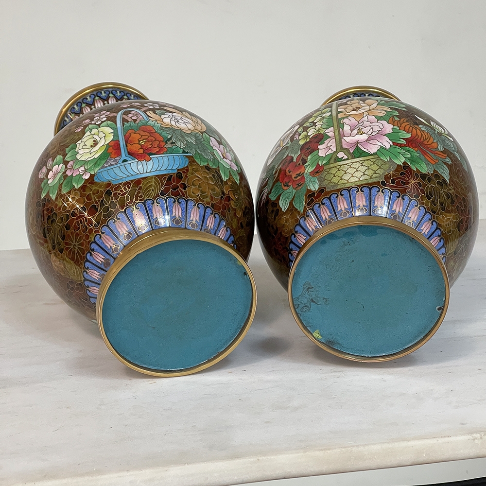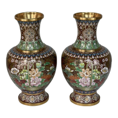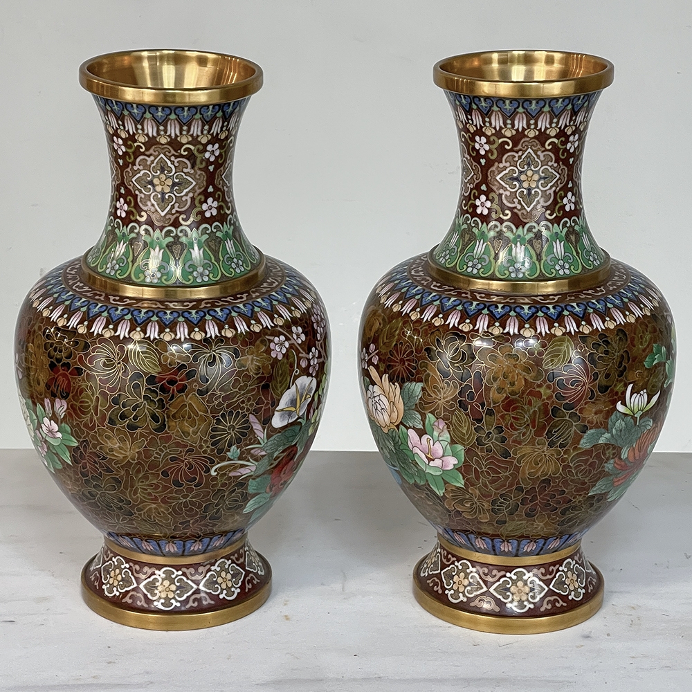 Pair Antique Cloissone Vases is an extraordinary example of the breed, displaying its well-preserved, rich coloration and exhibiting a large format design theme celebrating the natural beauty of flowers. Decorated in the round, brass wire was carefully affixed to the brass vase, then the spaces created were filled with various colors of enamel, with the resulting product being fired one last time to create the exquisite works of art before you. Cloissone techniques originated in the Far Orient, and were copied by many nations including France, which chose to call the process Champleve. This pair feature the most popular combinations of colors with a rich dark cerulean blue as the background making the colorful flowers burst to life!