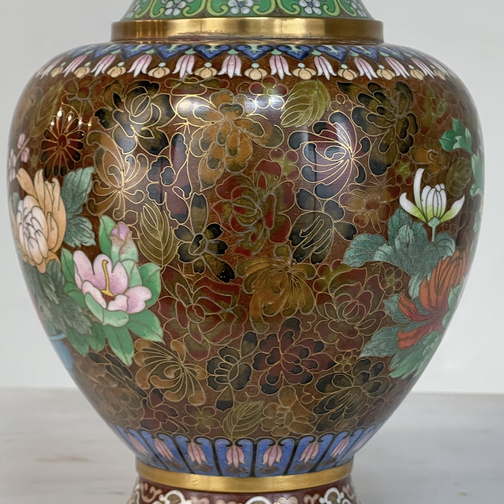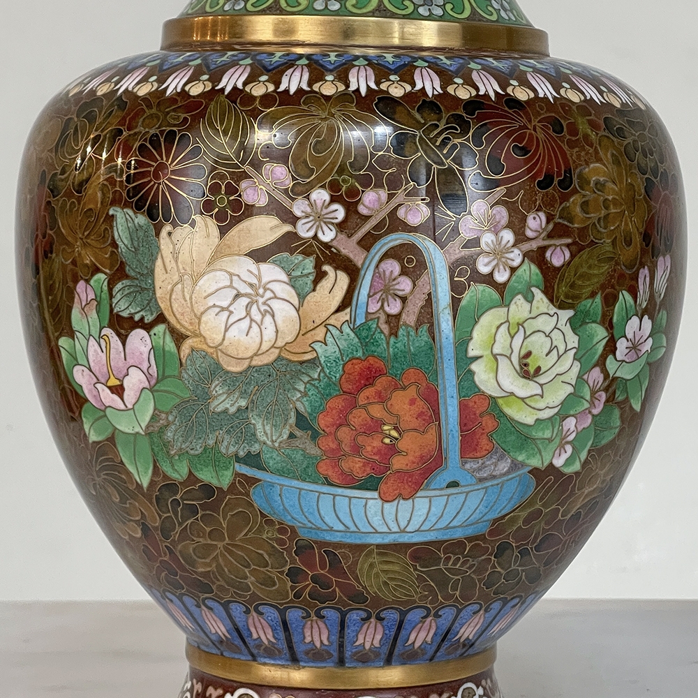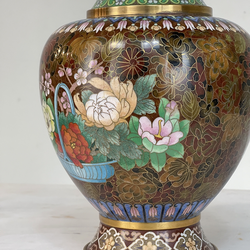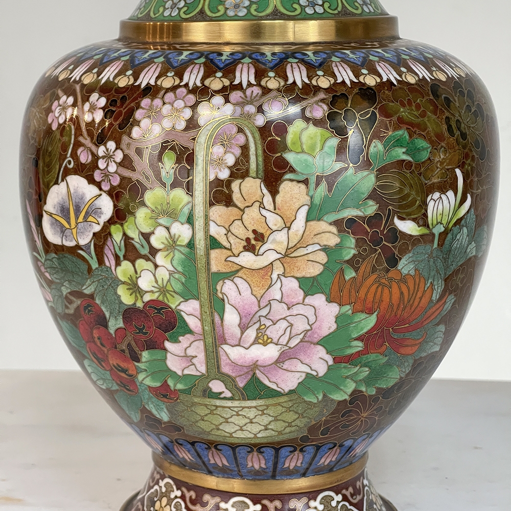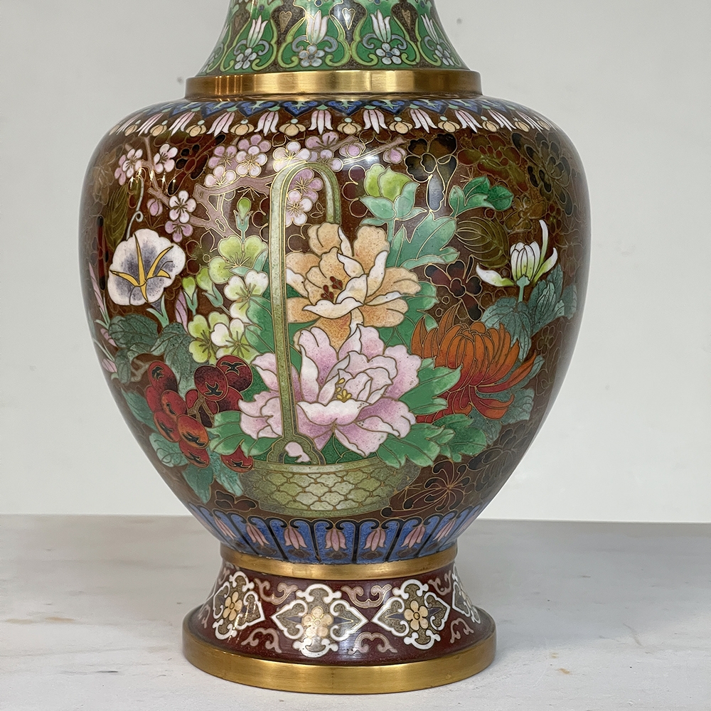Pair Antique Cloissone Vases is an extraordinary example of the breed, displaying its well-preserved, rich coloration and exhibiting a large format design theme celebrating the natural beauty of flowers. Decorated in the round, brass wire was carefully affixed to the brass vase, then the spaces created were filled with various colors of enamel, with the resulting product being fired one last time to create the exquisite works of art before you. Cloissone techniques originated in the Far Orient, and were copied by many nations including France, which chose to call the process Champleve. This pair feature the most popular combinations of colors with a rich dark cerulean blue as the background making the colorful flowers burst to life!