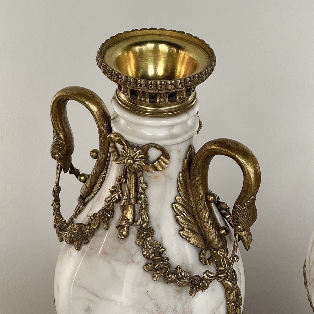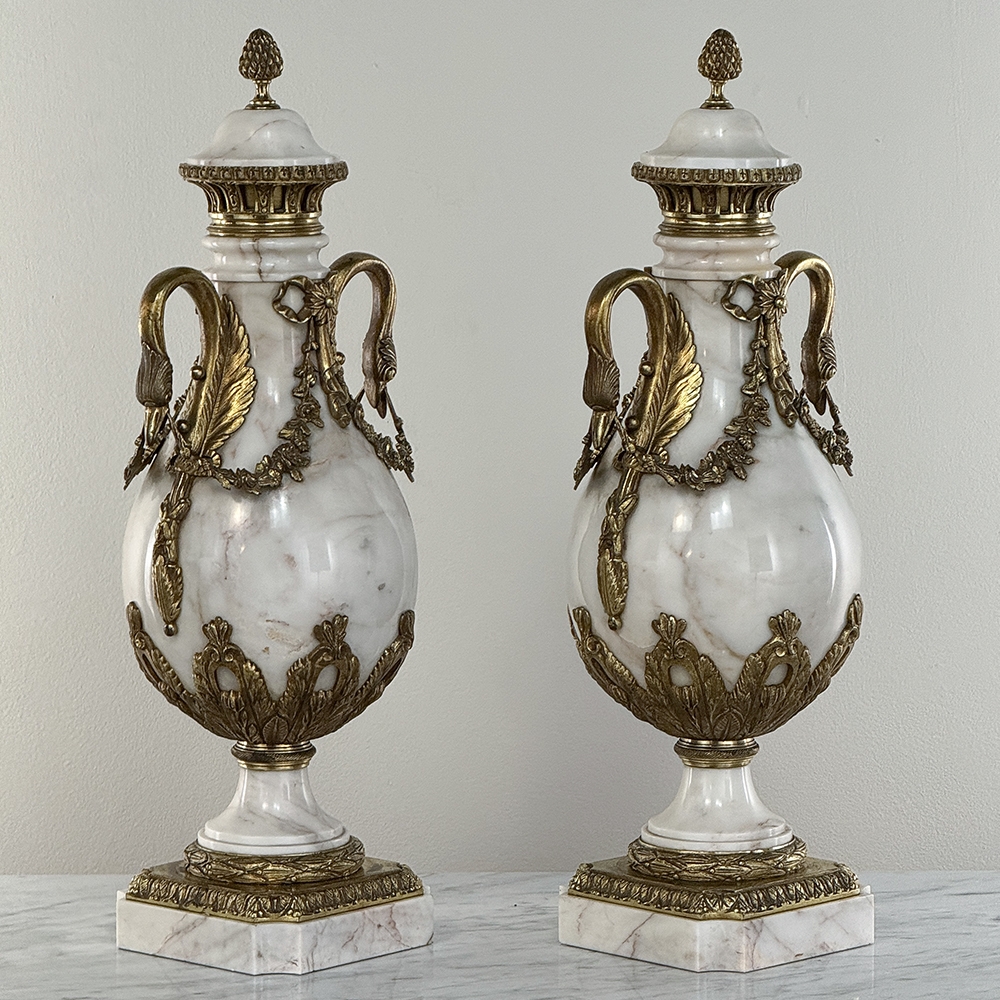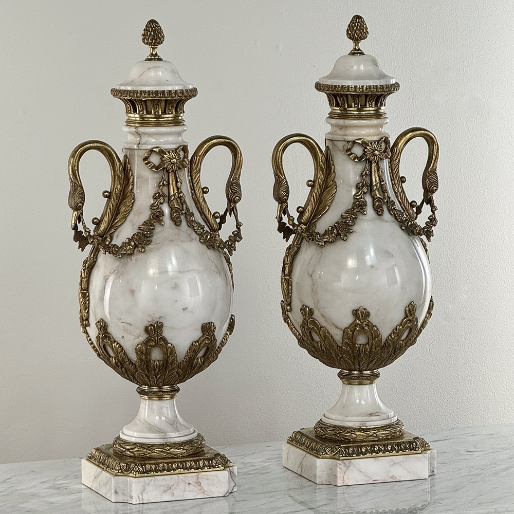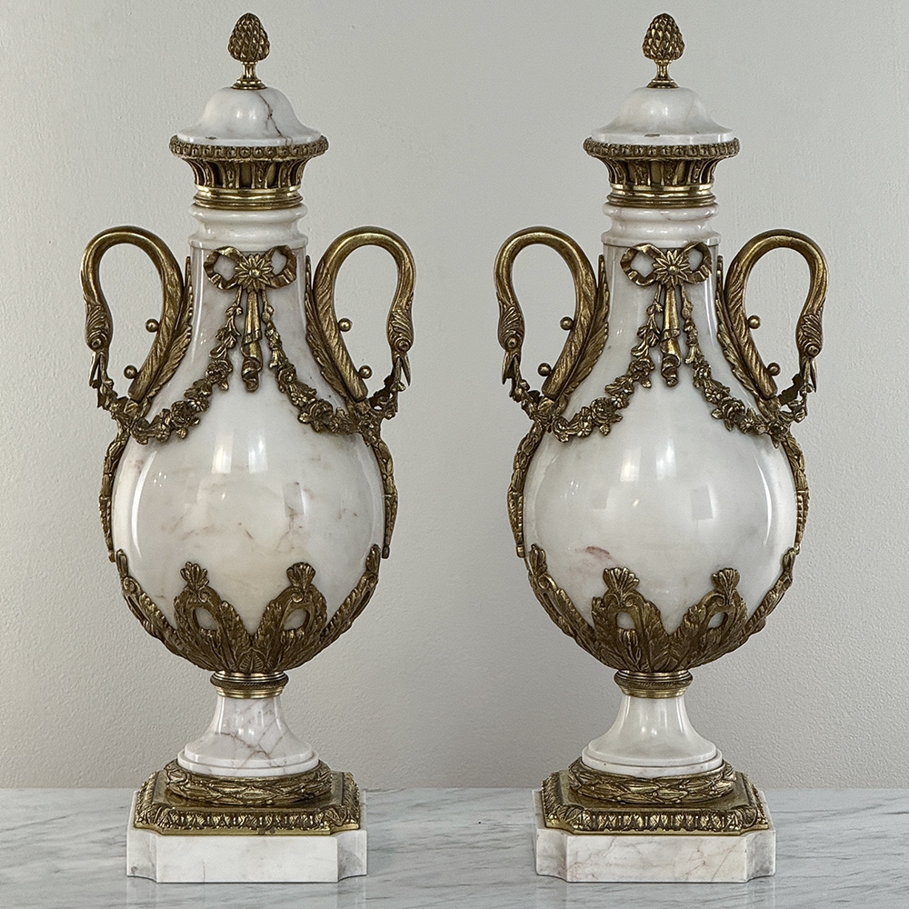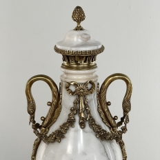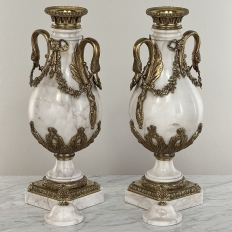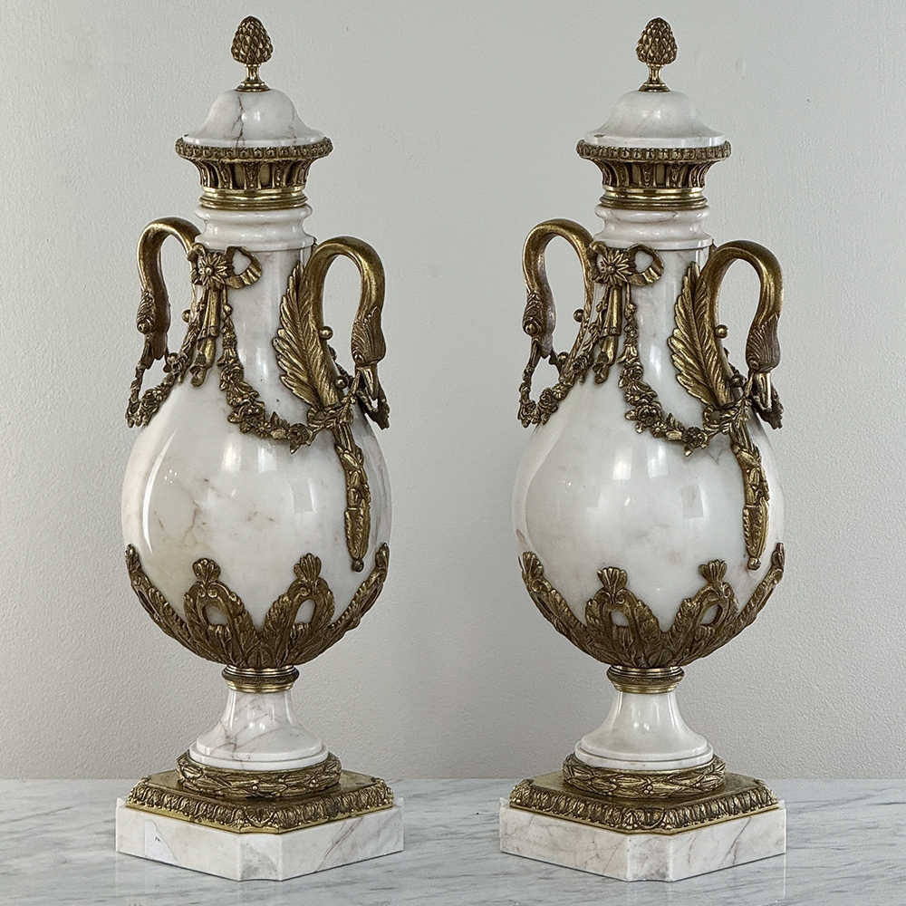 Pair Antique French Empire Cararra Marble and Bronze Cassolettes ~ Mantel Urns will make a stunning visual accent for any room! Hand-crafted from prized Carrara marble and gold-plated bronze, each was designed for decorative purposes, although the overall form resembles an urn shape. The main body is solid marble, affixed atop a base with two levels of marble separated by a finely detailed platform. Intriguing designs are incorporated into the mounts that lavish the urn forms, including foliates, ribbon, floral garlands and graceful swans. The crown consists of a finely detailed bronze mount onto which the marble lid is placed, itself fitted with a pineapple finial as a finishing touch. Ideal for adding timeless classical elegance and symmetry to any decor!
