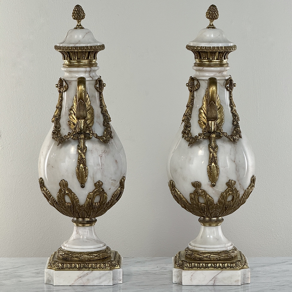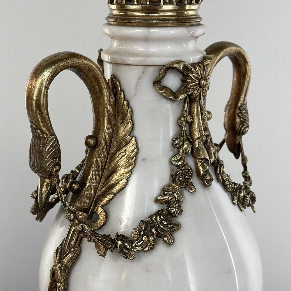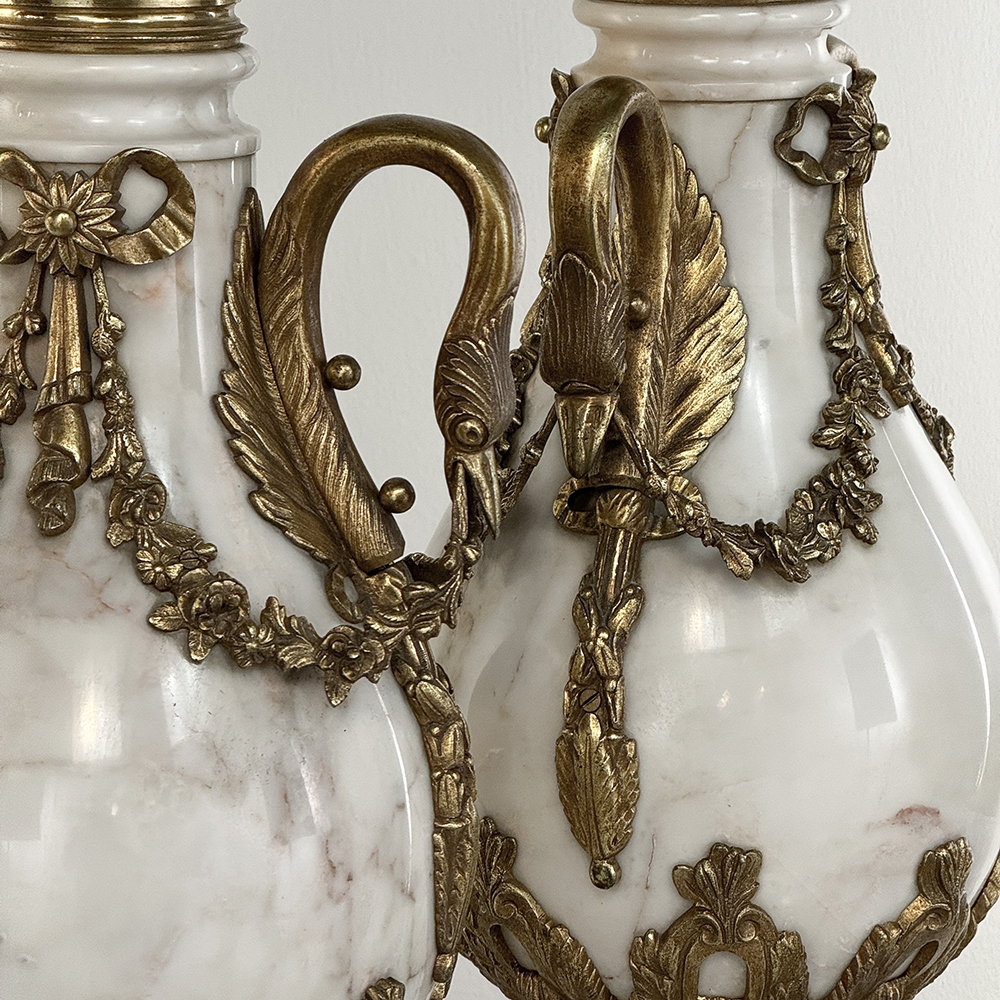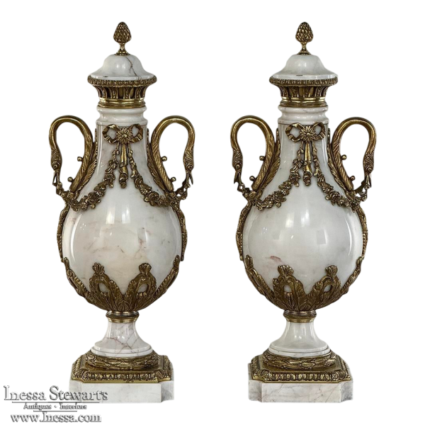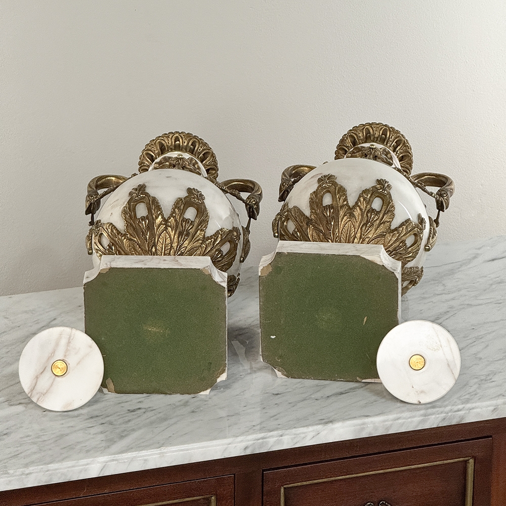 Pair Antique French Empire Cararra Marble and Bronze Cassolettes ~ Mantel Urns will make a stunning visual accent for any room! Hand-crafted from prized Carrara marble and gold-plated bronze, each was designed for decorative purposes, although the overall form resembles an urn shape. The main body is solid marble, affixed atop a base with two levels of marble separated by a finely detailed platform. Intriguing designs are incorporated into the mounts that lavish the urn forms, including foliates, ribbon, floral garlands and graceful swans. The crown consists of a finely detailed bronze mount onto which the marble lid is placed, itself fitted with a pineapple finial as a finishing touch. Ideal for adding timeless classical elegance and symmetry to any decor!
