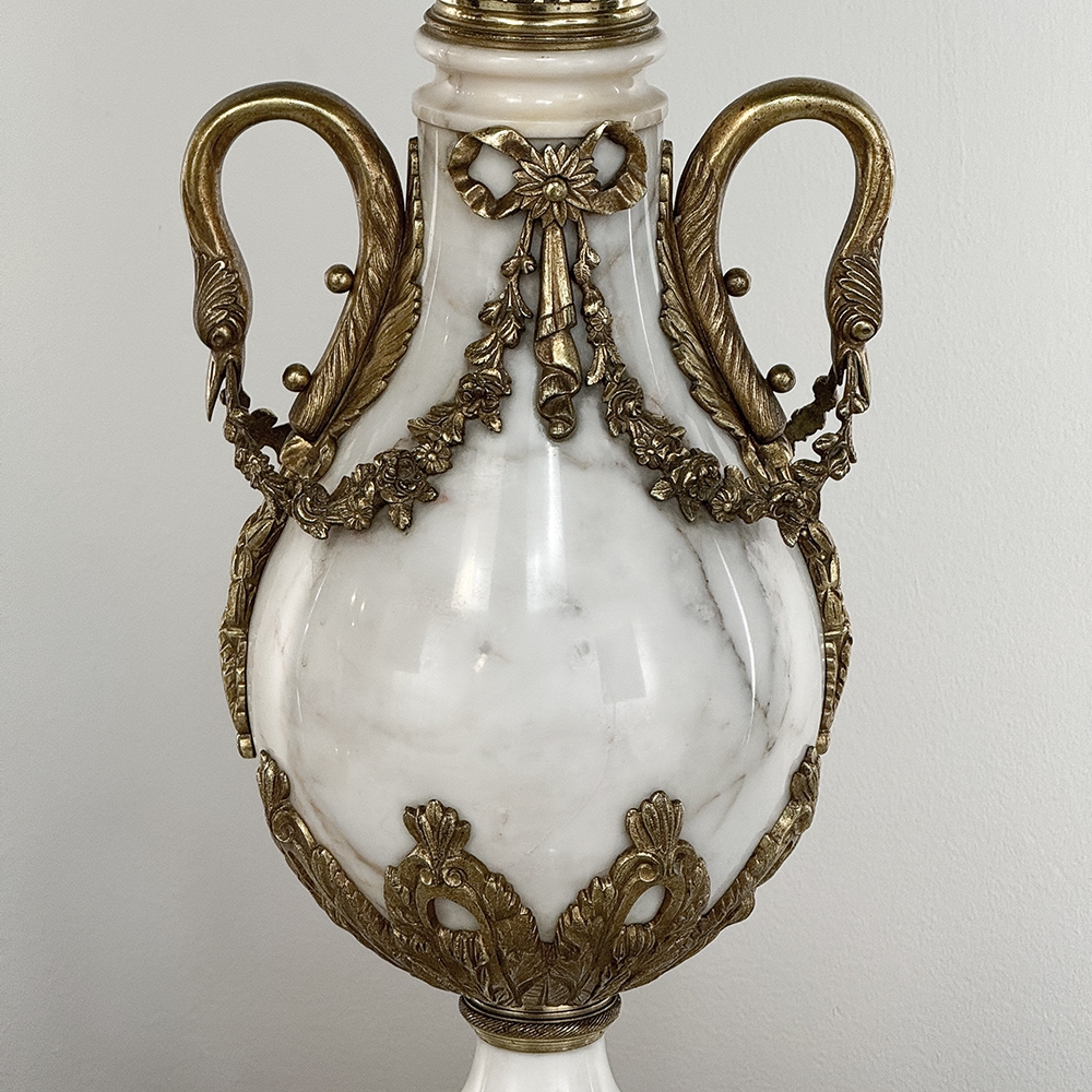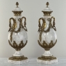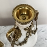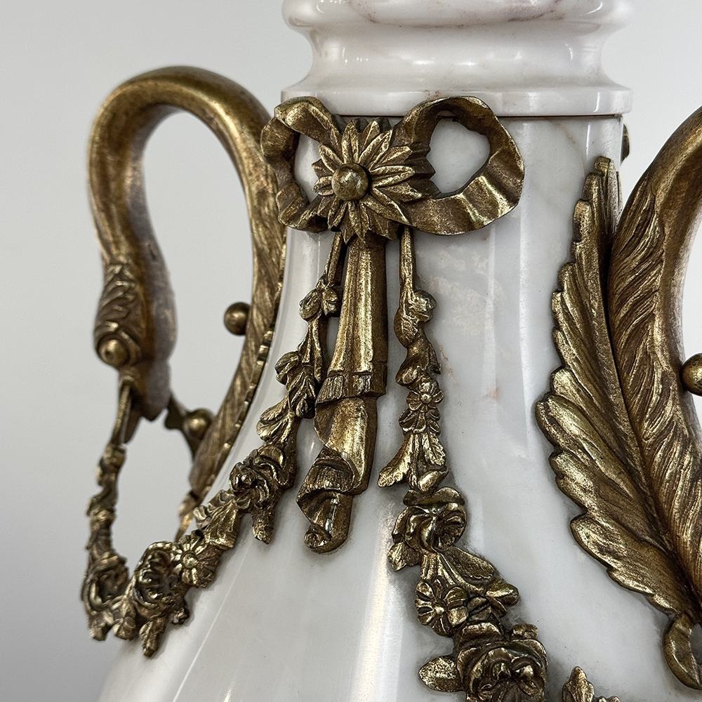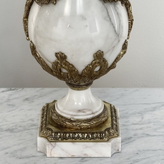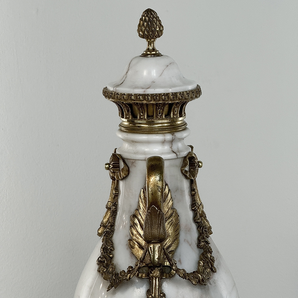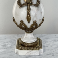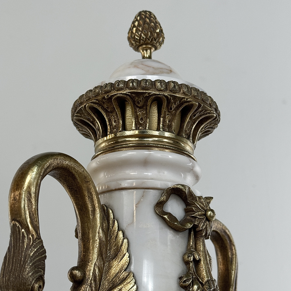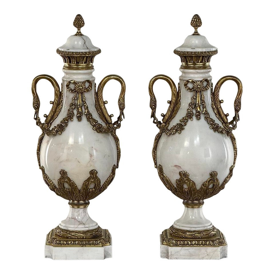 Pair Antique French Empire Cararra Marble and Bronze Cassolettes ~ Mantel Urns will make a stunning visual accent for any room! Hand-crafted from prized Carrara marble and gold-plated bronze, each was designed for decorative purposes, although the overall form resembles an urn shape. The main body is solid marble, affixed atop a base with two levels of marble separated by a finely detailed platform. Intriguing designs are incorporated into the mounts that lavish the urn forms, including foliates, ribbon, floral garlands and graceful swans. The crown consists of a finely detailed bronze mount onto which the marble lid is placed, itself fitted with a pineapple finial as a finishing touch. Ideal for adding timeless classical elegance and symmetry to any decor!