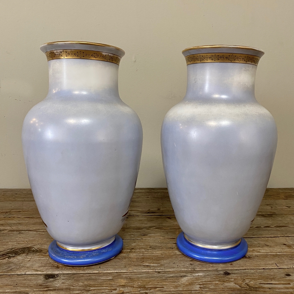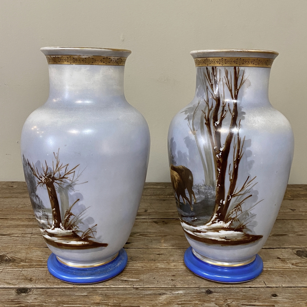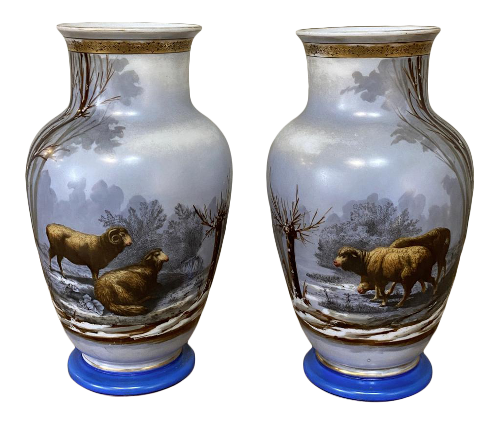 Pair Antique Hand-Painted Opaline Vases will make a delightful addition to your decor, with subtle gray tones in the background and warm browns and golds used to depict mirror images of a ram and ewe in a naturalistic setting. The gold pattern on the rim at top and the blue base add nice color touches.