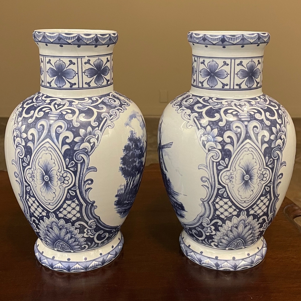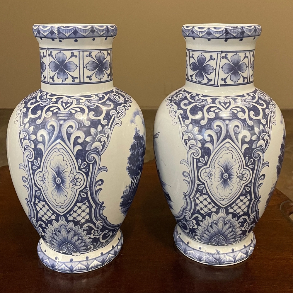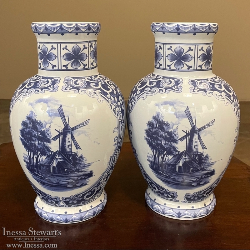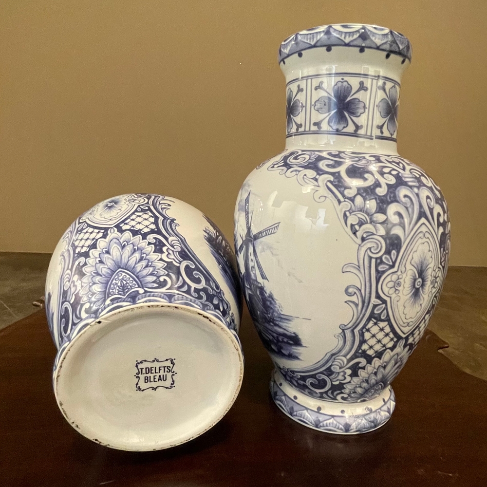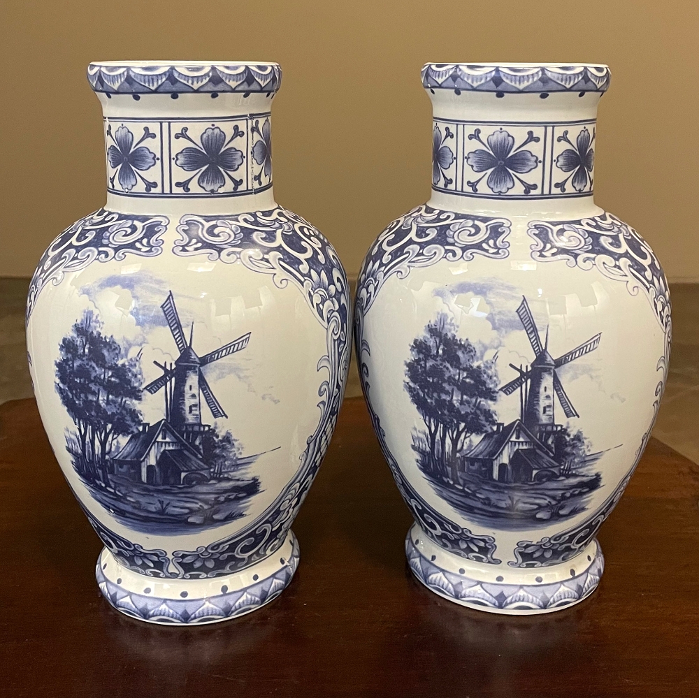 Pair Antique T Delfts Bleu Transferware Vases feature classic windmill scenes on both sides, such that if they are placed in front of a mirror the reflection is just as charming as the front. Ideal as decorative accents on their own, or with floral and foliage arrangements. Repaired hairline crack around rim on one vase, sold as is.