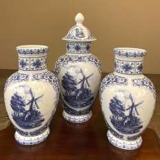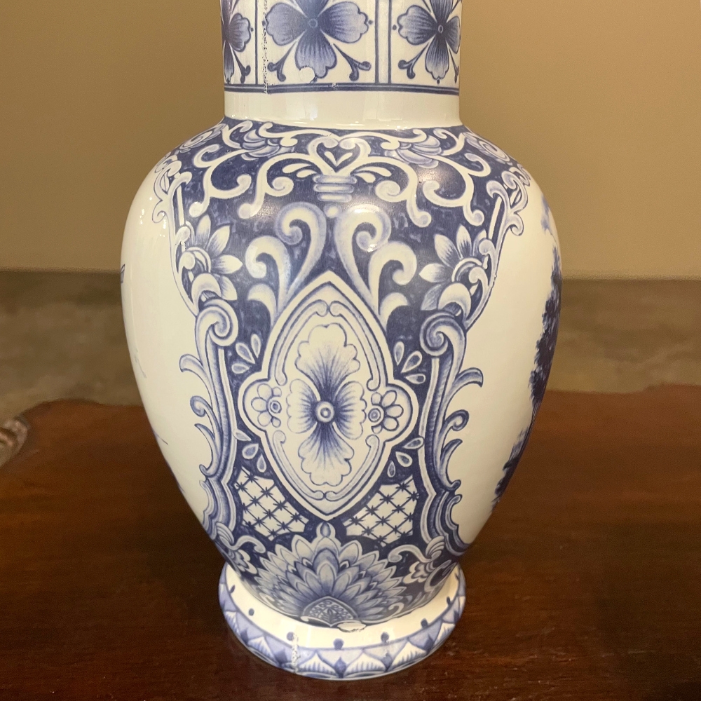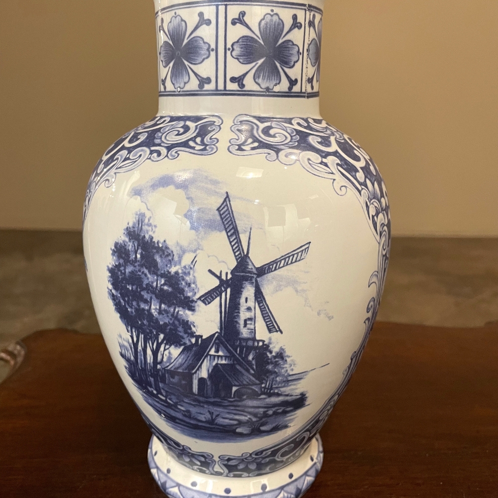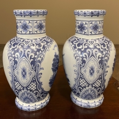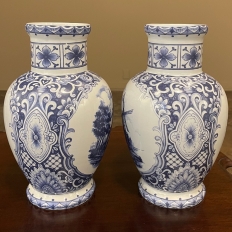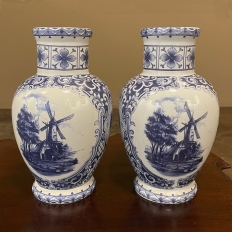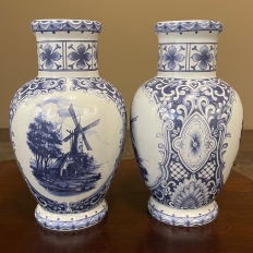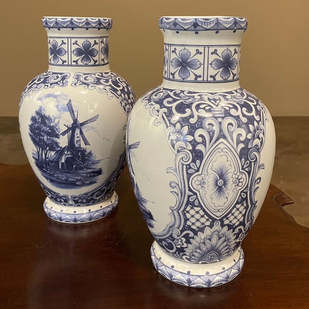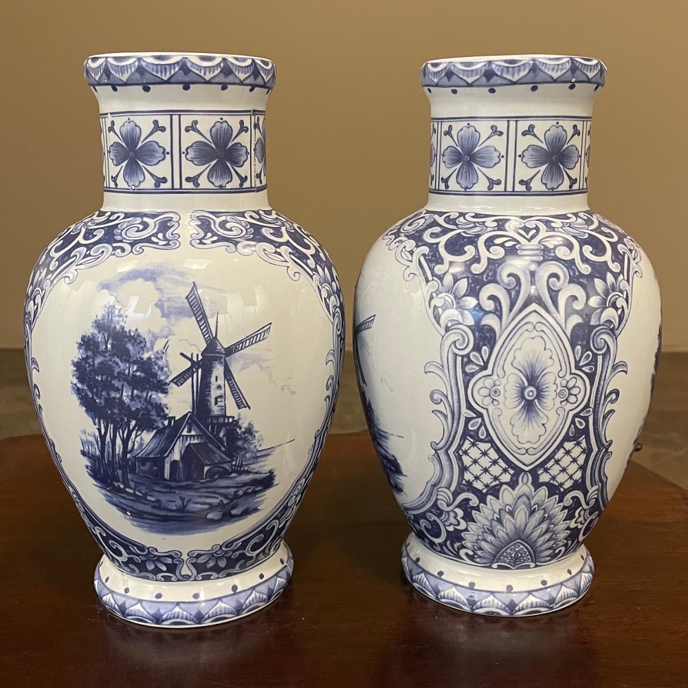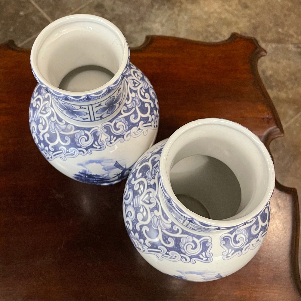 Pair Antique T Delfts Bleu Transferware Vases feature classic windmill scenes on both sides, such that if they are placed in front of a mirror the reflection is just as charming as the front. Ideal as decorative accents on their own, or with floral and foliage arrangements. Repaired hairline crack around rim on one vase, sold as is.