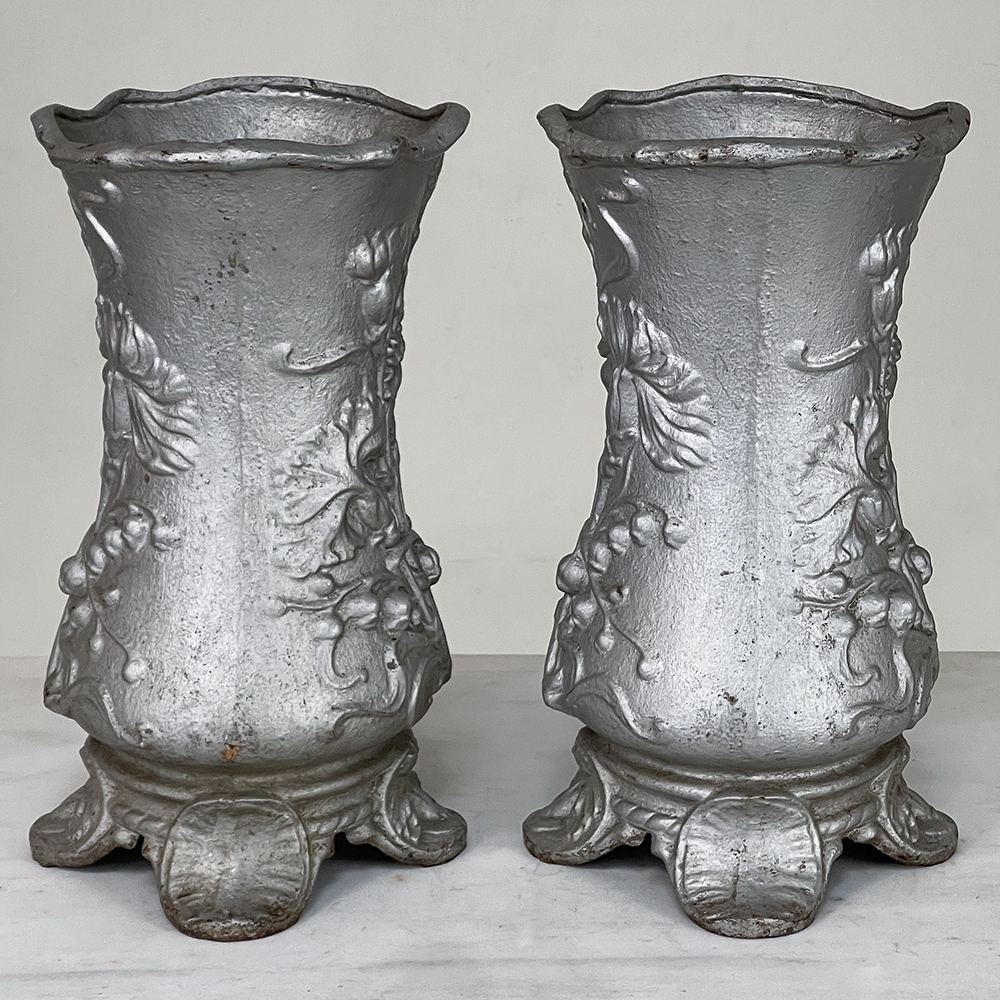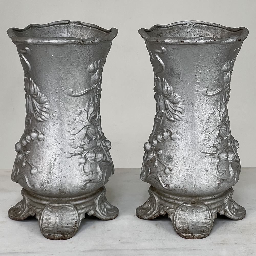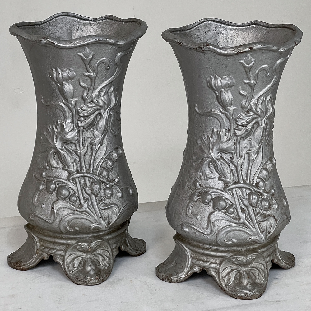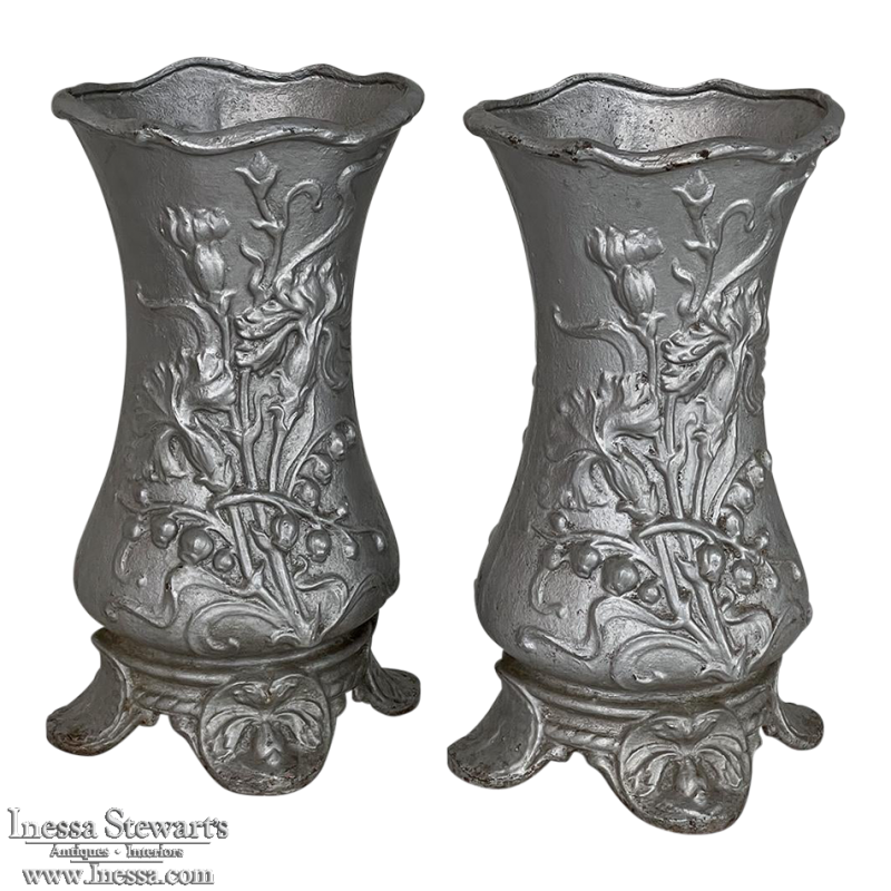 Pair Art Nouveau Cast Iron Painted Jardinieres ~ Urns are ready to add timeless symmetry to your decorating! Hand-cast in solid iron with an exquisite Art Nouveau form and embossed floral design on both sides, they work even in front of a mirror or a window! A hole was thoughtfully drilled in the bottom to allow water to drain, and a silver paint finish was applied to preserve the surface of the iron. The foundry mark can be seen in the photos for those who may wish to attempt to identify the maker. Heavy enough to use as bookends, they're attractive enough to use without any fresh greenery or flowers in place!