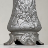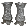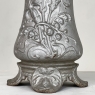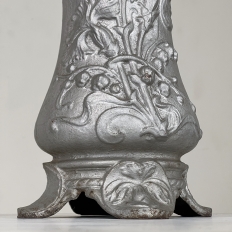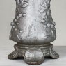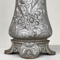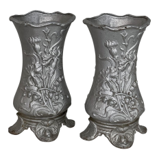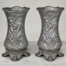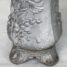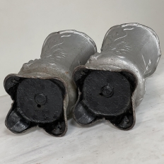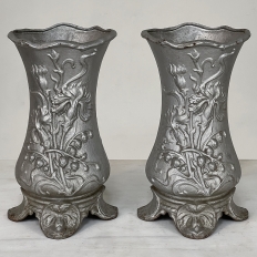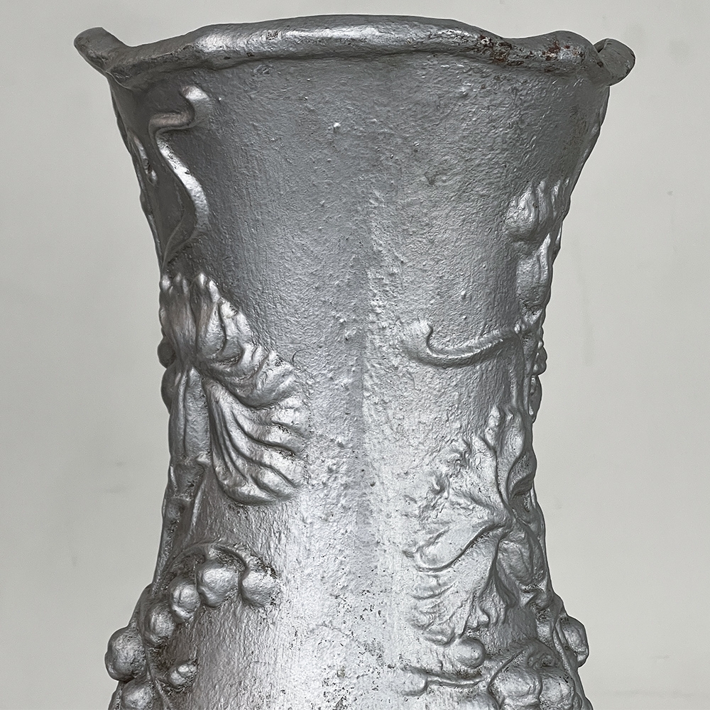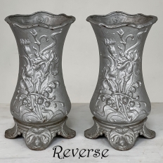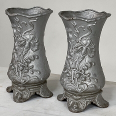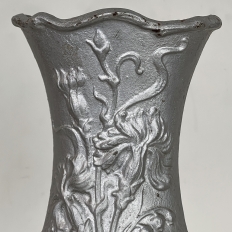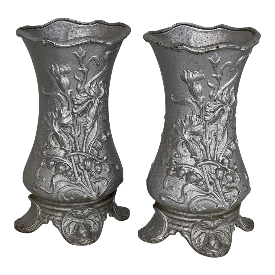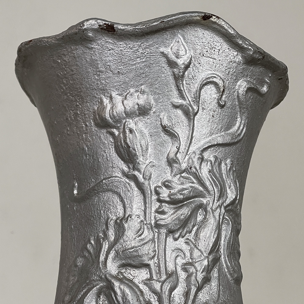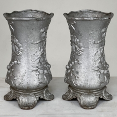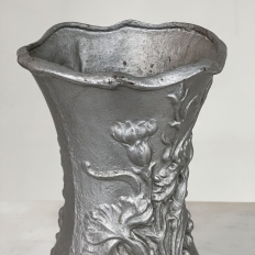 Pair Art Nouveau Cast Iron Painted Jardinieres ~ Urns are ready to add timeless symmetry to your decorating! Hand-cast in solid iron with an exquisite Art Nouveau form and embossed floral design on both sides, they work even in front of a mirror or a window! A hole was thoughtfully drilled in the bottom to allow water to drain, and a silver paint finish was applied to preserve the surface of the iron. The foundry mark can be seen in the photos for those who may wish to attempt to identify the maker. Heavy enough to use as bookends, they're attractive enough to use without any fresh greenery or flowers in place!
