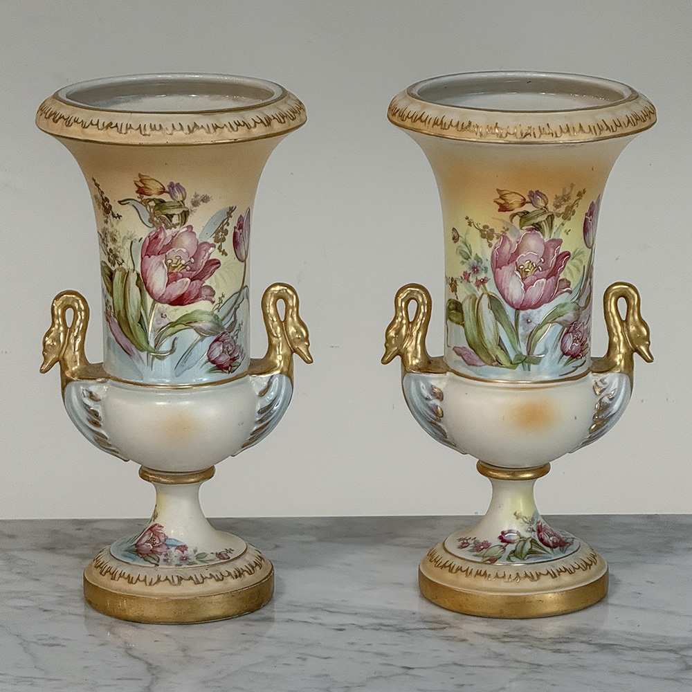 This graceful Pair of Vintage Hand-Painted Bavarian Porcelain Swan-Handle Vases were designed in a refined neoclassical style and beautifully hand-painted with romantic floral decoration. Each vase is adorned with delicate tulip motifs rendered in soft pastel tones against a warm ivory ground, highlighted with subtle gilded accents that frame the rim, base, and decorative details.