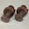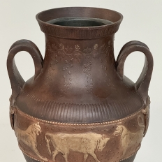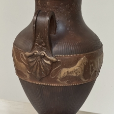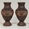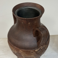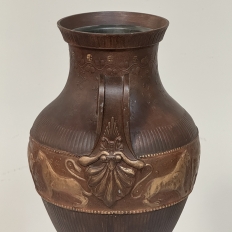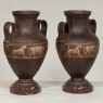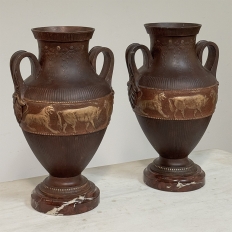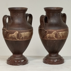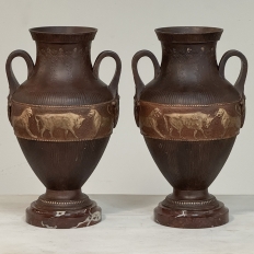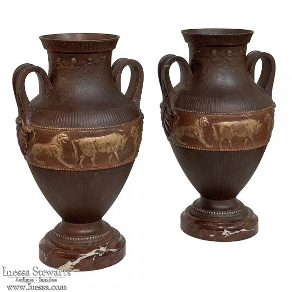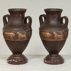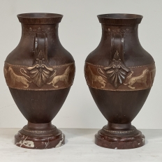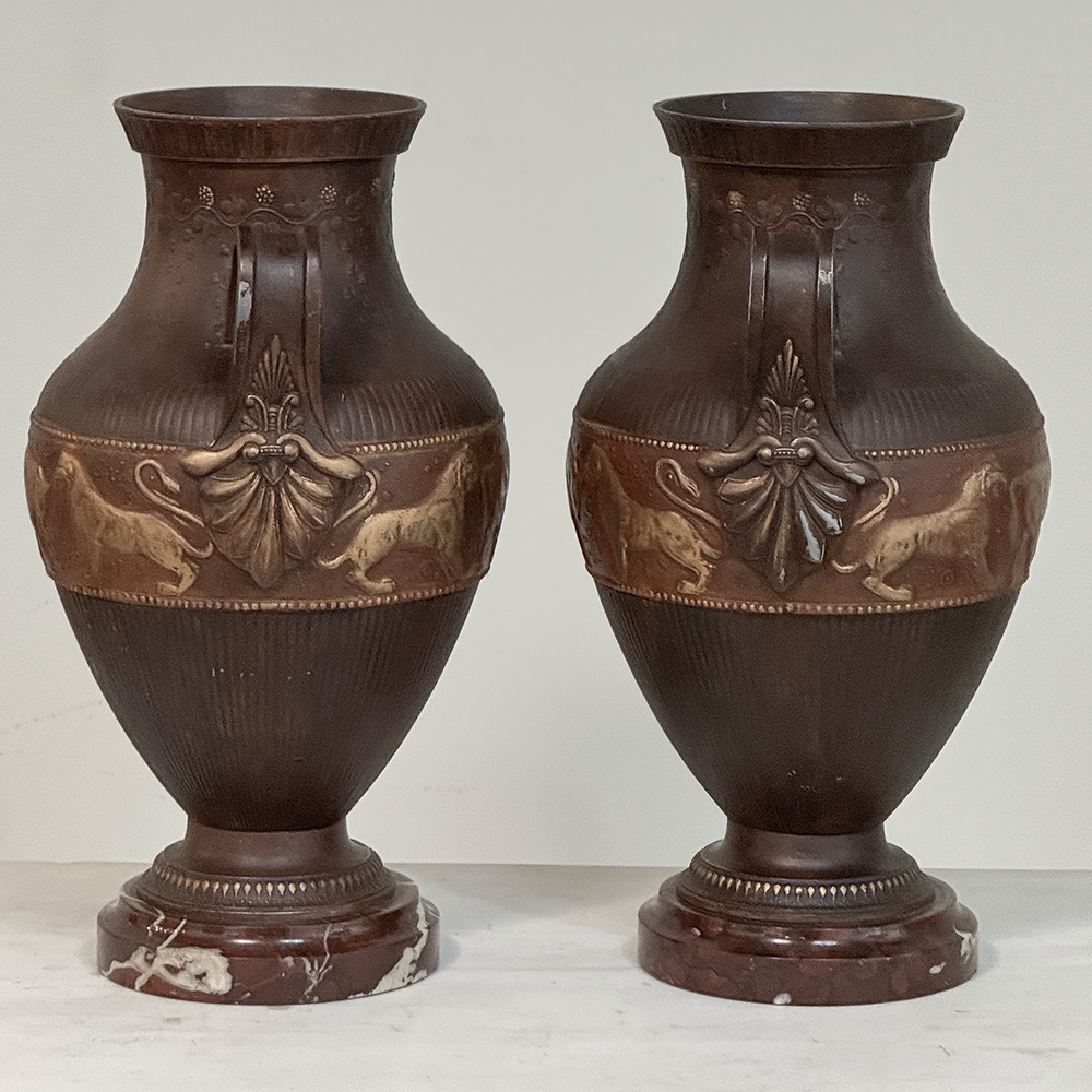 SalePair Grecian Art Deco Spelter Vases on Marble Bases recall the glory days of the Ancient Greeks before the Roman conquest, and feature embossed patterns in tonal variations for highlighting purposes. Timeless amphora shapes are accented by finely veined marble bases which also provide a weighted platform.