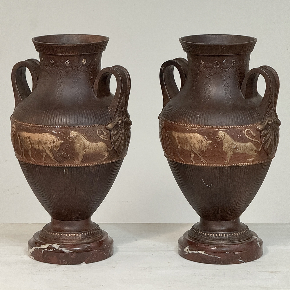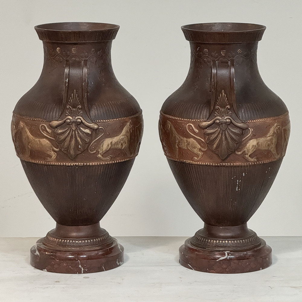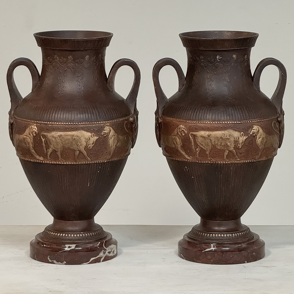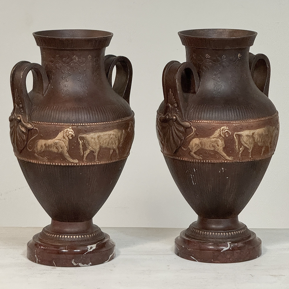 Pair Vases, Art Deco Period in Grecian Style, in Painted Spelter on Marble Bases