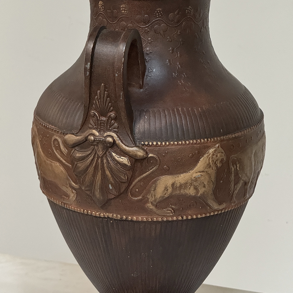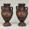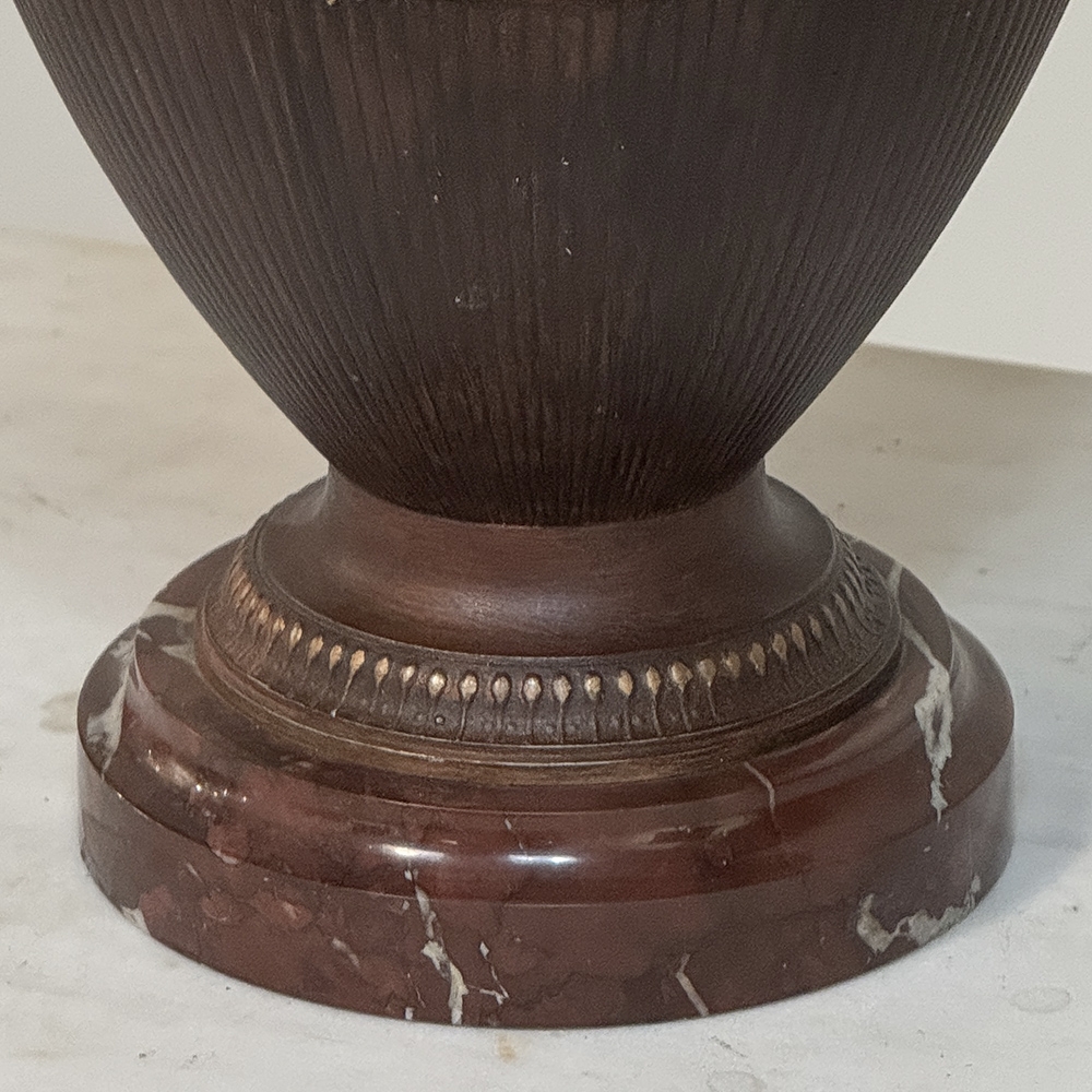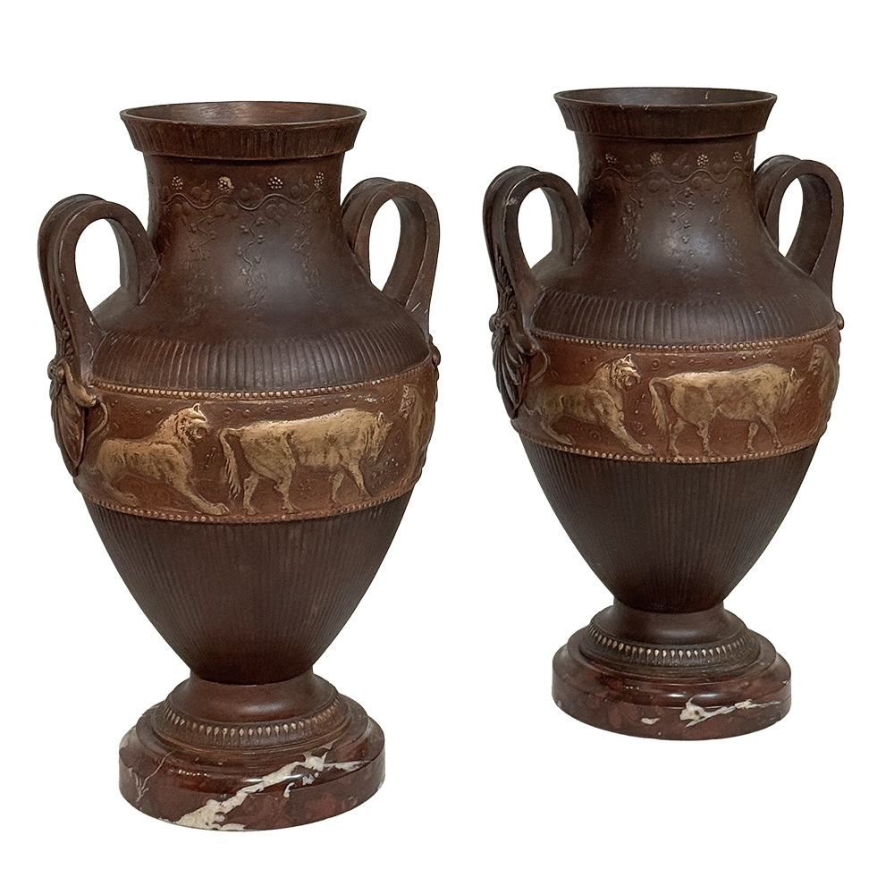 Pair Vases, Art Deco Period in Grecian Style, in Painted Spelter on Marble Bases