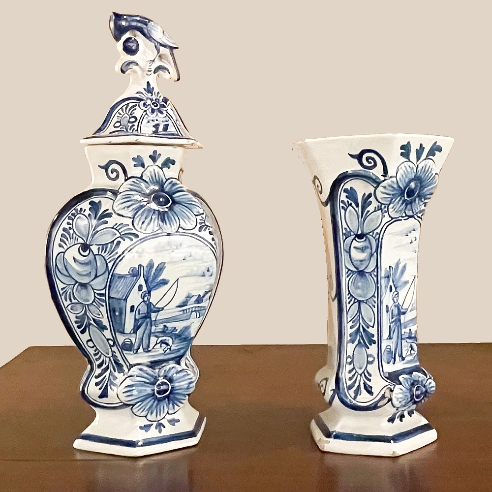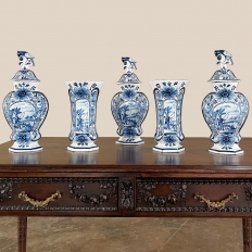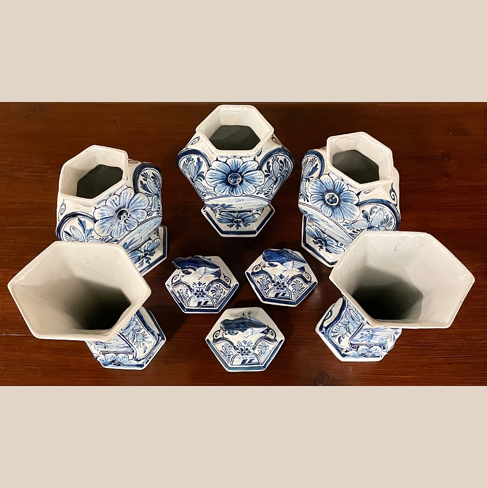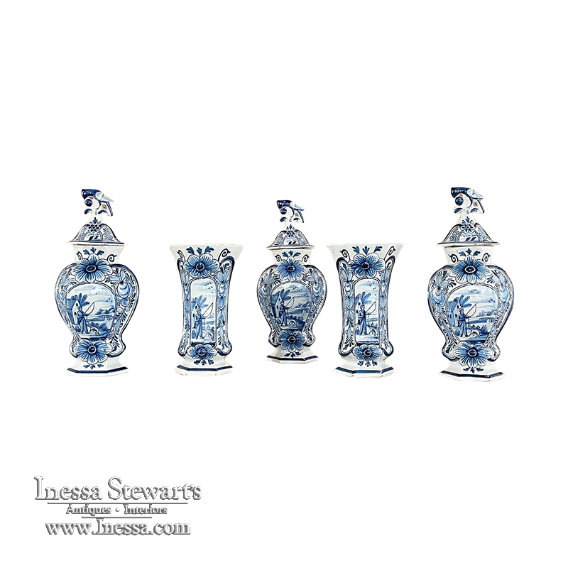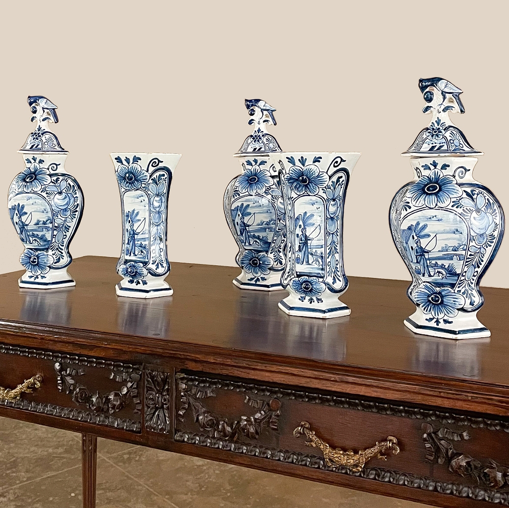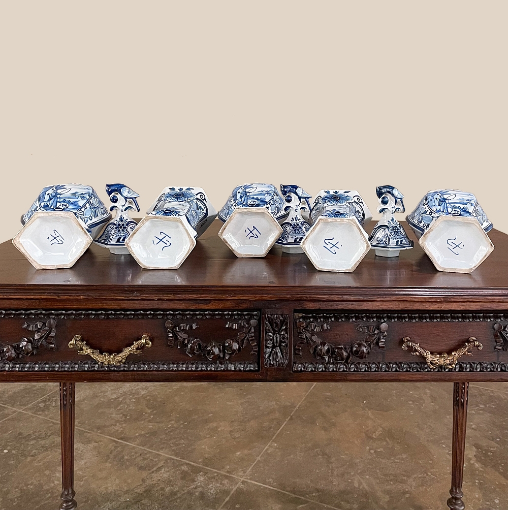 Set of Five 18th Century Hand-Painted Delft Vases including 3 Lidded Urns, also known as a garniture, elevate the blue & white art form to a special place, all having been hand-painted by one artist with matching themes of the persistent angler! The set includes three lidded urns, with birds feeding on fruit adorning the lids, and a shield shaped urn form with flared, hexagonal base. The two vases are more classically designed with convex forms and the same hexagonal bases. The cobalt blue painted embellishment includes multiple shades for a subtle chromatic effect, with florals, foliates and bordering dominating the remainder of the compositions. Even the back sides feature an abstract naturalistic form suggesting water and a young shoot of greenery. The fisherman in each primary image with his trusty canine companion and the idyllic surroundings and background create a wonderful pastoral image.