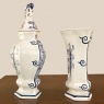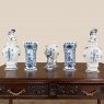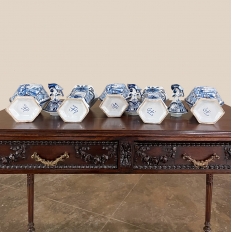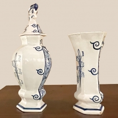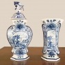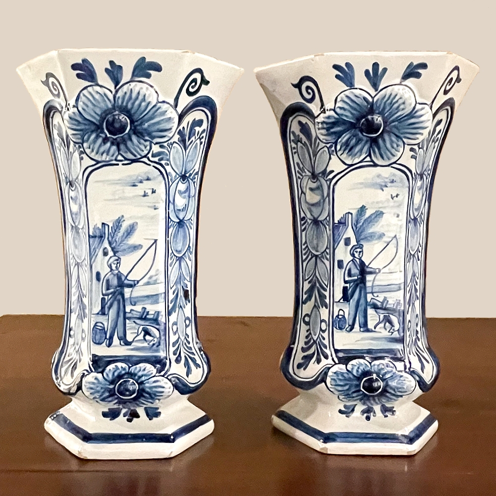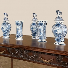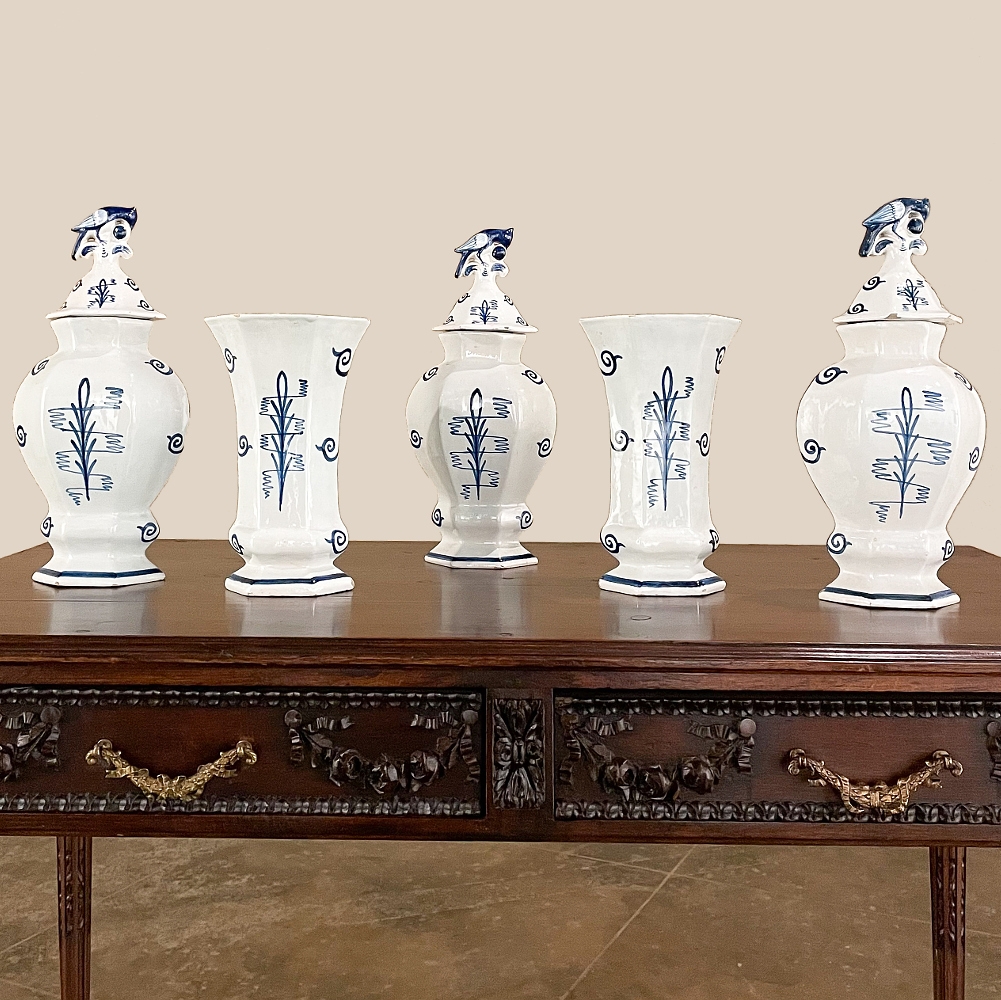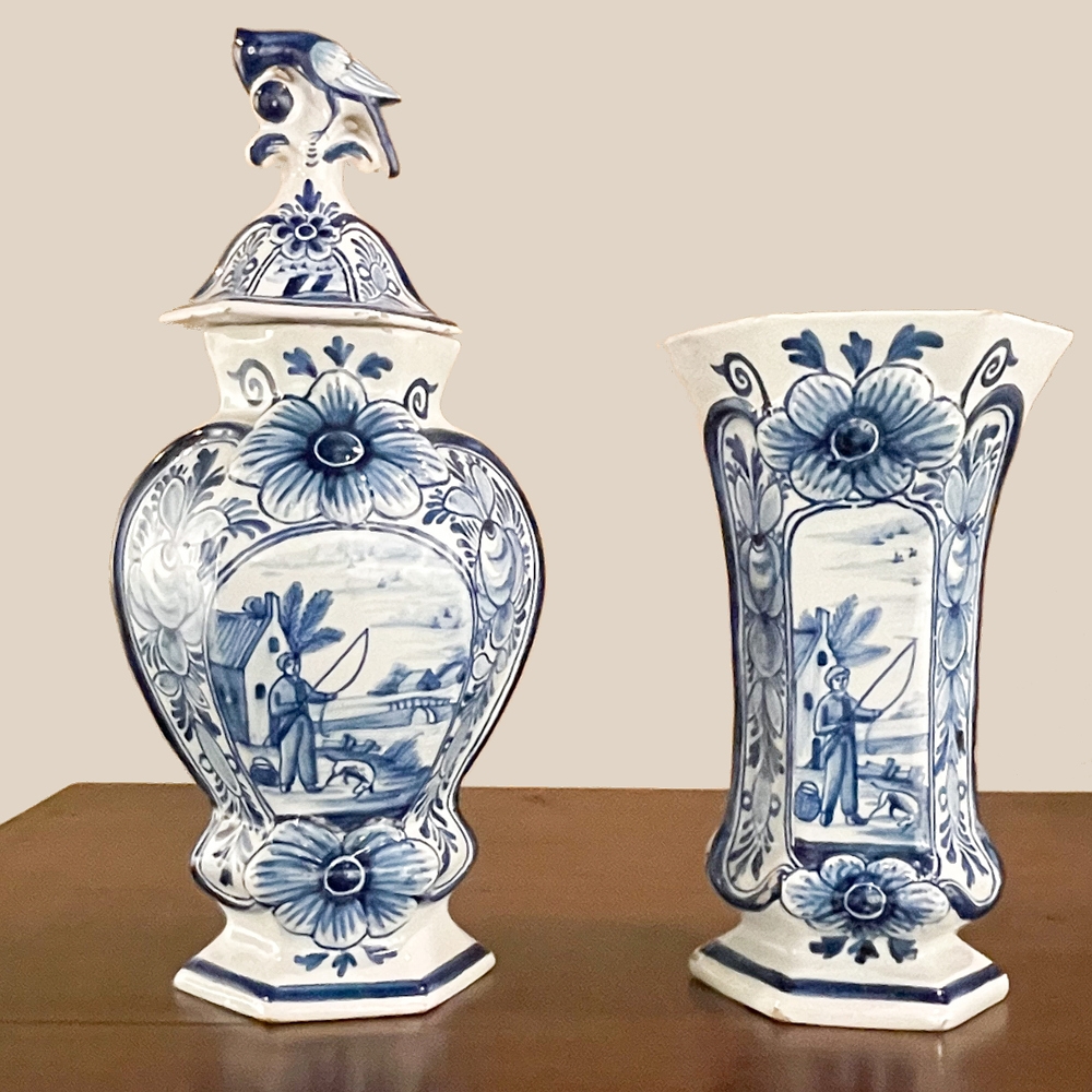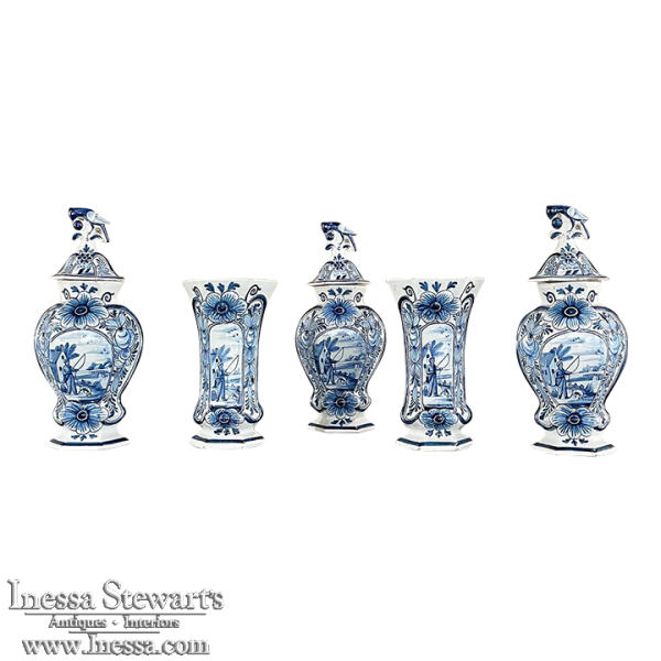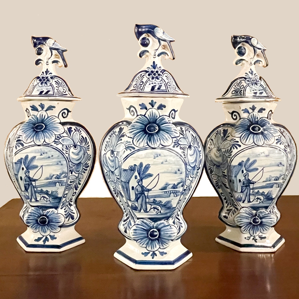 Set of Five 18th Century Hand-Painted Delft Vases including 3 Lidded Urns, also known as a garniture, elevate the blue & white art form to a special place, all having been hand-painted by one artist with matching themes of the persistent angler! The set includes three lidded urns, with birds feeding on fruit adorning the lids, and a shield shaped urn form with flared, hexagonal base. The two vases are more classically designed with convex forms and the same hexagonal bases. The cobalt blue painted embellishment includes multiple shades for a subtle chromatic effect, with florals, foliates and bordering dominating the remainder of the compositions. Even the back sides feature an abstract naturalistic form suggesting water and a young shoot of greenery. The fisherman in each primary image with his trusty canine companion and the idyllic surroundings and background create a wonderful pastoral image.