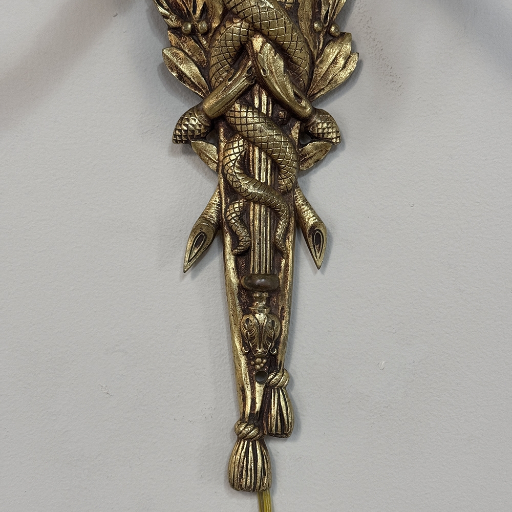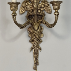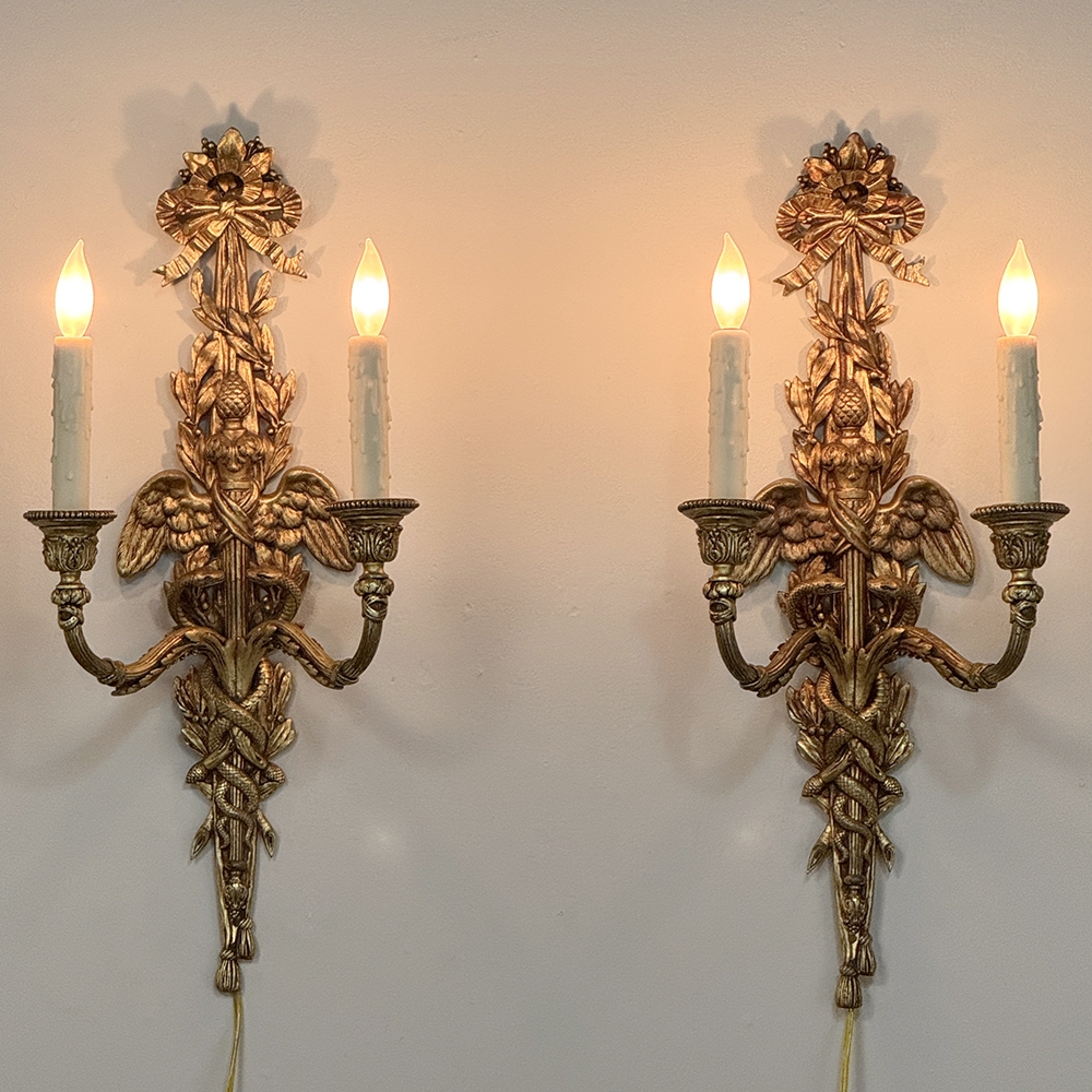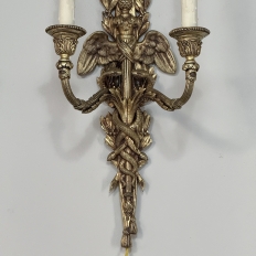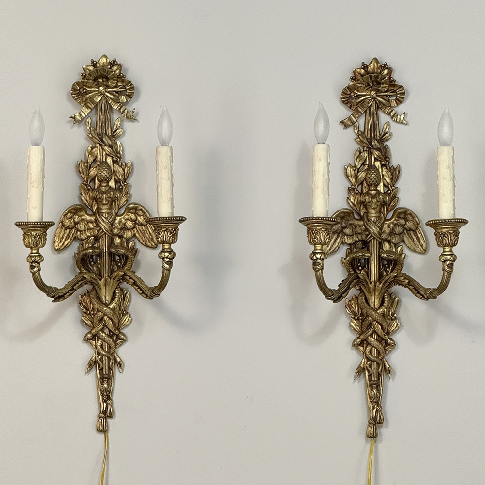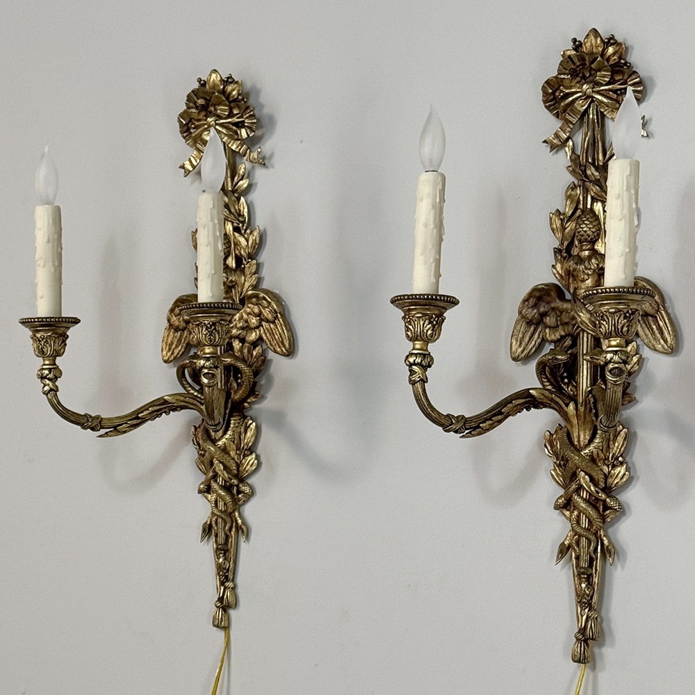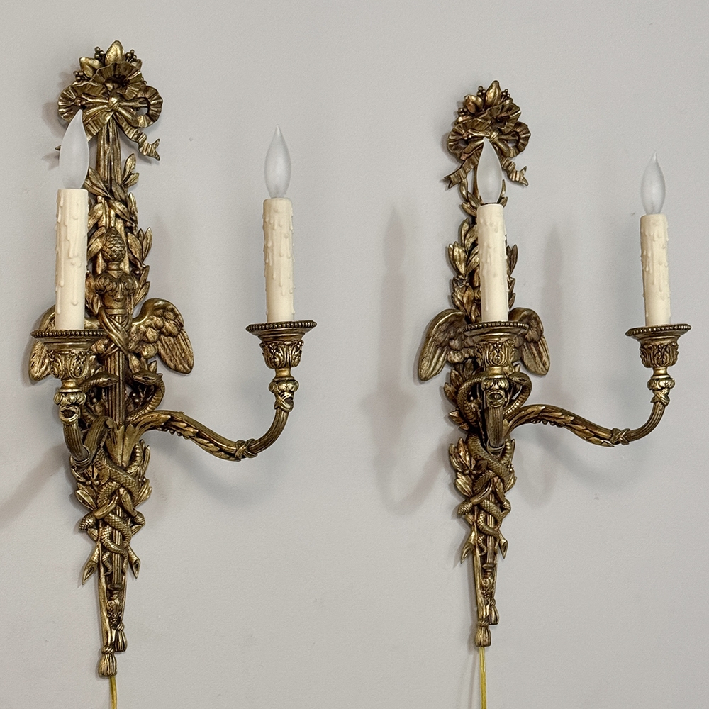 Pair Antique French Louis XVI Bronze Wall Sconces are an exquisite example of the metalsmith's art! Cast in solid bronze, each has achieved a lovely patina over the decades. The detail is astounding, with ribbons, foliates, tassels, and most prominent~ the Staff of Hermes, or as the Romans called him, Mercury. The cadeusus is the symbol of the fluted scepter intertwined with serpents, adopted by the medical community in the United States pretty much by accidental interpretation! Each sconce is mounted with two scrolled, embellished arms and candle holders. One must examine this lovely pair closely to fully appreciate their amazing artistry!