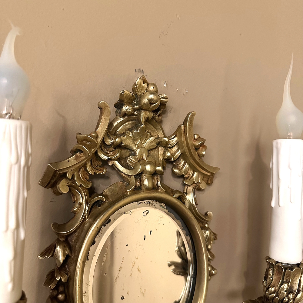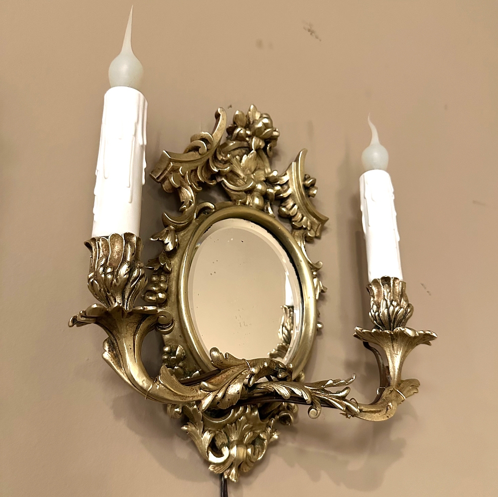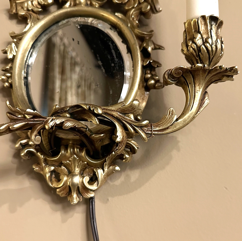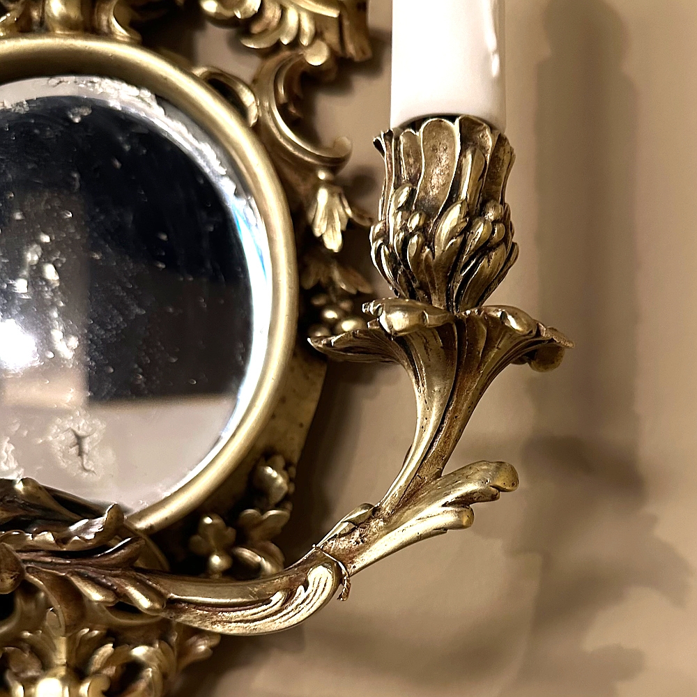 Pair Antique French Louis XVI Bronze Wall Sconces are cast in solid bronze, and each has achieved the beginnings of a lovely patina. The detail is pervasive and extensive, with florals, foliates, grape clusters and shells. Each realistic candlesleeve cover appears over candelabra sized sockets, newly wired to US Standards, and set upon gracefully scrolled and embellished arms which flank the oval beveled mirrors at the center. The design was originally conceived to amplify the light from candles which were precious in days of old. One must examine this lovely pair closely to fully appreciate their amazing artistry!