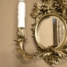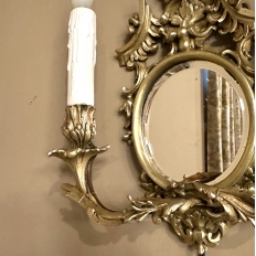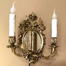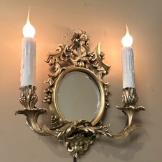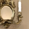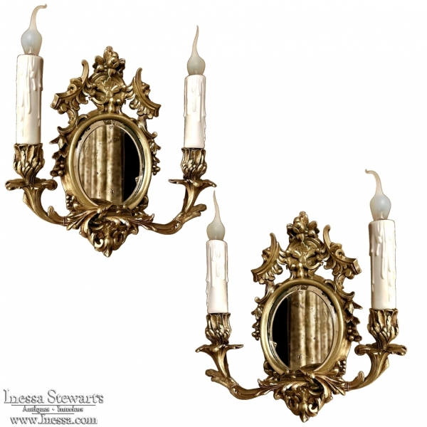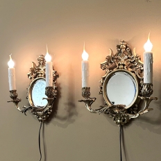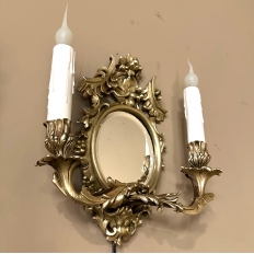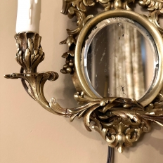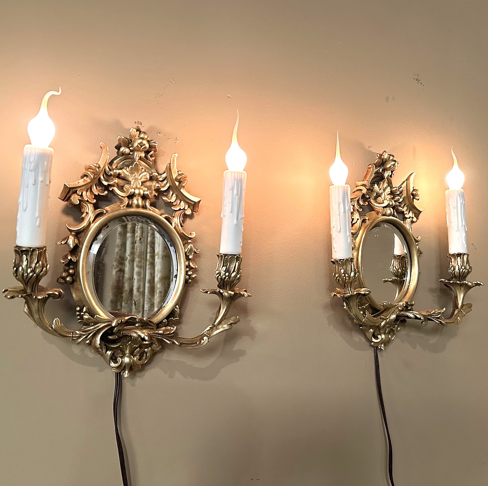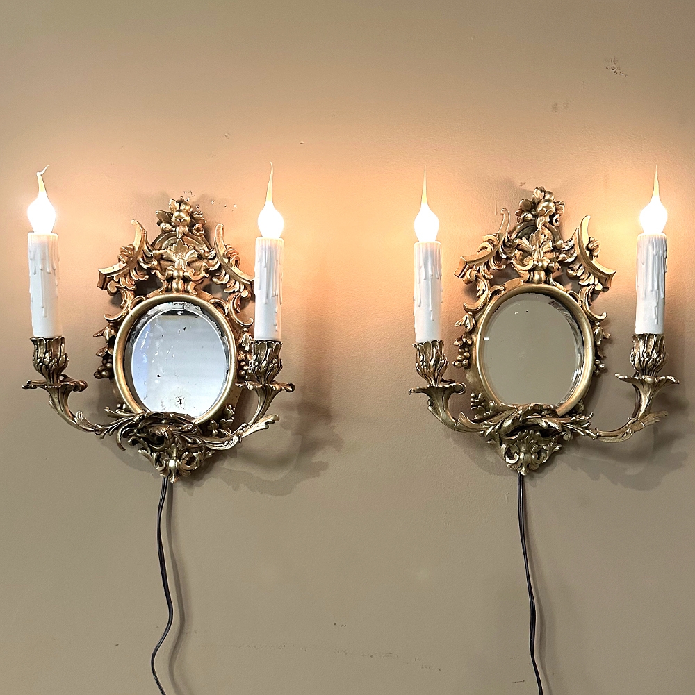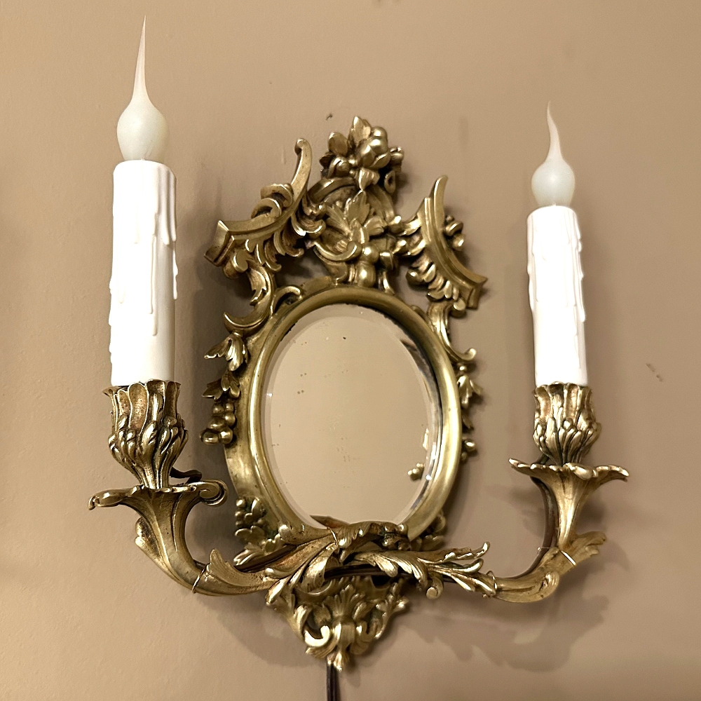 Pair Antique French Louis XVI Bronze Wall Sconces are cast in solid bronze, and each has achieved the beginnings of a lovely patina. The detail is pervasive and extensive, with florals, foliates, grape clusters and shells. Each realistic candlesleeve cover appears over candelabra sized sockets, newly wired to US Standards, and set upon gracefully scrolled and embellished arms which flank the oval beveled mirrors at the center. The design was originally conceived to amplify the light from candles which were precious in days of old. One must examine this lovely pair closely to fully appreciate their amazing artistry!