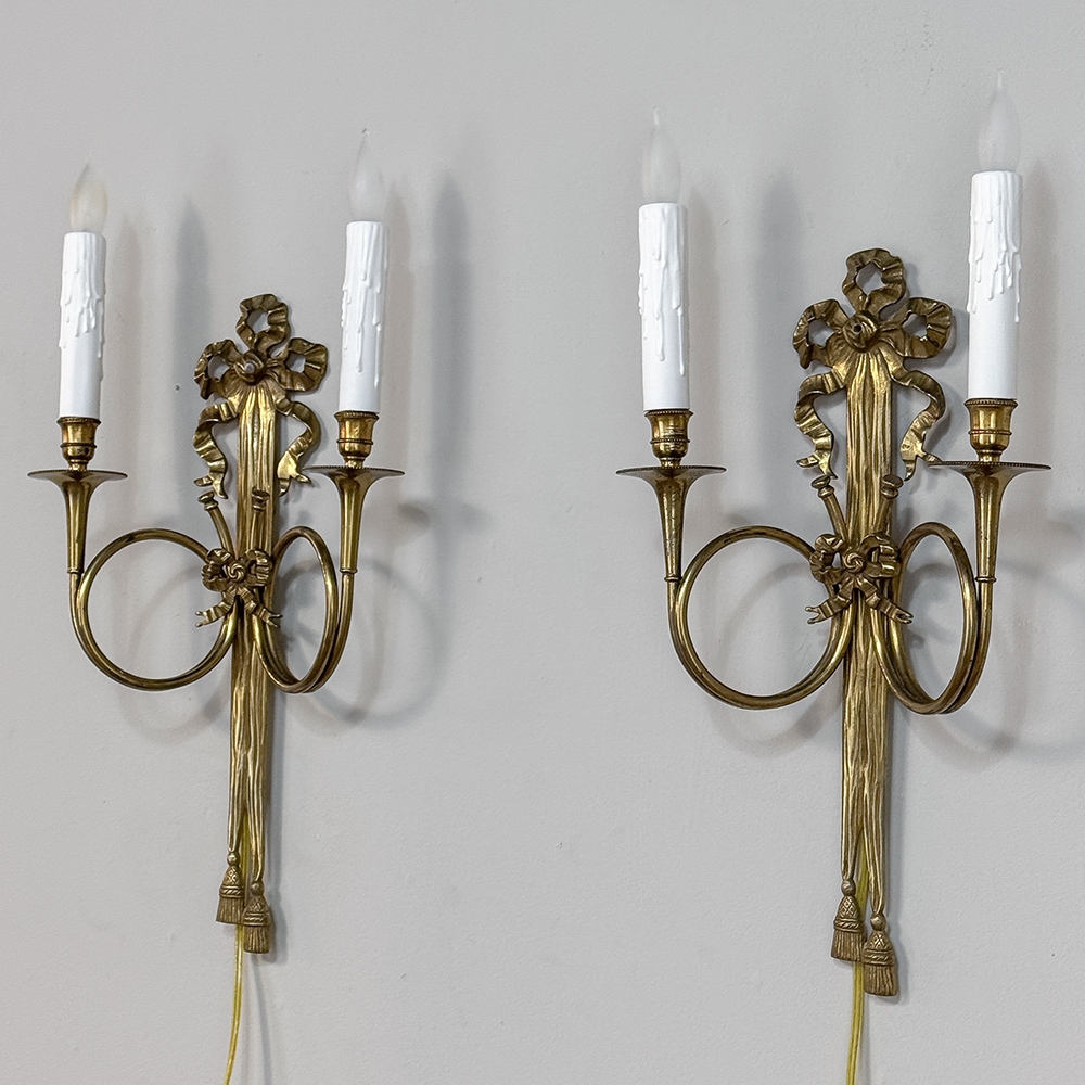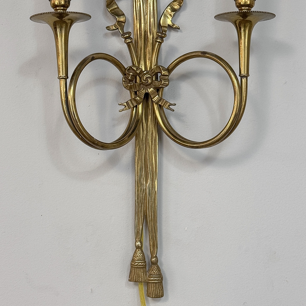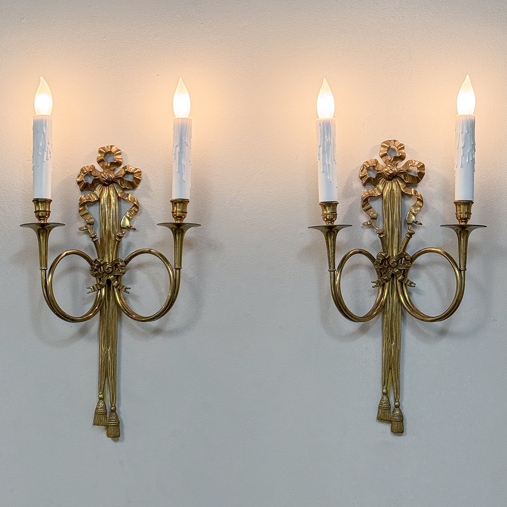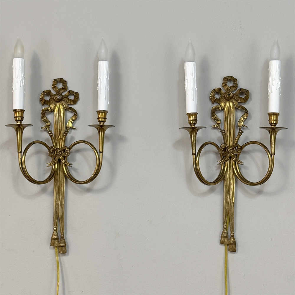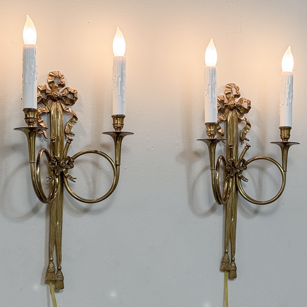 Pair Antique French Louis XVI Neoclassical Cast Brass Wall Sconces are the ideal choice for creating a special visual effect! Each is designed with a pair of French hunting horns forming the mounts for the bobeches which hold the candlesleeves, which are finely crafted to look as realistic as possible. The horns are mounted on ribbon with tassels ~ all cast in solid brass, with a bow appearing at the top. Newly and professionally electrified to US Standards, with realistic heat-resistant candlesleeve covers, all included in the price!