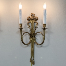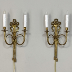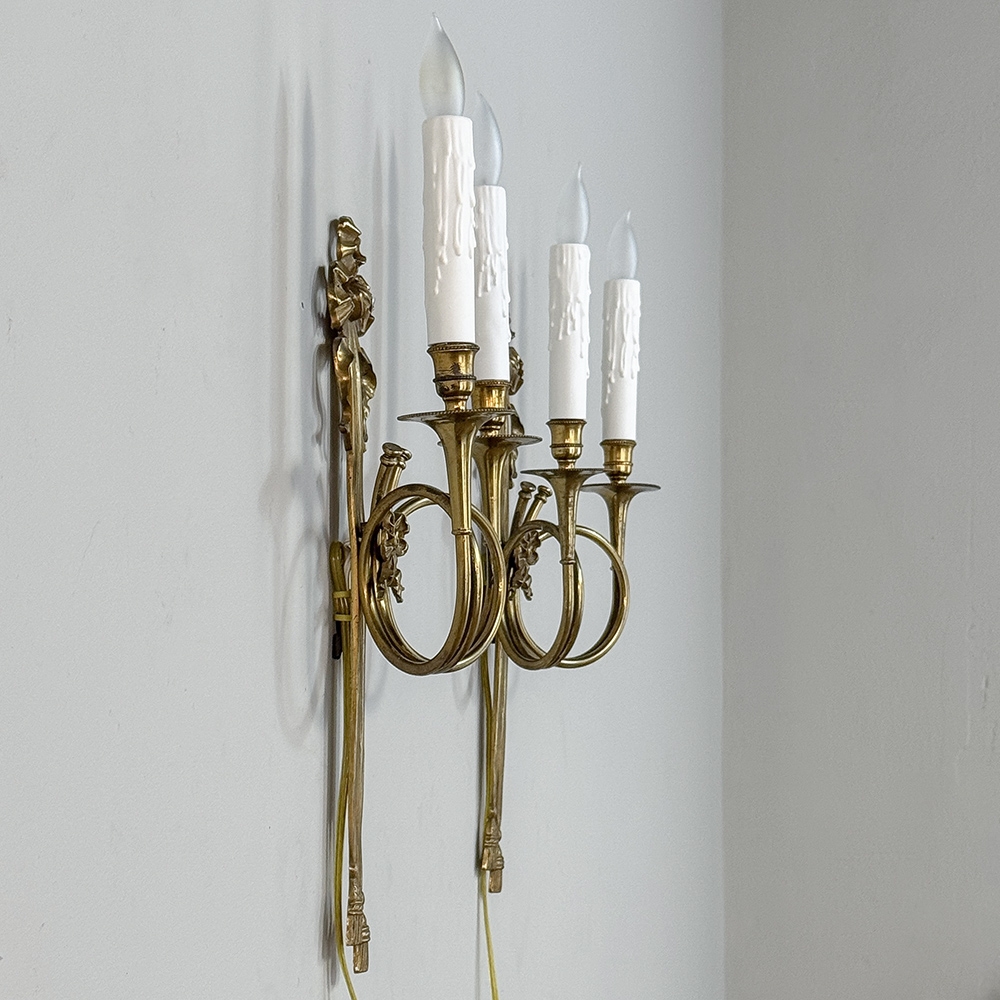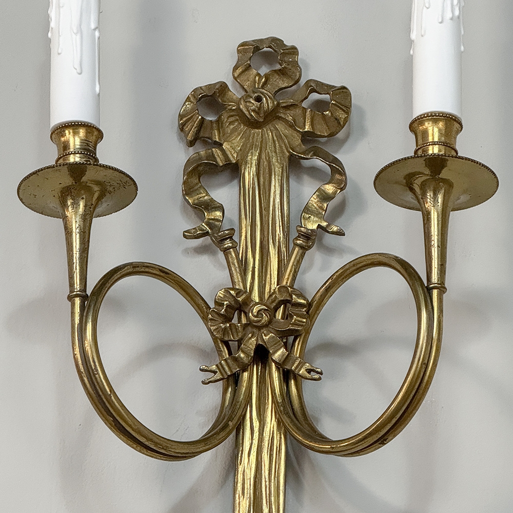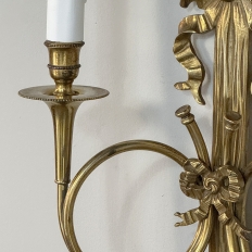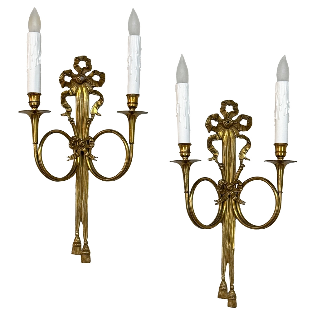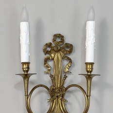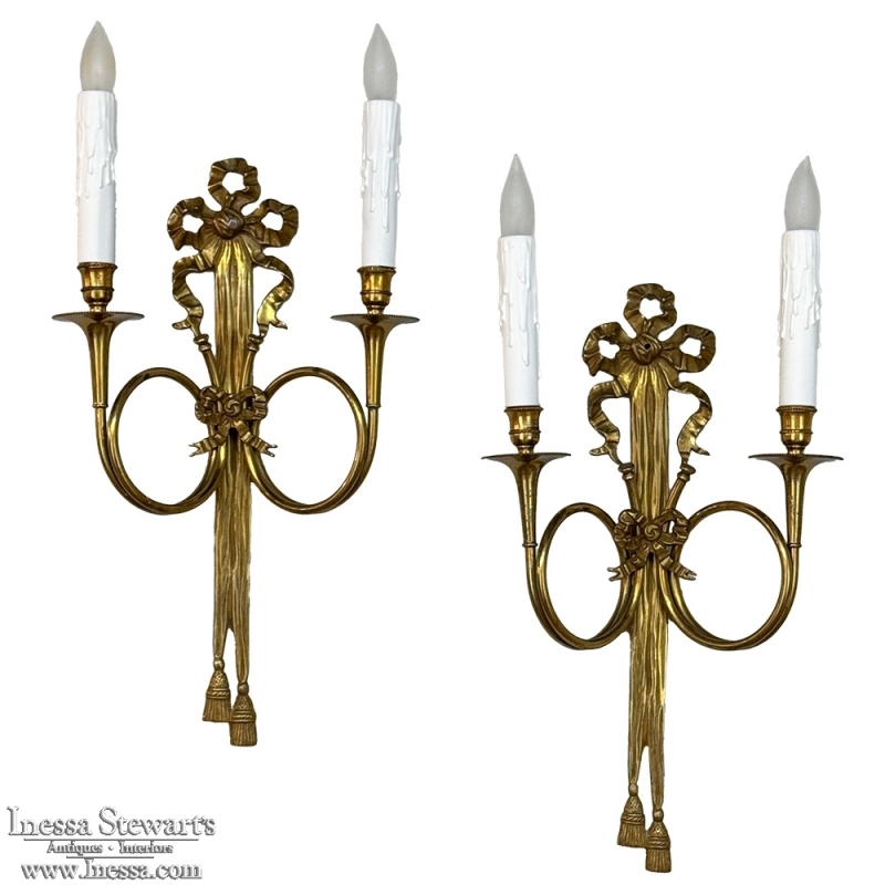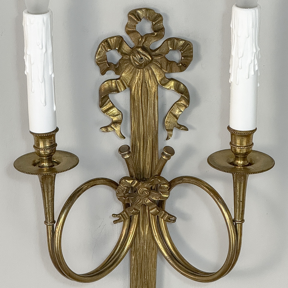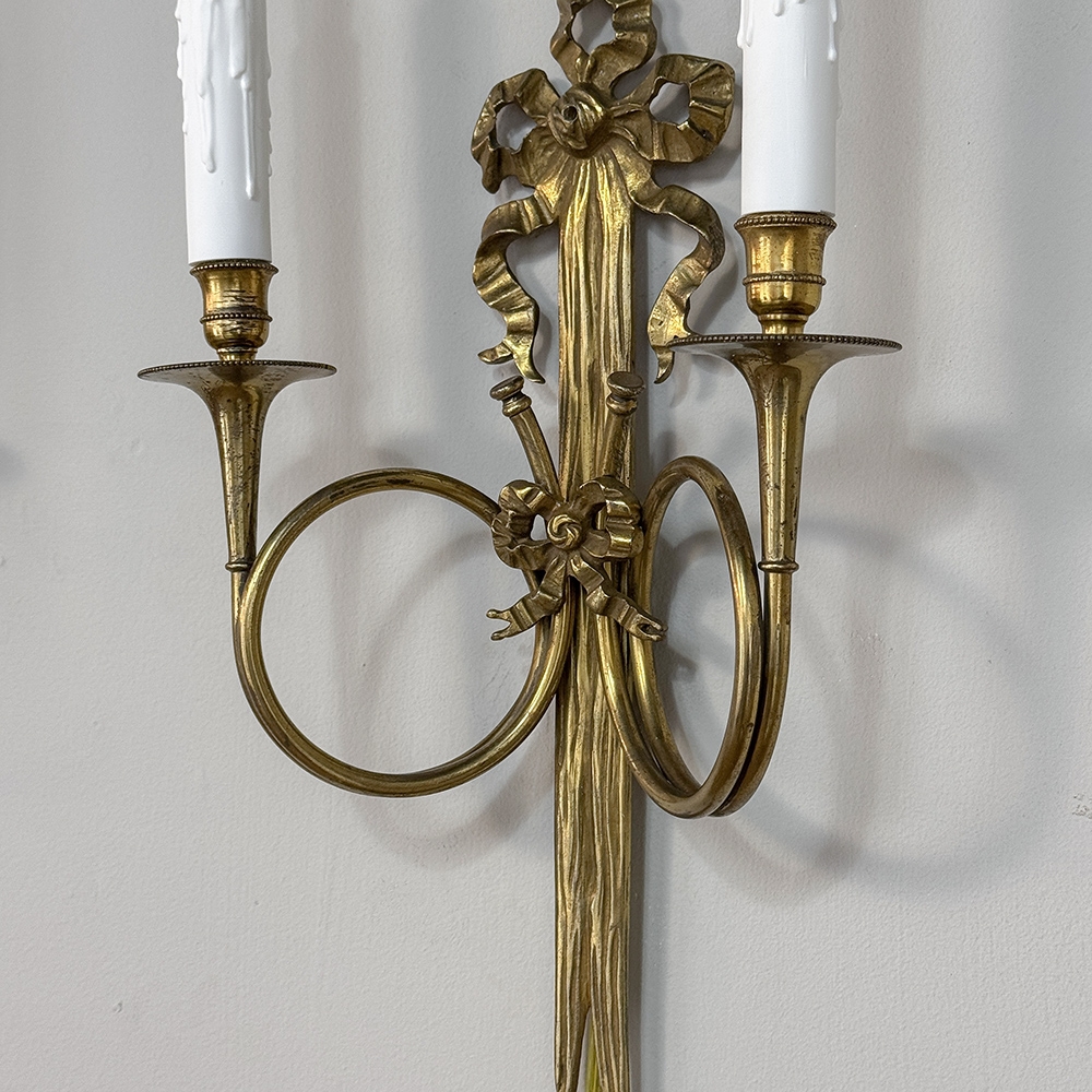 Pair Antique French Louis XVI Neoclassical Cast Brass Wall Sconces are the ideal choice for creating a special visual effect! Each is designed with a pair of French hunting horns forming the mounts for the bobeches which hold the candlesleeves, which are finely crafted to look as realistic as possible. The horns are mounted on ribbon with tassels ~ all cast in solid brass, with a bow appearing at the top. Newly and professionally electrified to US Standards, with realistic heat-resistant candlesleeve covers, all included in the price!