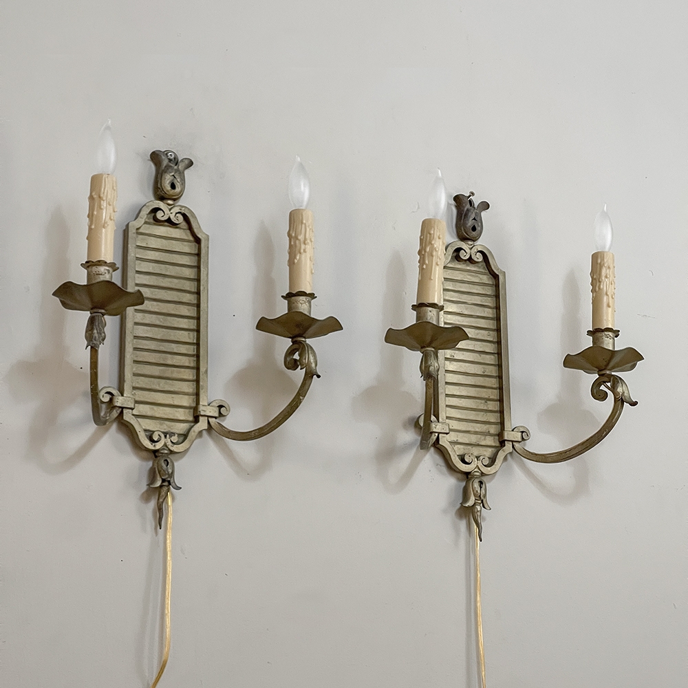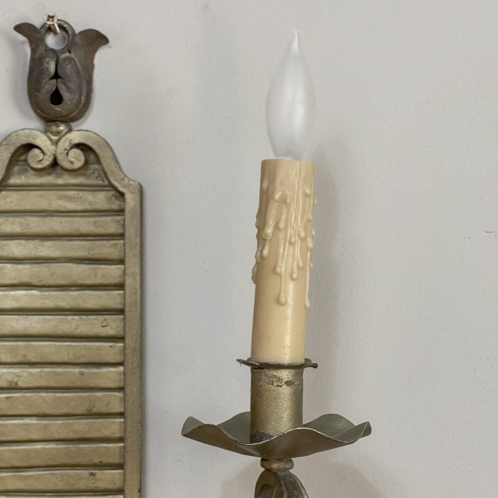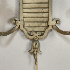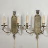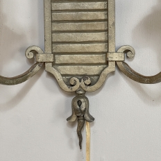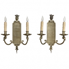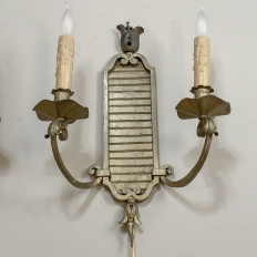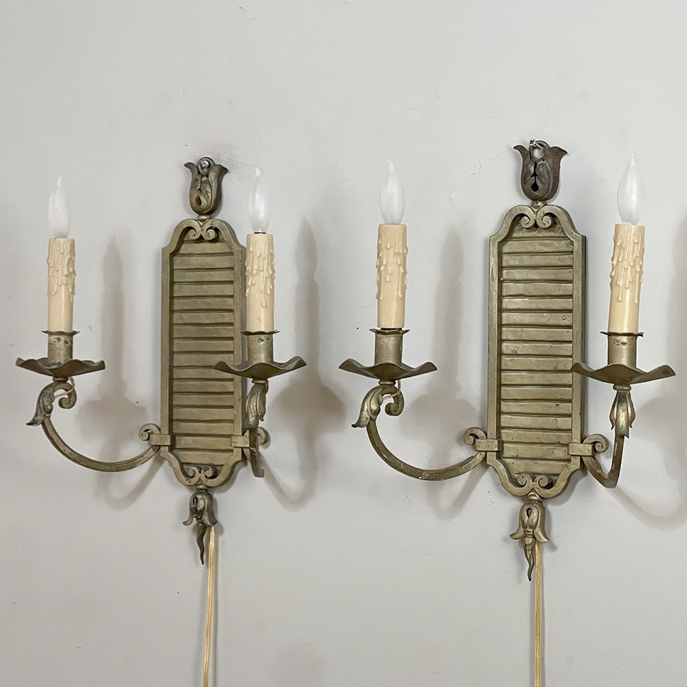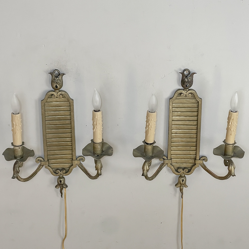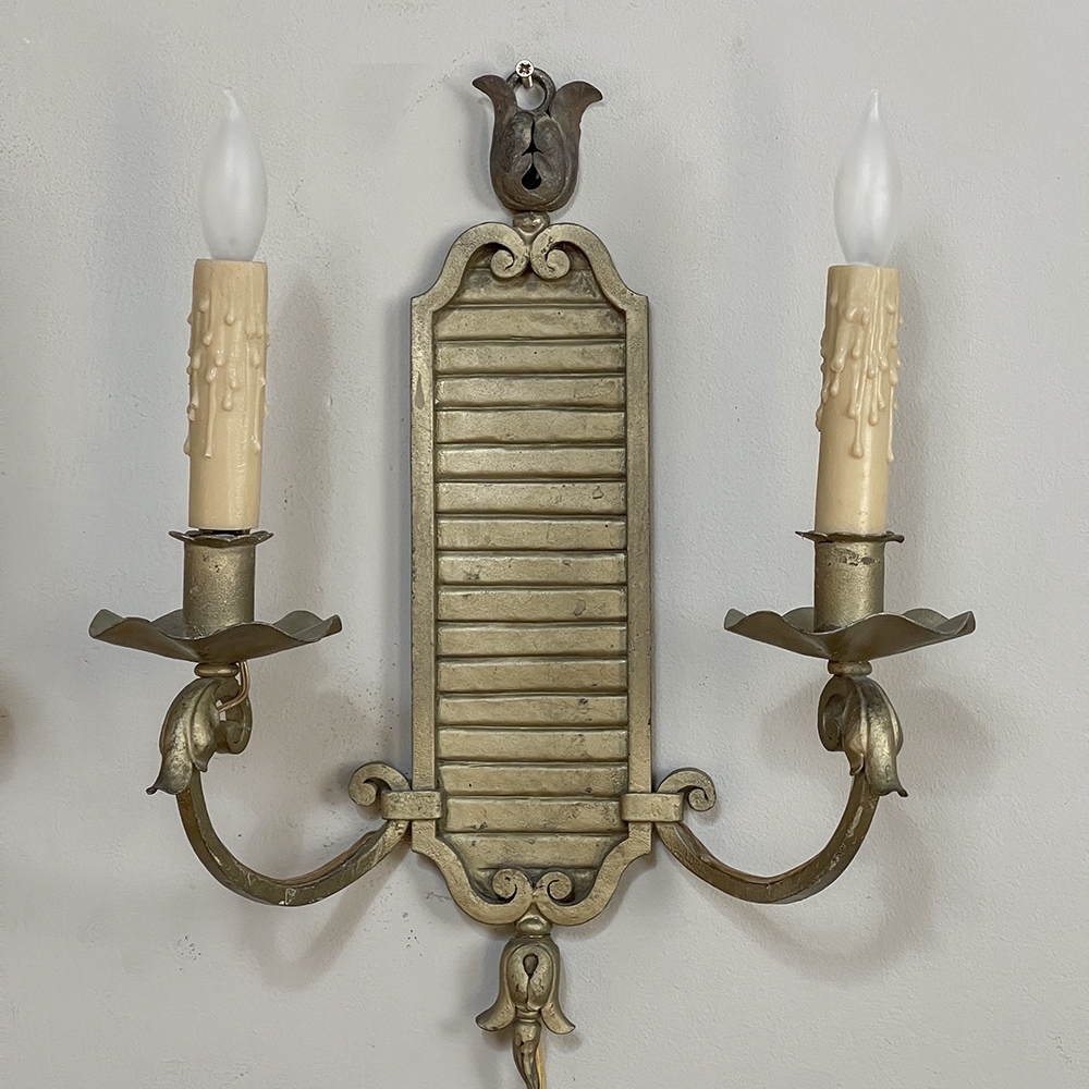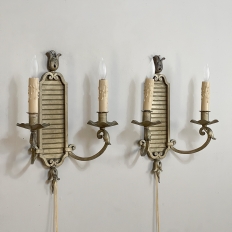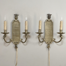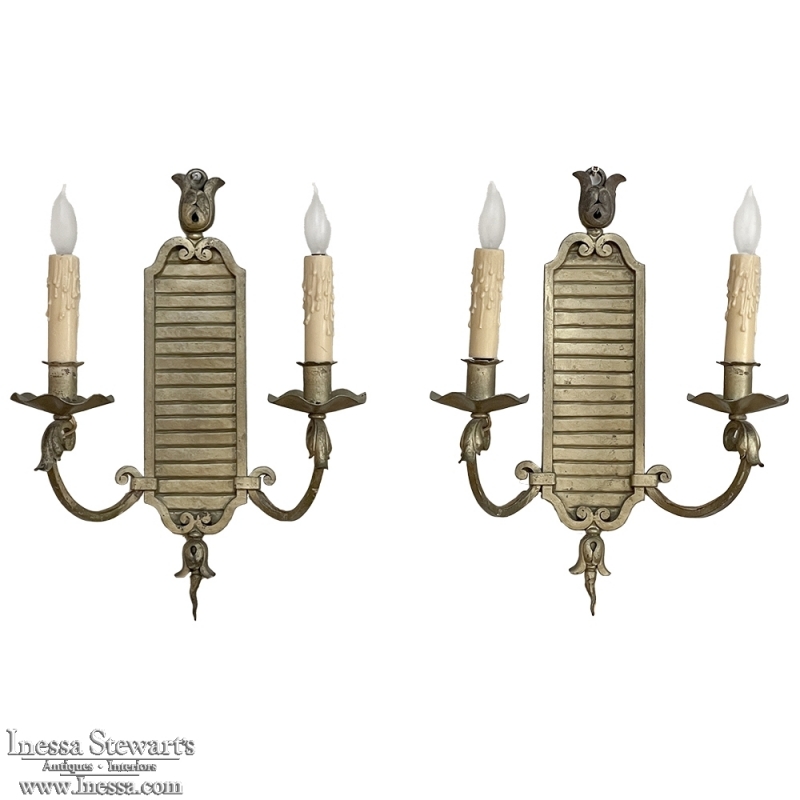 SalePair Italian Antique Bronze Neoclassical Electrified Wall Sconces feature a tailored design that presents a less formal look, yet still provides an understated elegance that will work wonders for illuminating any room! The framed plaque backdrop features louvers and scrolls above and below, with floret accents where the scrolls meet. A pair of arms reach out at angles to terminate in a scroll with an acanthus foliate supporting the pair of pie crust style bobeches upon which the chandelles are mounted, newly electrified with standard wiring and fitted with realistic looking candlesleeve covers that won't melt.