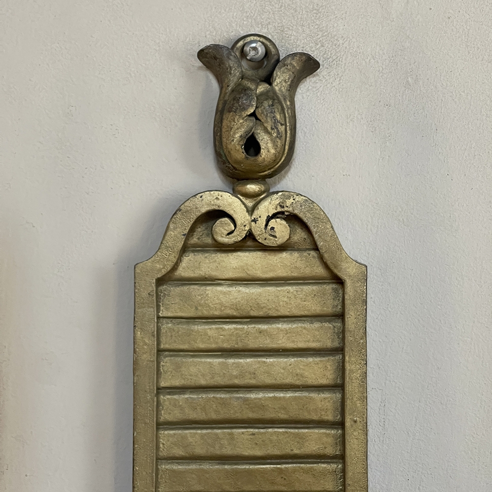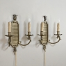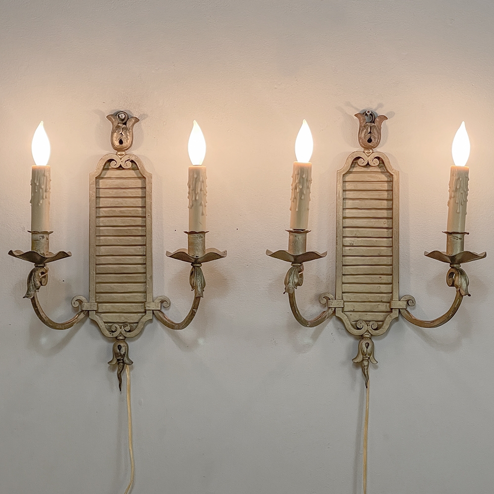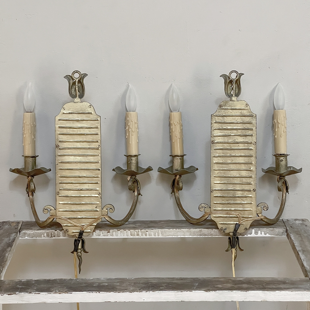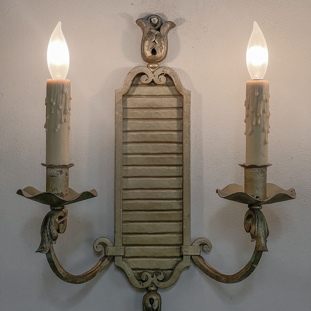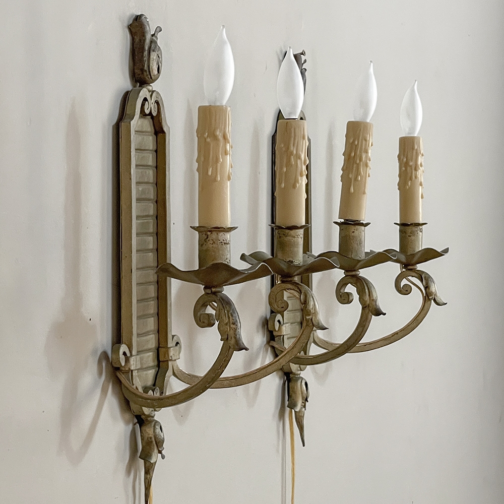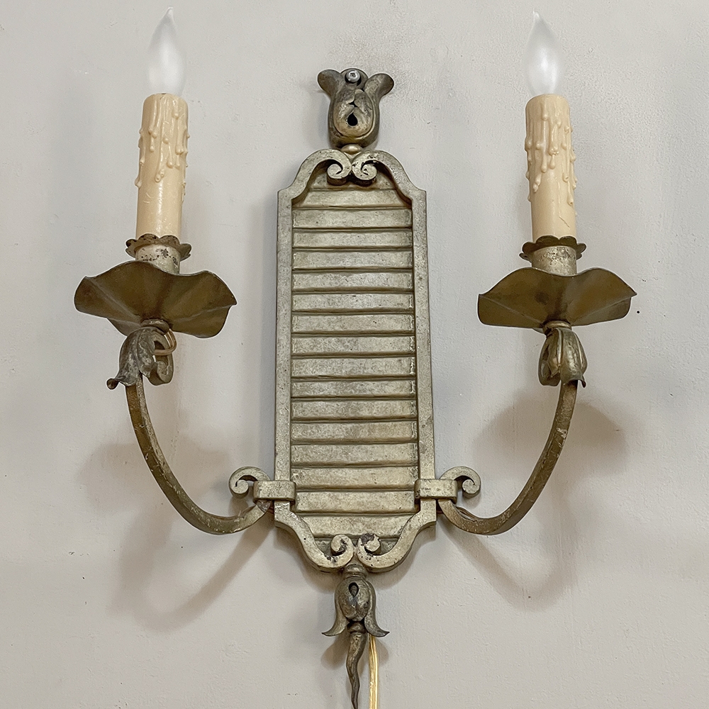 SalePair Italian Antique Bronze Neoclassical Electrified Wall Sconces feature a tailored design that presents a less formal look, yet still provides an understated elegance that will work wonders for illuminating any room! The framed plaque backdrop features louvers and scrolls above and below, with floret accents where the scrolls meet. A pair of arms reach out at angles to terminate in a scroll with an acanthus foliate supporting the pair of pie crust style bobeches upon which the chandelles are mounted, newly electrified with standard wiring and fitted with realistic looking candlesleeve covers that won't melt.