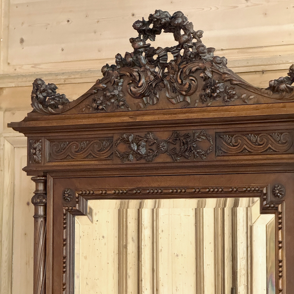 The armoire rises a majestic 101 inches and is topped with an incredibly sculpted crown depicting an archer's bow form, en arbalette, centered with a wreath of roses and wildflowers held together with ribbon and accented with acanthus plumes, which continue outward to the corners with graceful flourishes. The bonnet features bas relief carvings complementing the crown flanked by Greek wave. Underneath, a full length hand-beveled mirror graces the door, surrounded by molding trim and rosettes and flanked on each corner by tapered, spiral fluted and carved columns leading all the way down to the full width drawer base fitted with cast brass ring pulls. The bed accommodates a full mattress, but can be customized to accept queen (contact 214-742-5800 for details). The headboard features the same carved detail on a wider scale as found on the top of the armoire. Matching tapered, spiral fluted and carved columns appear on every corner, with the footboard a masterpiece of full relief sculpture depicting a wreath of roses and rose garlands with ribbon, all set in a double frame. Even the rails and apron are adorned with spiral ribbon and acanthus rosettes! The nightstand sports a more tailored framework, yet still features a nicely carved crown above the backsplash which overlooks luxuriously veined marble. A drawer and cabinet with porcelain insert combine with the lower display shelf for added utility, the latter of which is defined by four tapered, spiral fluted and carved columns. Lastly, the commode follows suit with spiral ribbon trim defining the three full width drawers and the two lingerie drawers, all fitted with cast brass ring pulls. On each corner appear tapered, spiral fluted and carved columns. On top, beveled and luxuriously veined marble provides a carefree yet elegant surface.