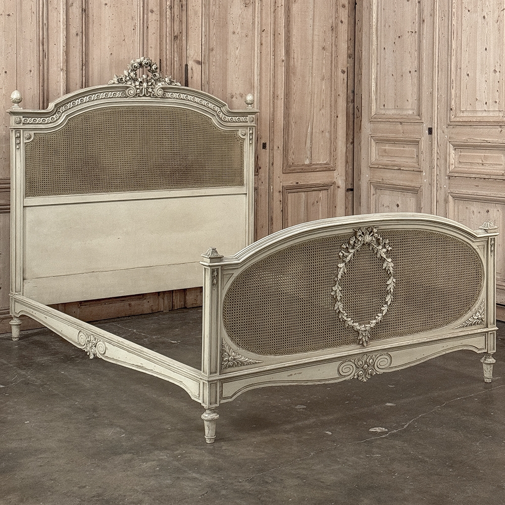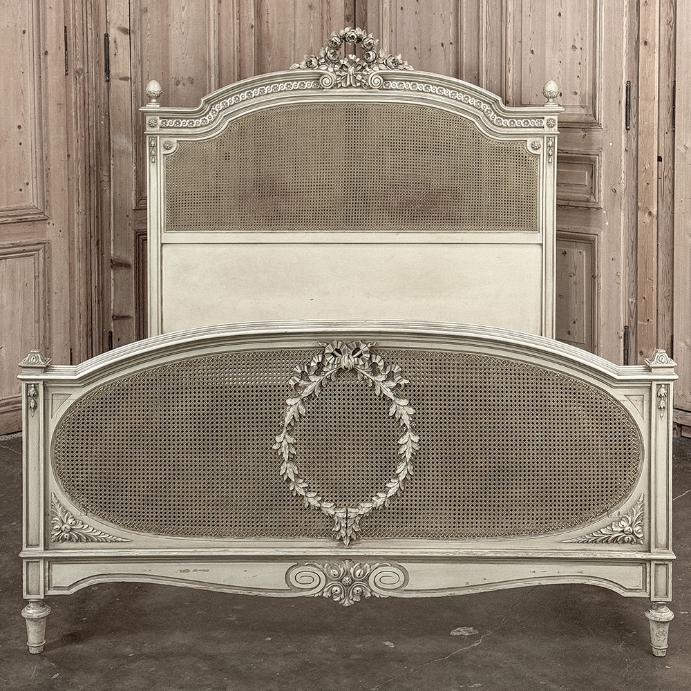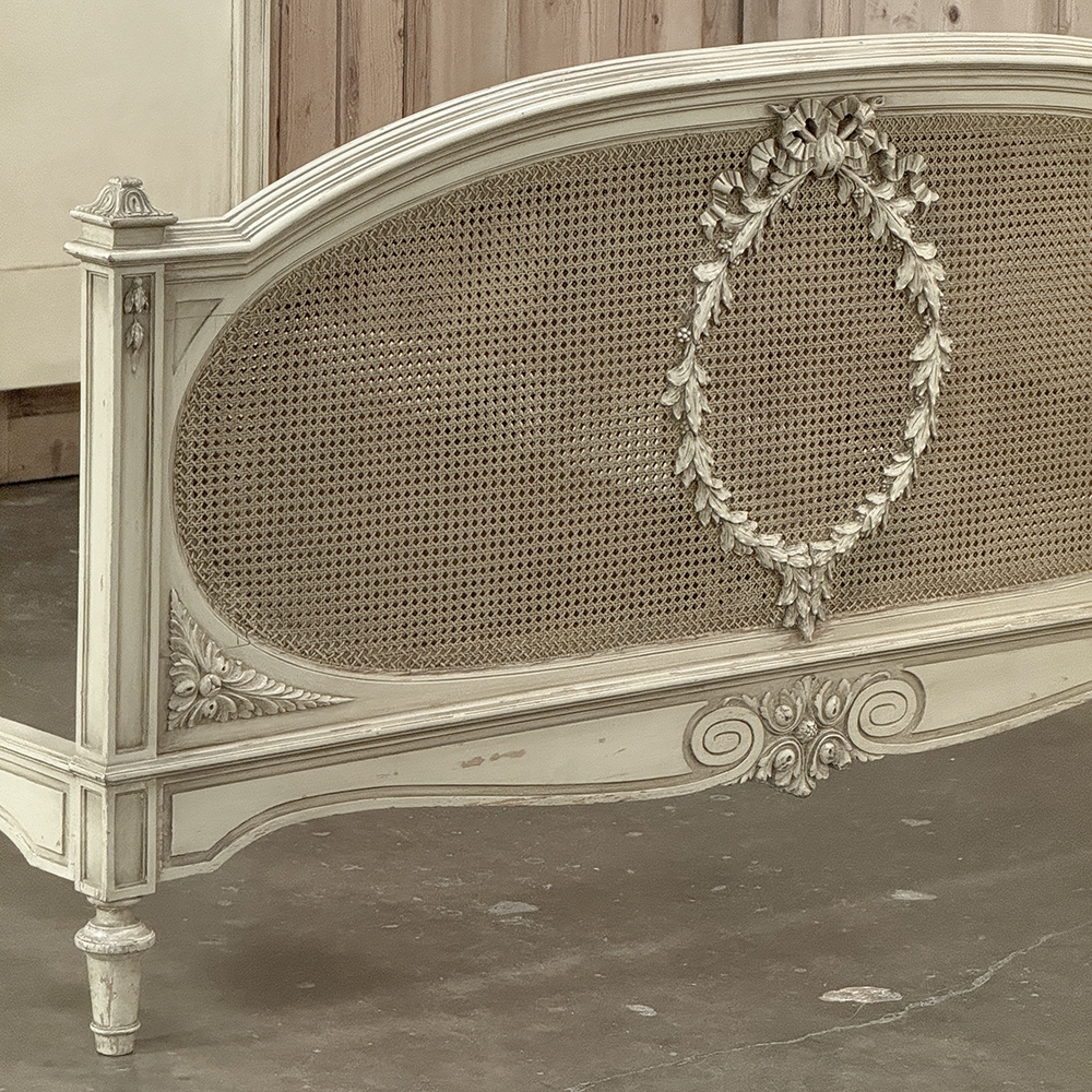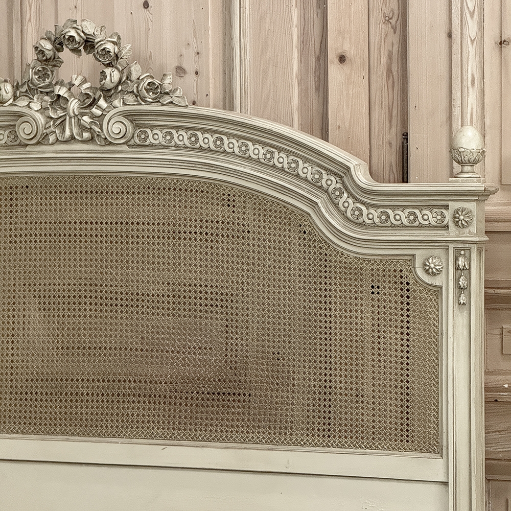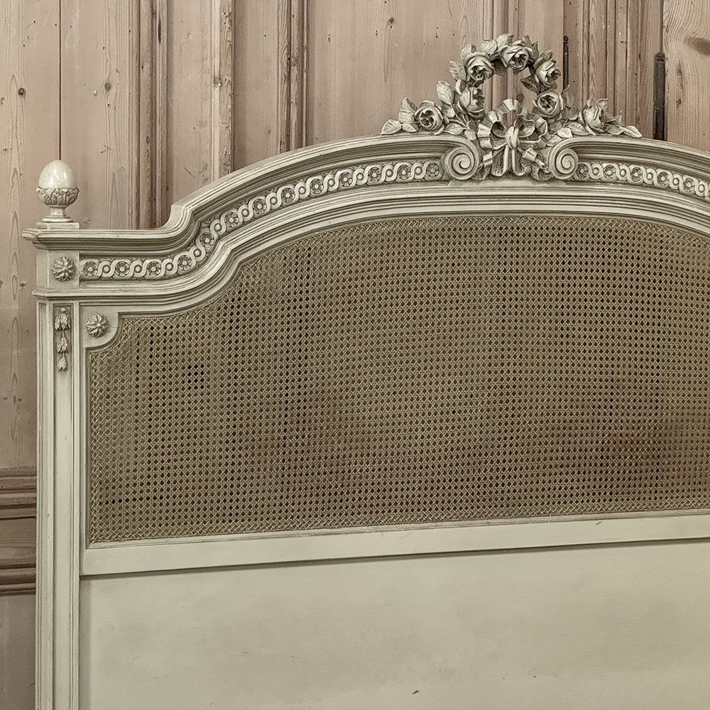 19th Century French Louis XVI Painted QUEEN Bed with Caning is a remarkable work of the furniture maker's art!  Sculpted from walnut, it features artistry exhibited from the crown of the headboard to the arbalette base of the footboard which happens to match the side rails.  The gracefully arched headboard consists of complex hand-carved molding surrounding a Greek coin border all across the crown, centered with an exquisitely rendered wreath of roses tied together with flowing ribbon.  Egg finials on foliate bases adorn the corners, underneath which are rosettes and bell flowers, with more rosettes on the corner of the caned panel.  As should be the case, the footboard has received equal attentions of the sculptor, with a boldly molded framework in an ovoid shape centered with a laurel wreath tied with ribbon mounted atop the double caned panel.  Triangular rosettes provide an accent, with square rosettes serving as end caps on each corner under which are more bell flowers.  The original painted finish has achieved a lovely patina and a charming state of distress that only adds to the allure and desirability of this magnificent work of the cabinetmaker's art!