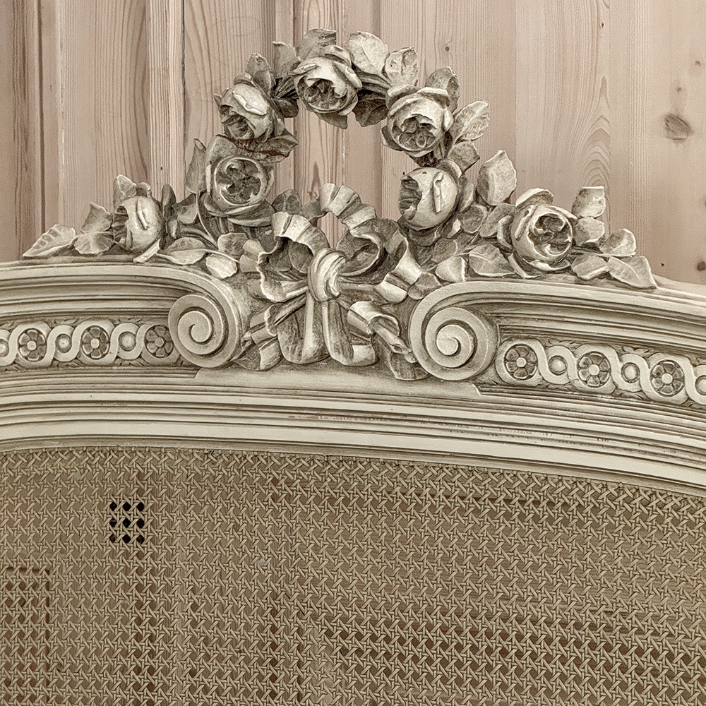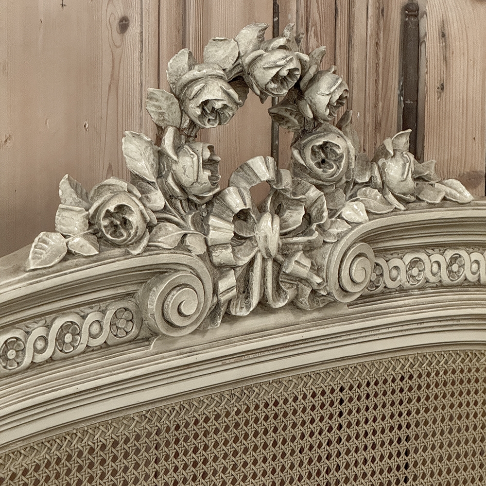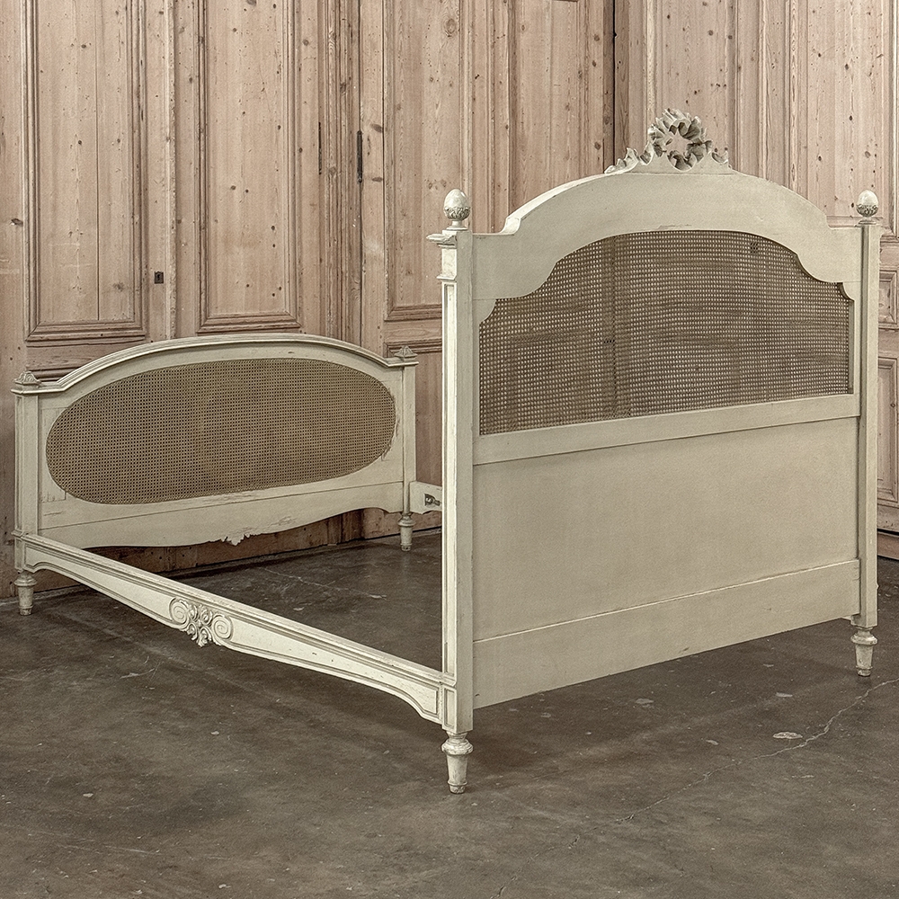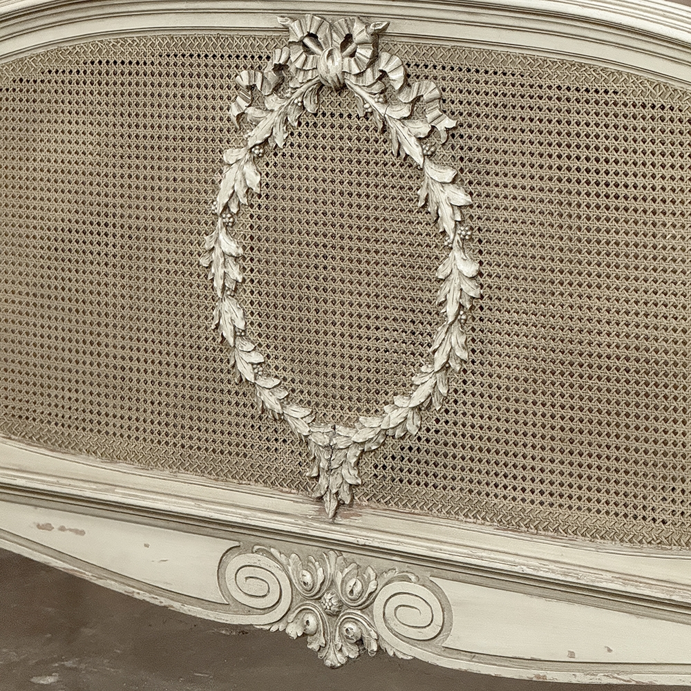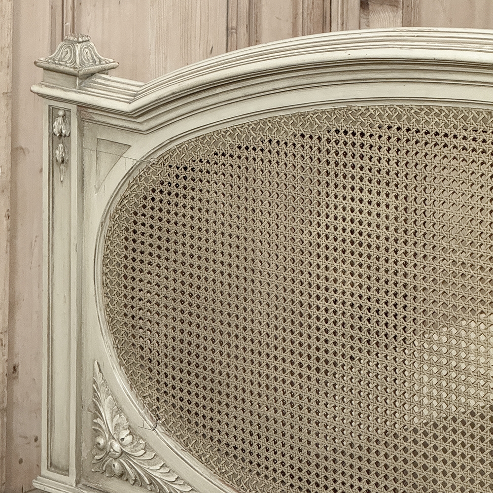 19th Century French Louis XVI Painted QUEEN Bed with Caning is a remarkable work of the furniture maker's art!  Sculpted from walnut, it features artistry exhibited from the crown of the headboard to the arbalette base of the footboard which happens to match the side rails.  The gracefully arched headboard consists of complex hand-carved molding surrounding a Greek coin border all across the crown, centered with an exquisitely rendered wreath of roses tied together with flowing ribbon.  Egg finials on foliate bases adorn the corners, underneath which are rosettes and bell flowers, with more rosettes on the corner of the caned panel.  As should be the case, the footboard has received equal attentions of the sculptor, with a boldly molded framework in an ovoid shape centered with a laurel wreath tied with ribbon mounted atop the double caned panel.  Triangular rosettes provide an accent, with square rosettes serving as end caps on each corner under which are more bell flowers.  The original painted finish has achieved a lovely patina and a charming state of distress that only adds to the allure and desirability of this magnificent work of the cabinetmaker's art!