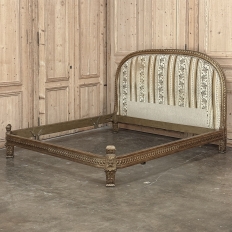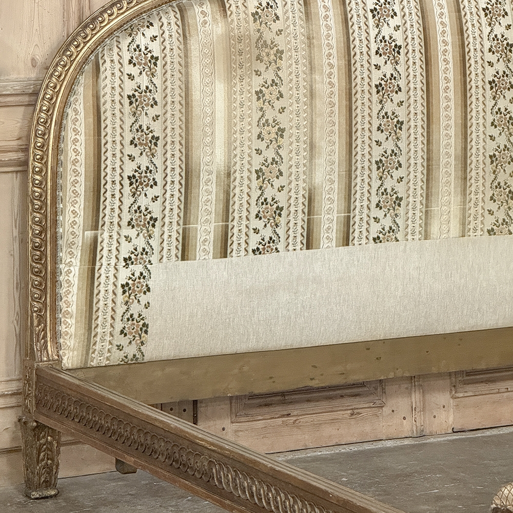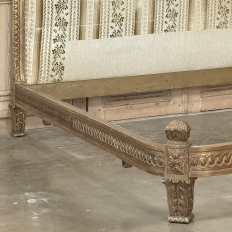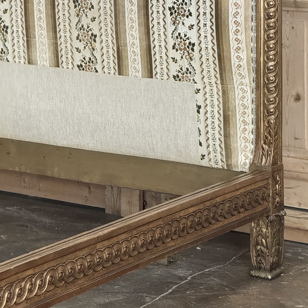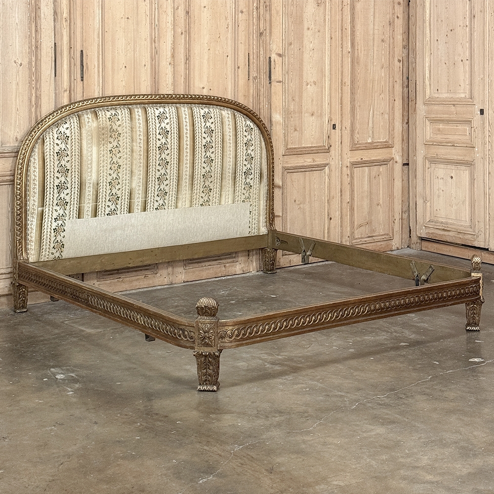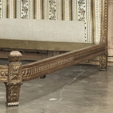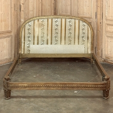 SaleAntique Italian Neoclassical Giltwood QUEEN Bed is a study in timeless style by one of the original sources for classic design! Utilizing broad radius curvatures on the headboard in a vertical orientation combined with broad radius curves on the footboard in a horizontal orientation, the frame creates a look that is both grand and restrained at the same time. Greek coin motif pervades the design, wrapping all around the headboard, down the rails and continuing across the curved footboard, interrupted only by the feet which are designed to resemble urns with rosettes atop pedestals, all beautifully carved and highlighted with the gold finish to create a luxurious effect. Painstakingly extended to accommodate a Queen size mattress set, the frame could even accommodate a king size set if you don't mind a little bit of overhang on each side. Fabric was very high quality but shows its age and should be reupholstered.