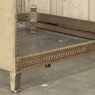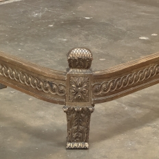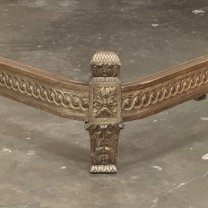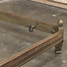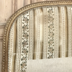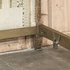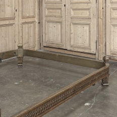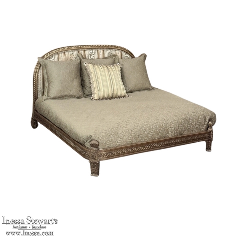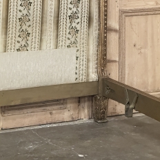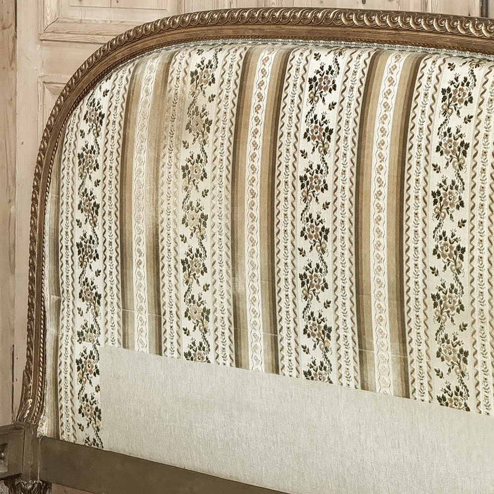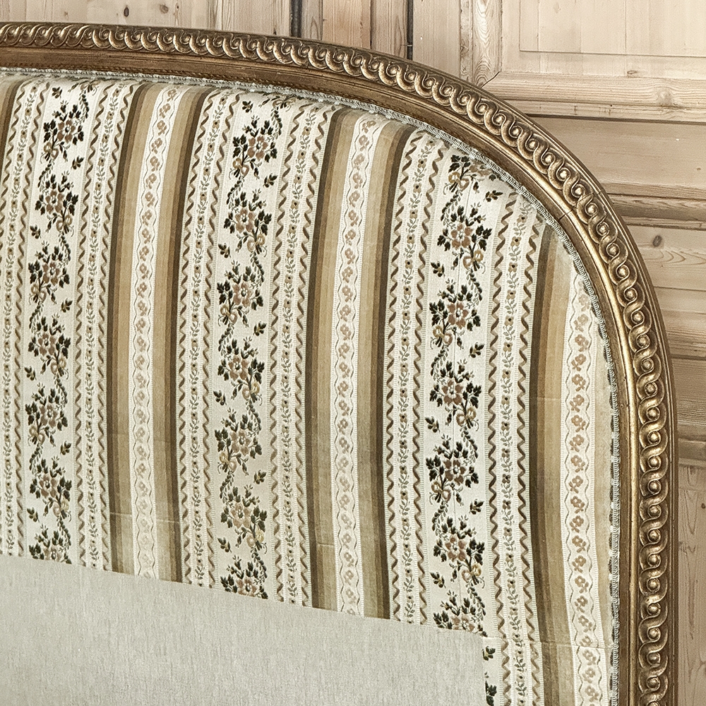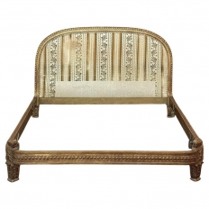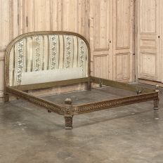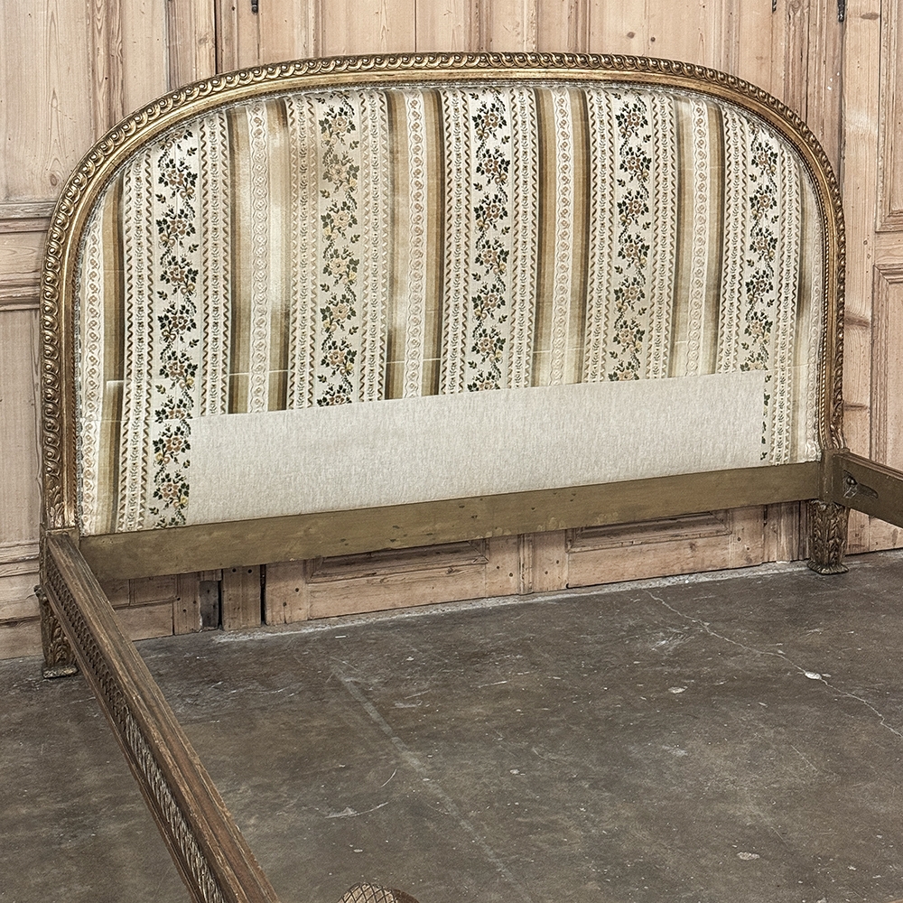 SaleAntique Italian Neoclassical Giltwood QUEEN Bed is a study in timeless style by one of the original sources for classic design! Utilizing broad radius curvatures on the headboard in a vertical orientation combined with broad radius curves on the footboard in a horizontal orientation, the frame creates a look that is both grand and restrained at the same time. Greek coin motif pervades the design, wrapping all around the headboard, down the rails and continuing across the curved footboard, interrupted only by the feet which are designed to resemble urns with rosettes atop pedestals, all beautifully carved and highlighted with the gold finish to create a luxurious effect. Painstakingly extended to accommodate a Queen size mattress set, the frame could even accommodate a king size set if you don't mind a little bit of overhang on each side. Fabric was very high quality but shows its age and should be reupholstered.