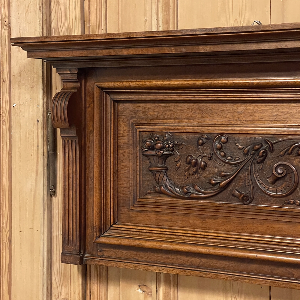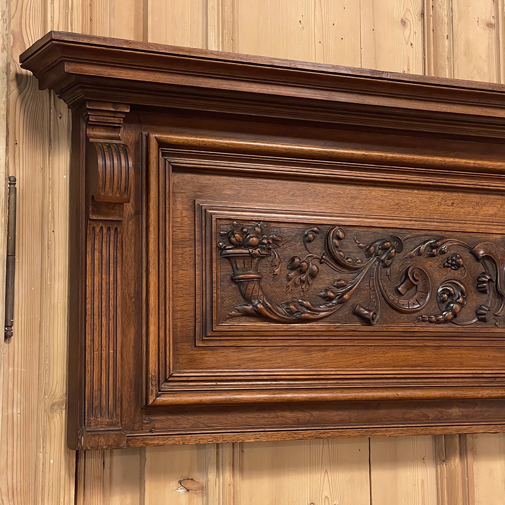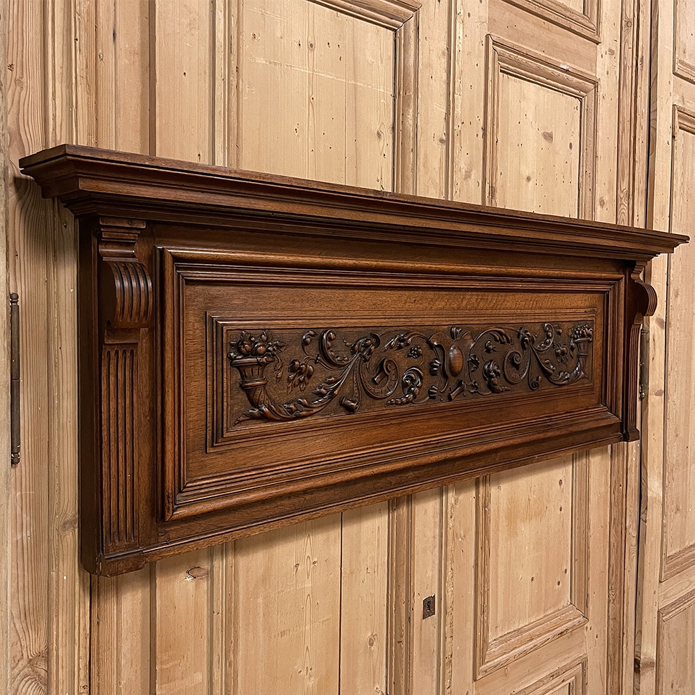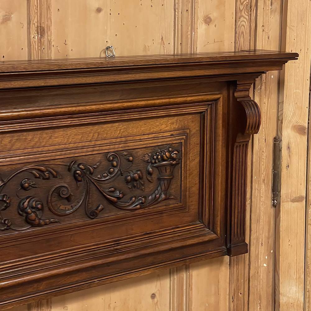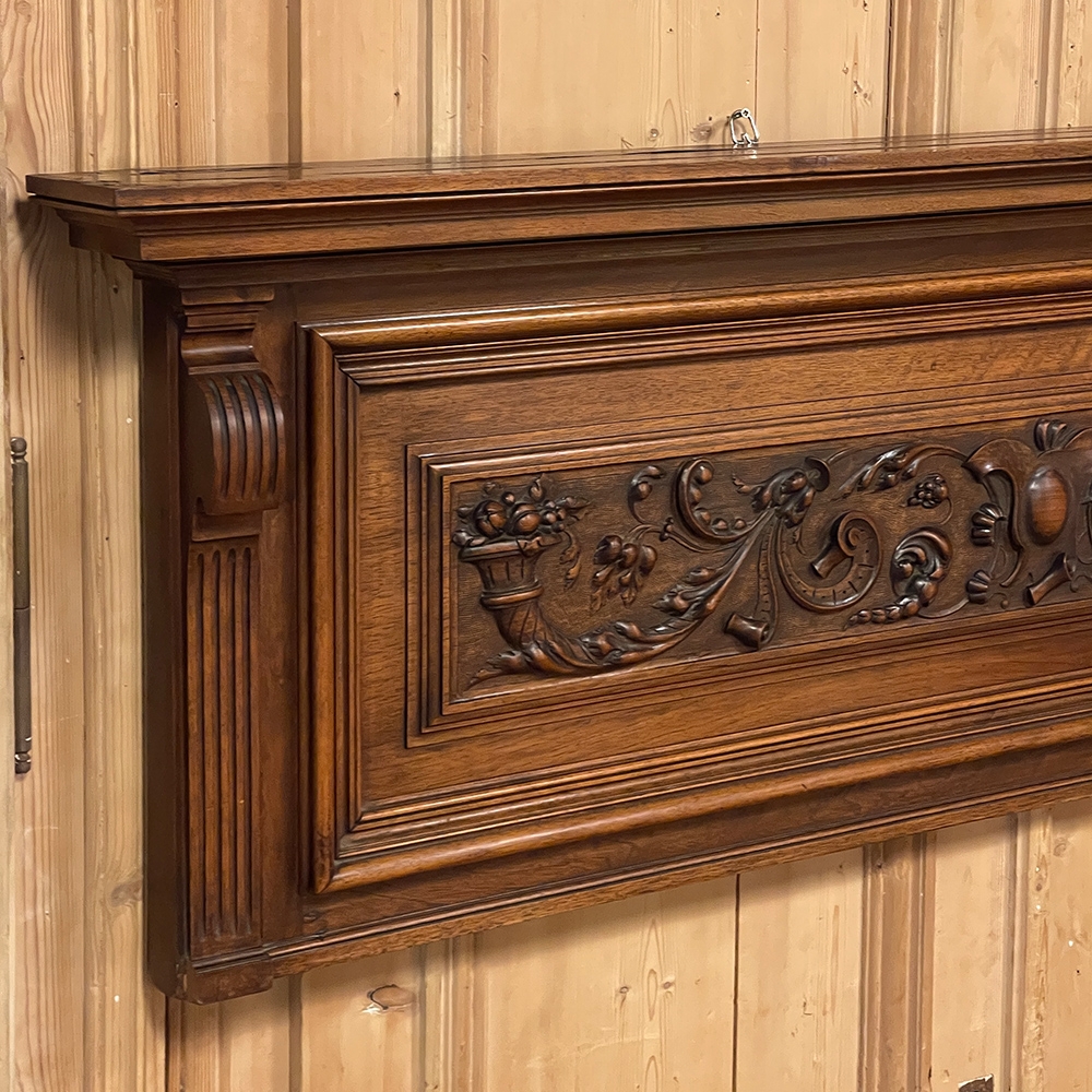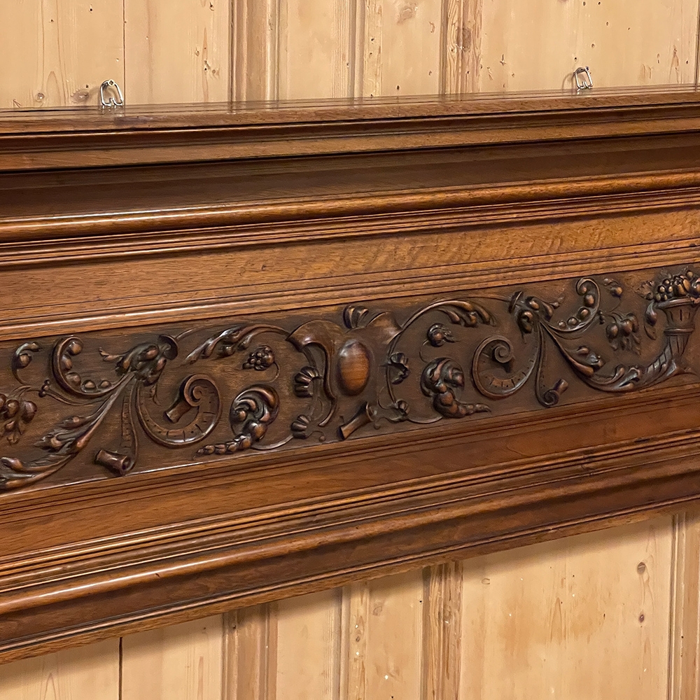 Antique Italian Neoclassical Hand-Carved Walnut Panel (Headboard) is the perfect size to mount on the wall and serve as a headboard for your Queen sized bedframe. Sculpted from solid walnut, it features bold molding across the crown with corbels and pilasters on each end framing the central carving, which is itself framed by additional molding detail. The carvings depict an heraldic crest at the center surrounding an egg motif, with undulating scrolls emanating out to each side depicting stylized wheat, fruit clusters, shells and foliates, all terminating with a cornucopia bursting with fruit ~ all sculpted in exquisite relief and made even more beautiful by the sheer natural visual appeal of the sumptous walnut.