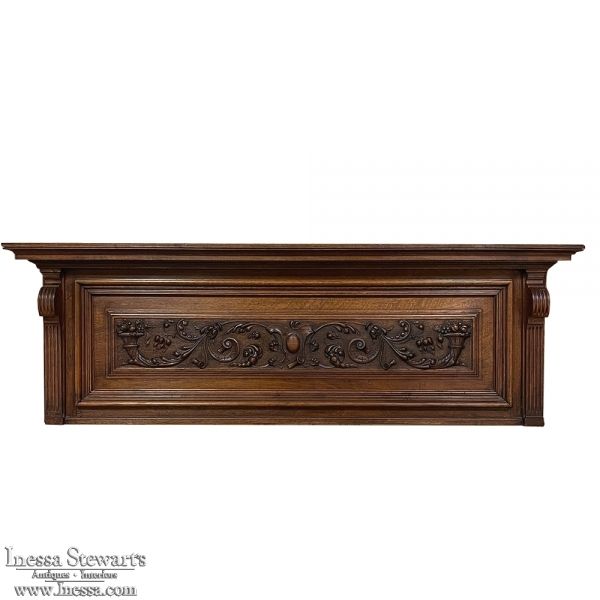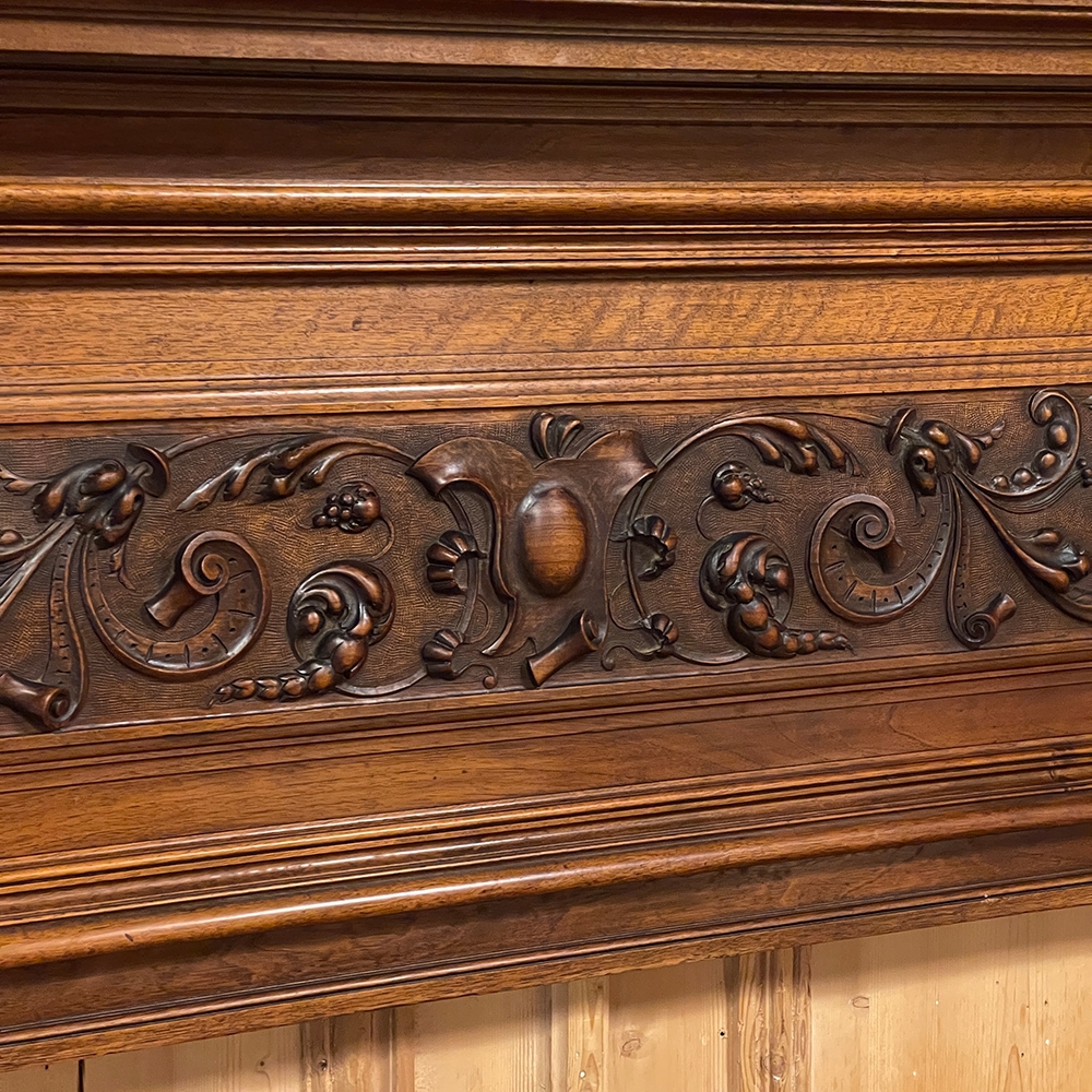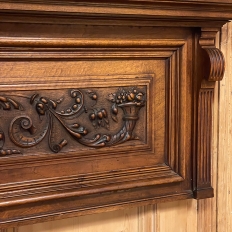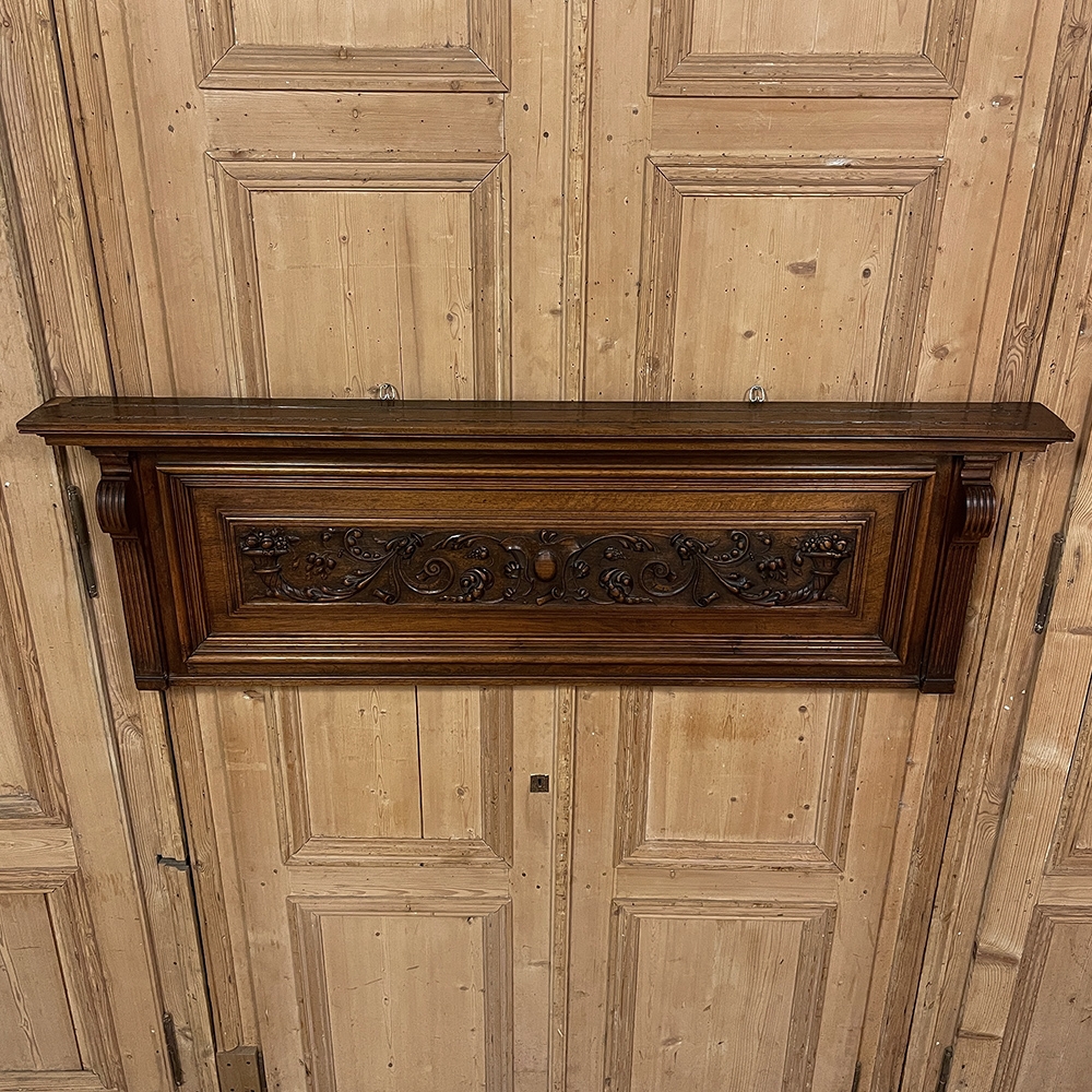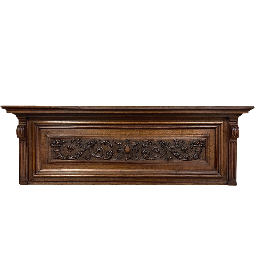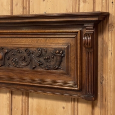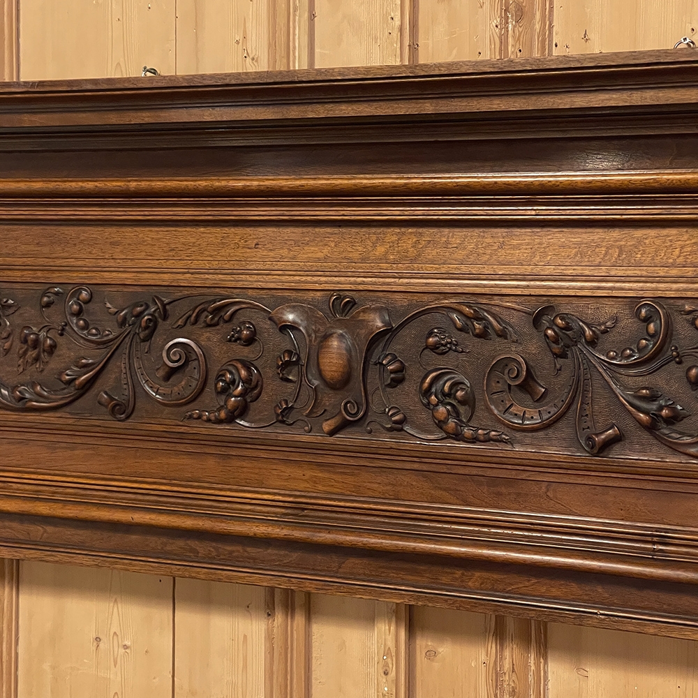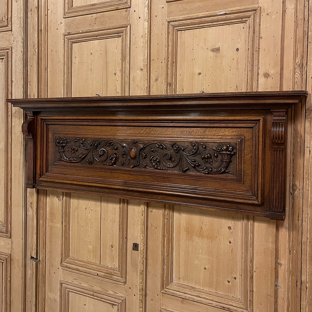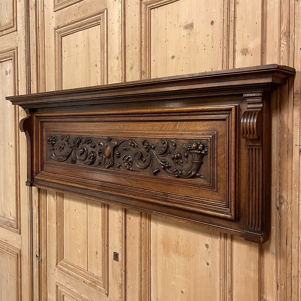 Antique Italian Neoclassical Hand-Carved Walnut Panel (Headboard) is the perfect size to mount on the wall and serve as a headboard for your Queen sized bedframe. Sculpted from solid walnut, it features bold molding across the crown with corbels and pilasters on each end framing the central carving, which is itself framed by additional molding detail. The carvings depict an heraldic crest at the center surrounding an egg motif, with undulating scrolls emanating out to each side depicting stylized wheat, fruit clusters, shells and foliates, all terminating with a cornucopia bursting with fruit ~ all sculpted in exquisite relief and made even more beautiful by the sheer natural visual appeal of the sumptous walnut.