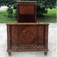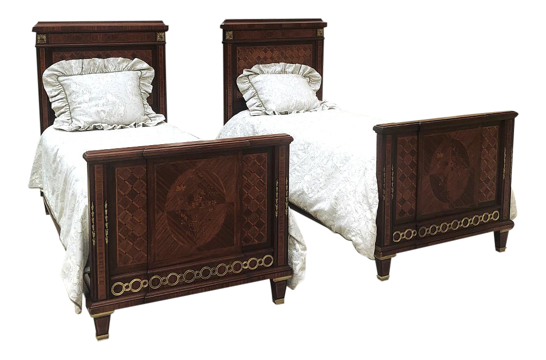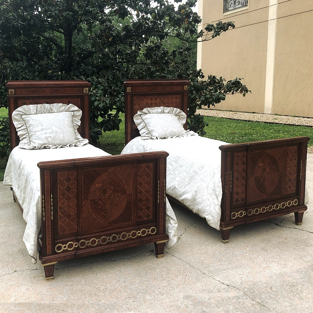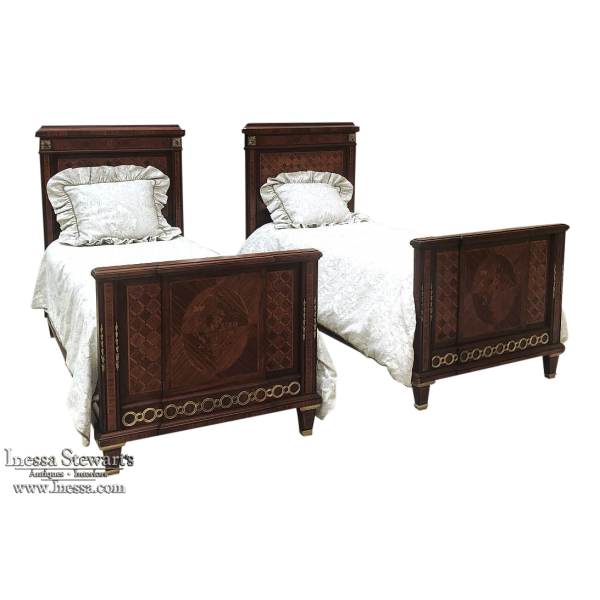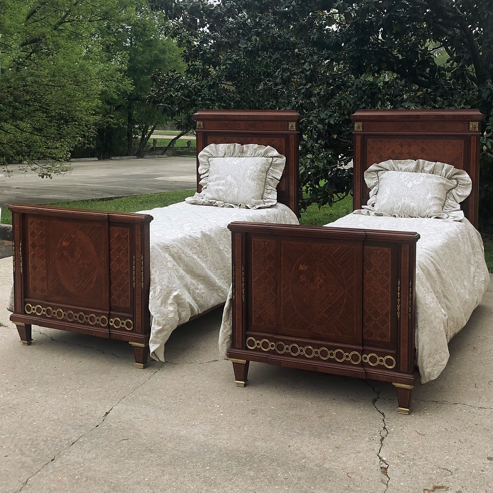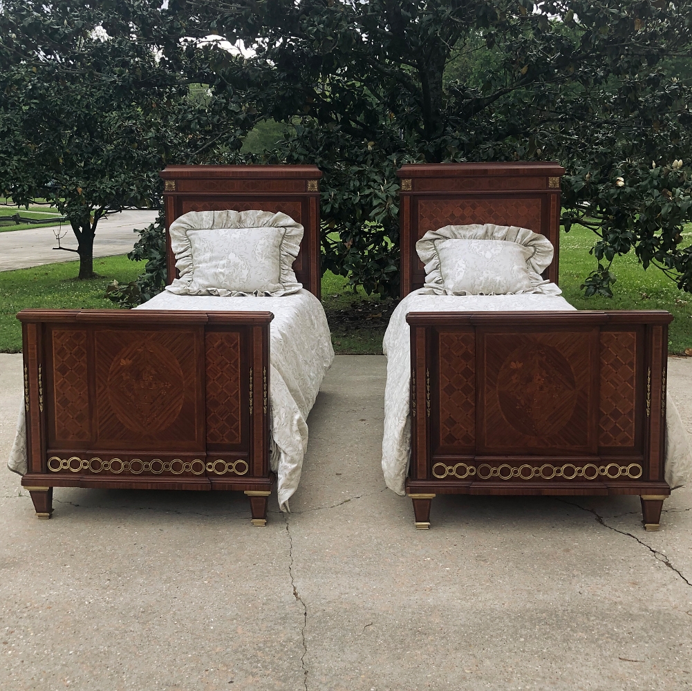 Pair Antique French Louis XVI Mahogany Marquetry Twin Beds with Bronze Ormolu