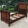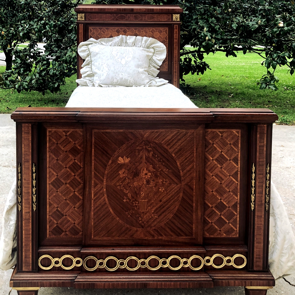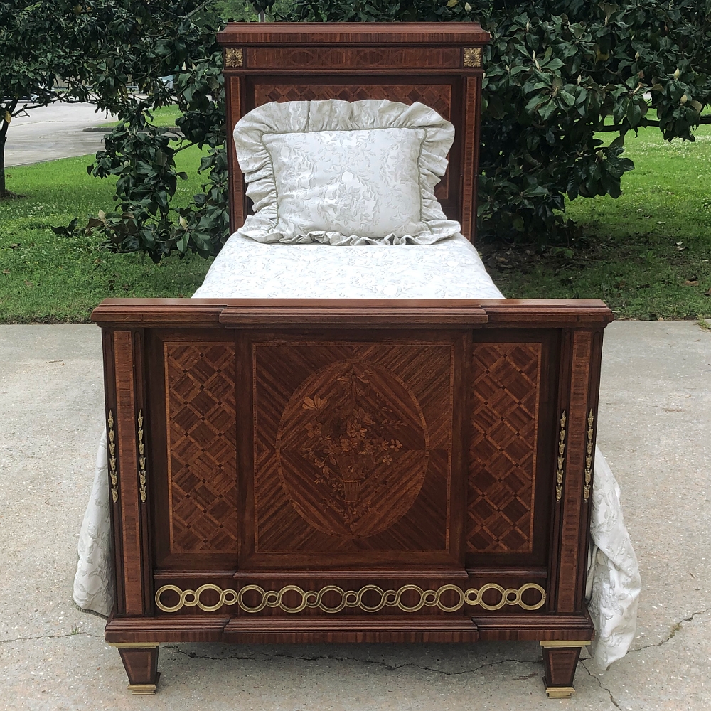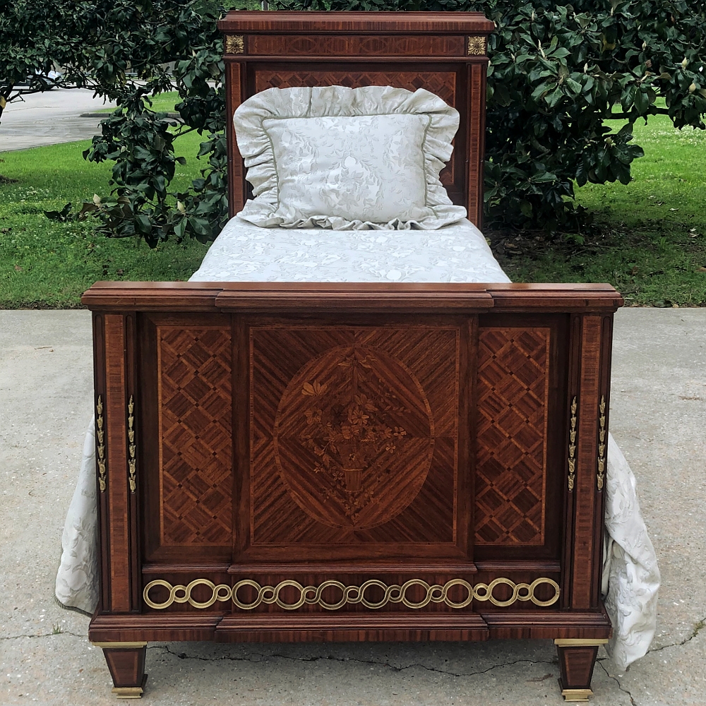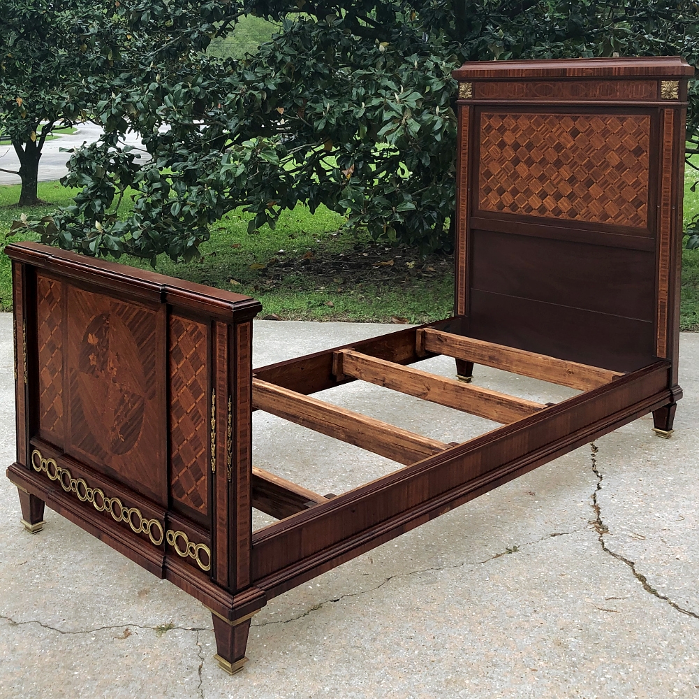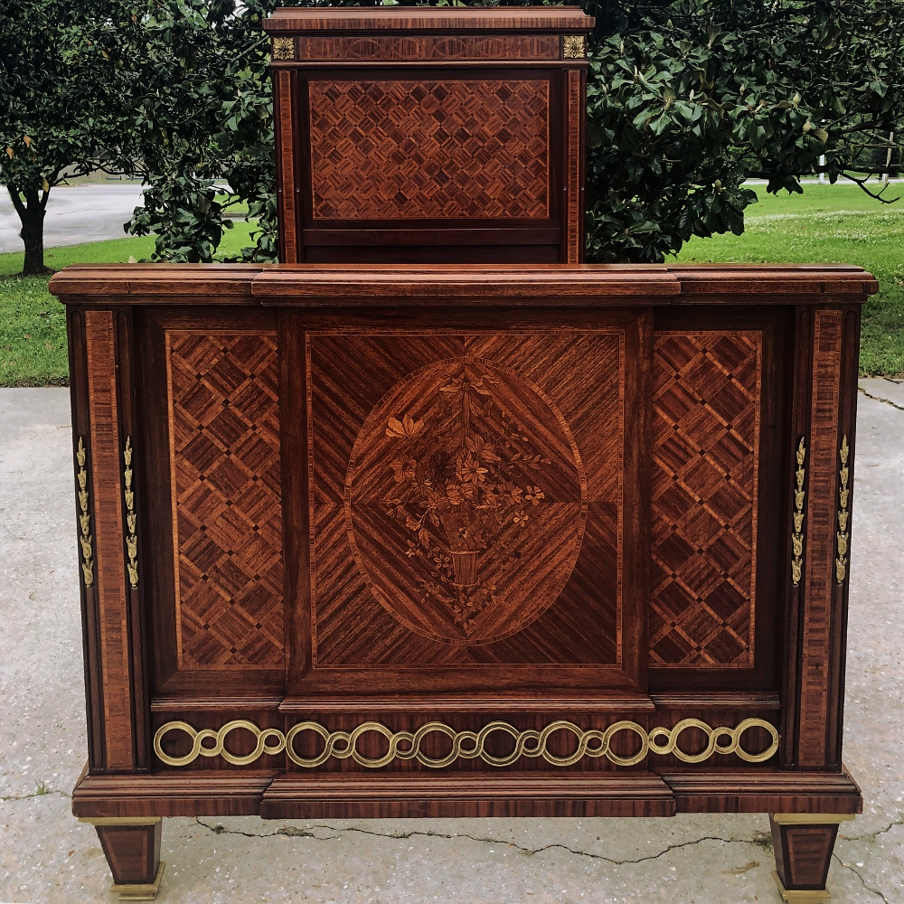 Pair Antique French Louis XVI Mahogany Marquetry Twin Beds with Bronze Ormolu are masterpieces of the furniture maker's art!  Meticulously crafted in Paris from exotic imported mahogany, each features amazingly detailed marquetry on the headboard and the footboard, which depicts a basket full of flowers in an inlaid oval frame.  The footboard also features a step-front design for added visual interest.  Bronze ormolu mounts of rosettes, bell flowers and Greek coin overlay enhance the look, with tapered legs for support collared and tipped in bronze for a truly regal look.