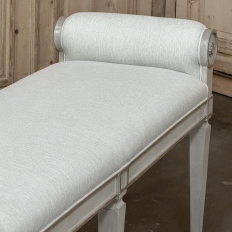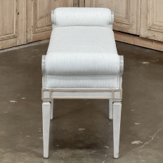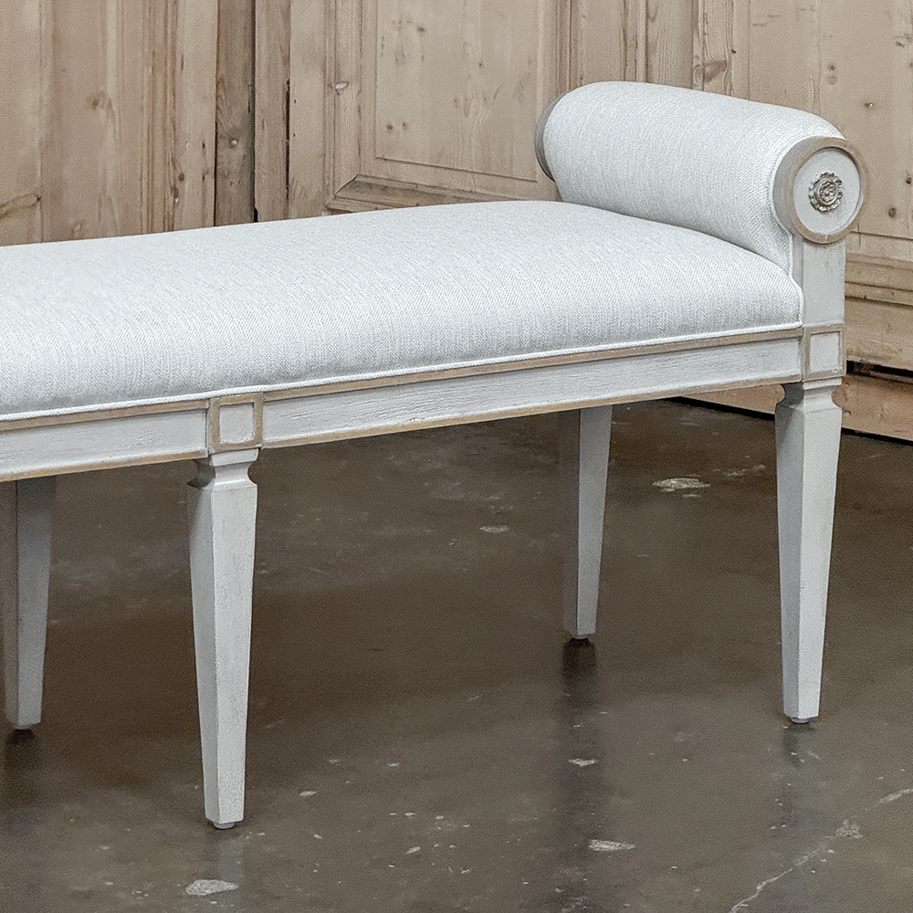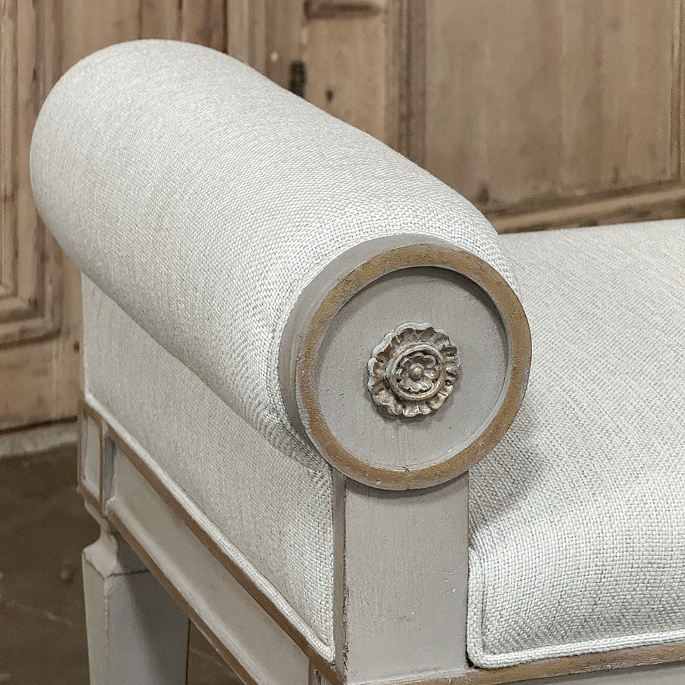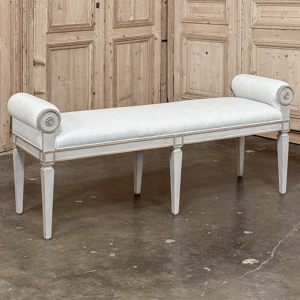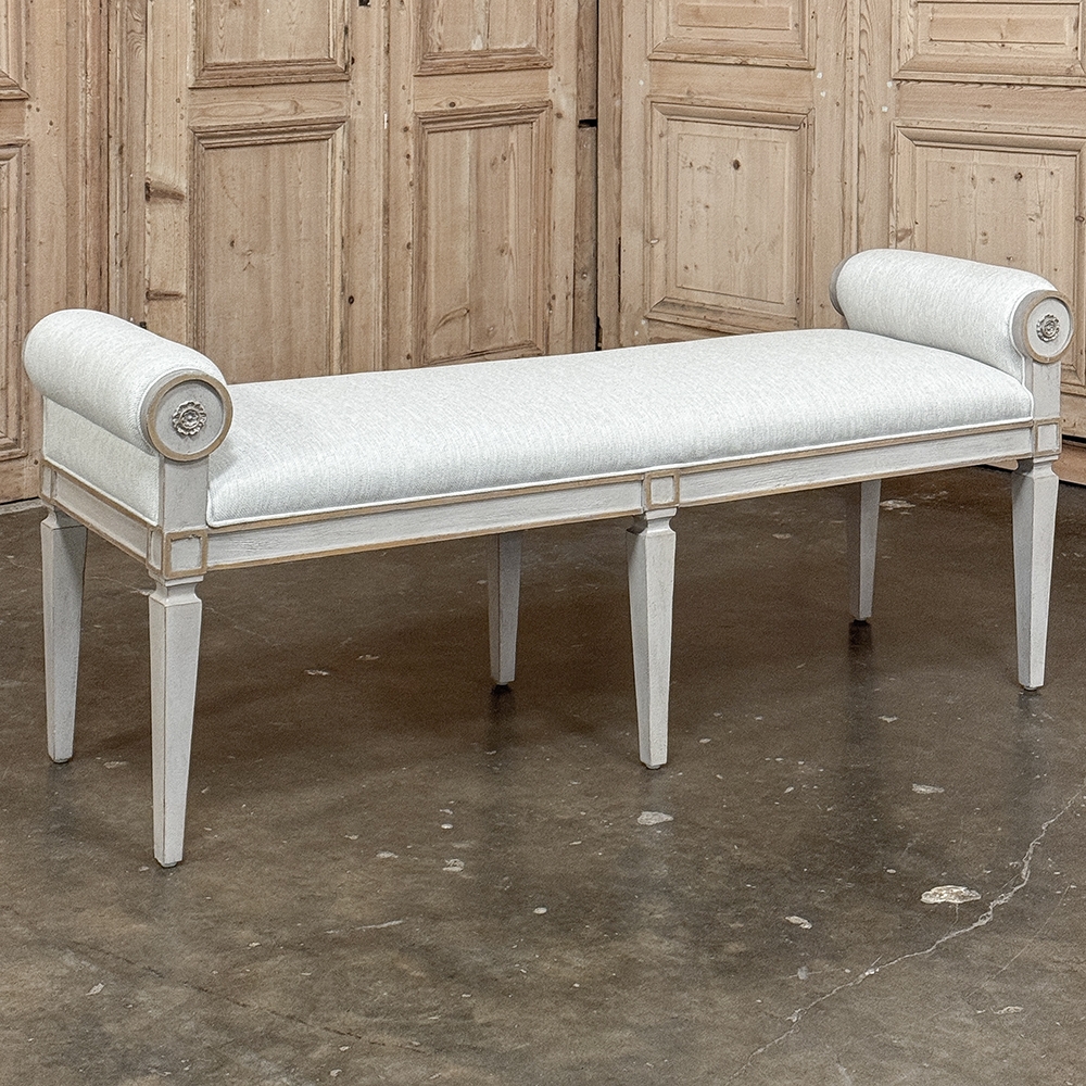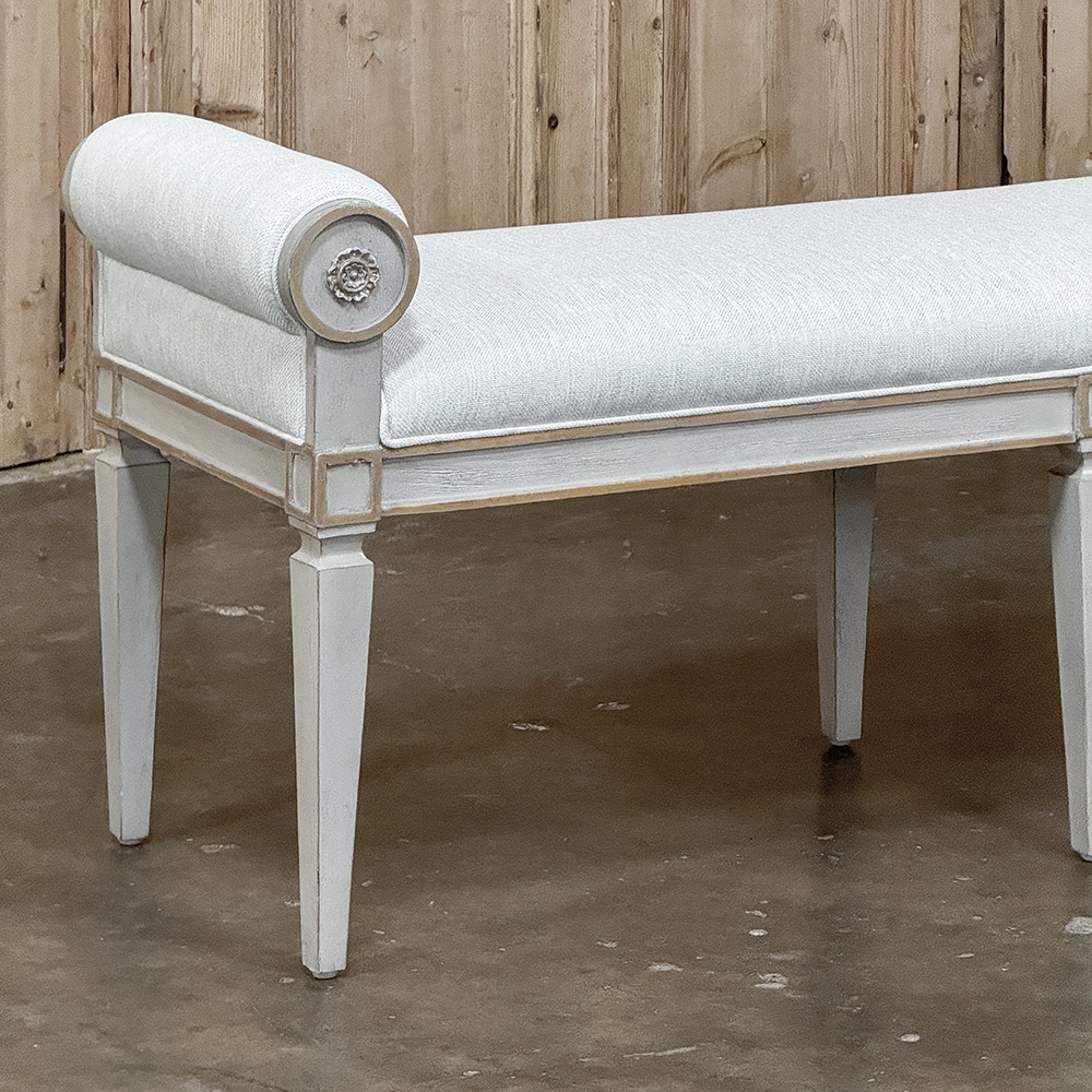SaleGreek Neoclassical Painted Armbench ~ Large is a splendid re-imagining of the classical style as first pioneered by the ancient Greeks, then later the Romans, over two thousand years ago! The armrests are shaped like today's bolsters, framed by wooden uprights that are highlighted with a rosette and subtle gold trim. The same gold trim treatment outlines the apron which is supported by four tapered legs. The patinaed painted finish features just a touch of distress to add charm, while the seat and armrests are newly upholstered in a durable, neutral fabric.