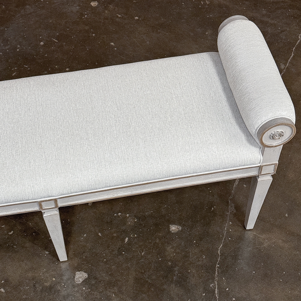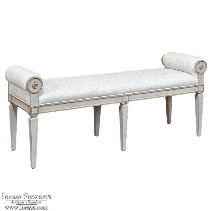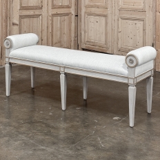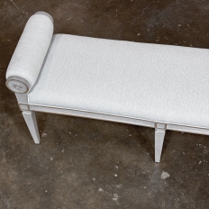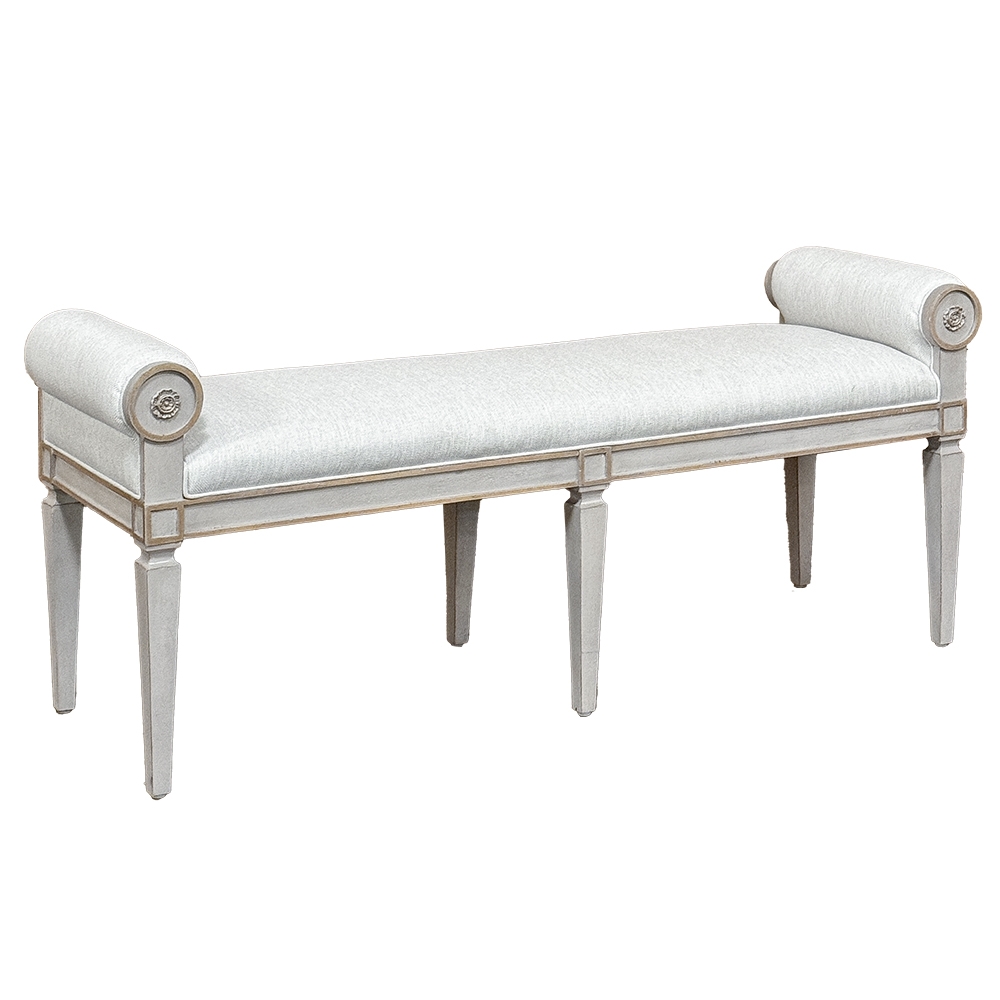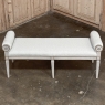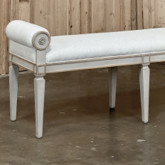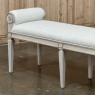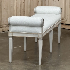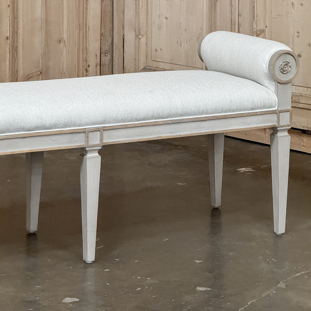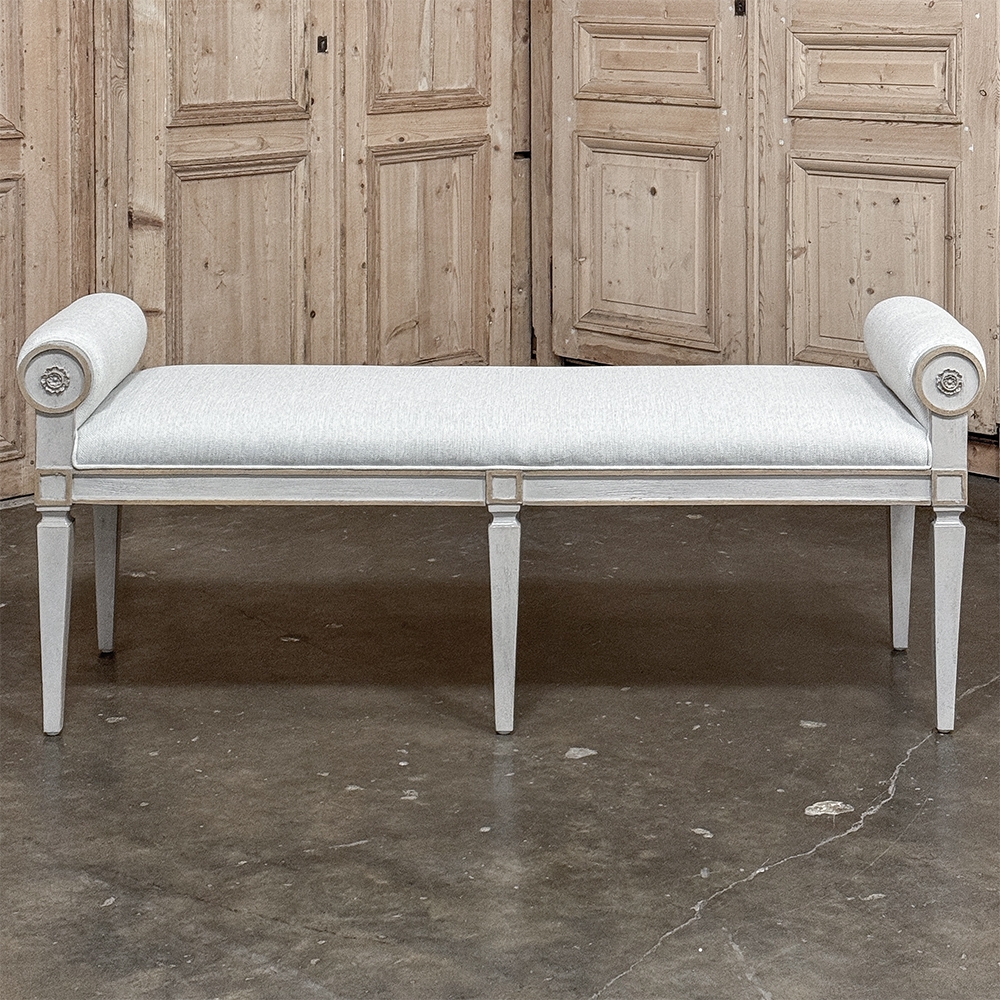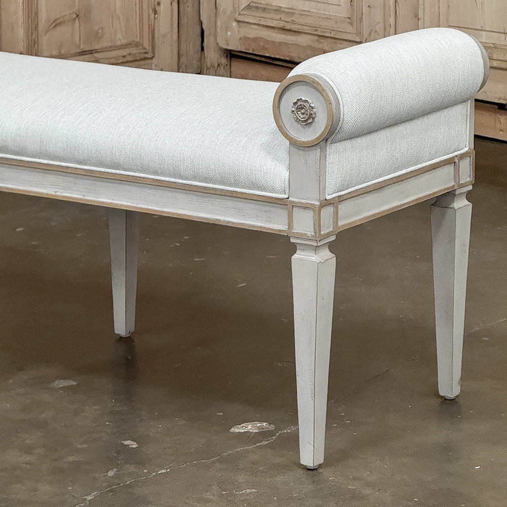 SaleGreek Neoclassical Painted Armbench ~ Large is a splendid re-imagining of the classical style as first pioneered by the ancient Greeks, then later the Romans, over two thousand years ago! The armrests are shaped like today's bolsters, framed by wooden uprights that are highlighted with a rosette and subtle gold trim. The same gold trim treatment outlines the apron which is supported by four tapered legs. The patinaed painted finish features just a touch of distress to add charm, while the seat and armrests are newly upholstered in a durable, neutral fabric.