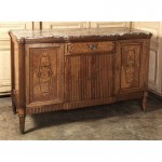 Truly a wonder to behold, this stunning Italian Neoclassical Marquetry Buffet made by “De Capitani Roma” was produced by master artisans from exotic burl woods and a variety of contrasting species inlaid into the door panels to create the appearance of two sets of mirror-image of cornucopia urns bursting with flowers. Even the bordering is inlaid with several woods to create an interesting trim. Imagine the skill required to shape the base wood behind the marquetry then overlay the marquetry in place with such a fine seam between the two all while producing a work of art in the process! The bronze ormolu adorners this buffet like fine jewelry, adding to overall opulent yet elegant effect. Four cabinets, four drawers and a generous serving surface make this a particularly useful work of art! Circa 1930s.