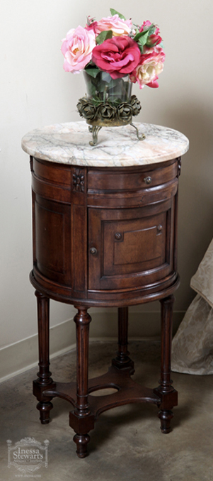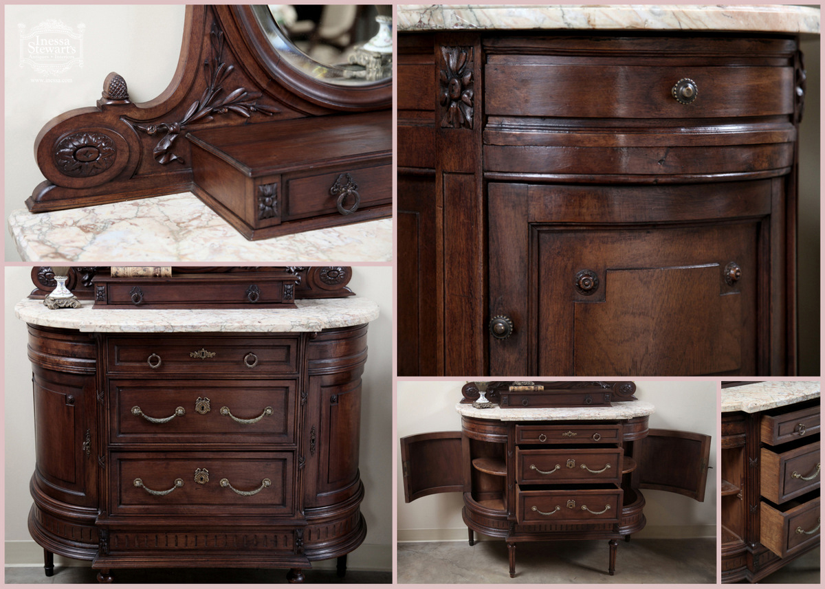 The round nightstand features complementary carvings, a pierced lower shelf, nicely sized cabinet and drawer, and a sumptuous marble top that was cut from the same slab as the marble on the matching dresser, the final piece de resistance of this wonderful set. Spacious drawers, a pair of cabinets even a full width jewelry drawer under the oval original beveled oval mirror all add together to create luxurious functionality, while the cast bronze original hardware completes the look.