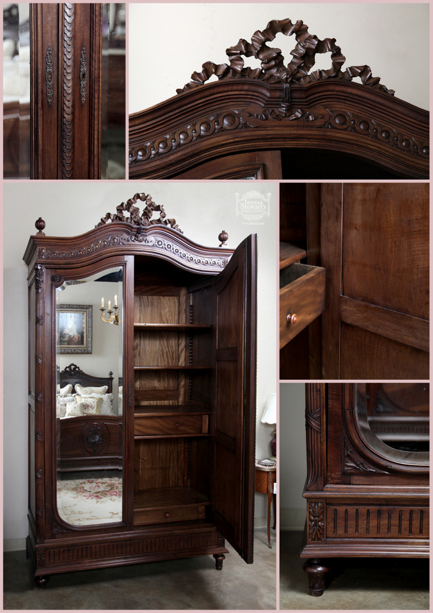 Rendered from select French walnut in the classical style that so enamored Louis XVI, this four piece bedroom set is a remarkable example of French antique furniture in perfect condition and completely intact! The stately antique armoire boasts its original beveled mirrors flanked by banded wheat corner posts and framed by a fluted apron below and a bonnet en arbalette on top, which has been lavished with Greek coin motif and a stunning ribbon and floral cartouche. Pomegranate finials, acanthus rosettes, and foliate corbels complete the look. The bed, whose headboard mimics the armoire’s crown, sports a complementary footboard embellished with musical instruments, with floral garlands, Greek coin and banded wheat trim all around.