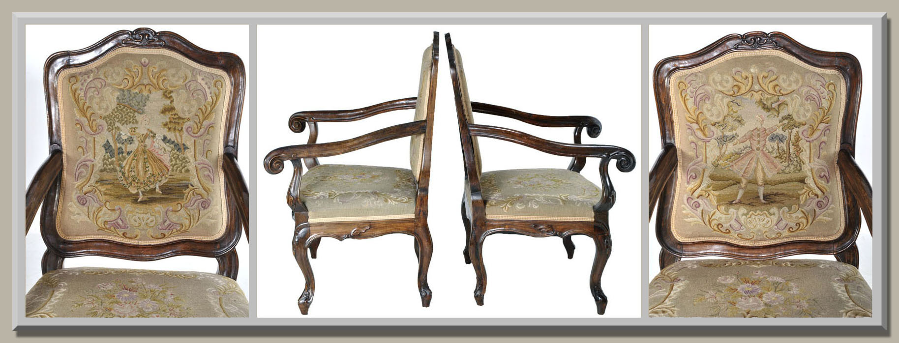 Handcrafted from solid fruitwood in the manner of Louis XV, this pair of armchairs will lend an elegance that cannot be compared! The elegant lines of rococo frames rest gracefully on cabriole legs in perfect proportion. The original petit point tapestry upholstery features a splendid floral bouquet with foliates on each seat, with a courtier on one seatback and a lady of the court on the other depicted in vibrant colors with elaborate borders. Subtle hand-carved accents include shell & acanthus plume detailing. Circa 1860s.