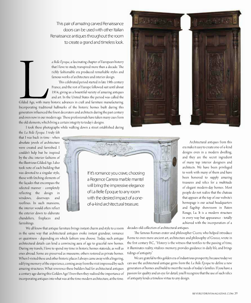 Antique Letter EngravingLa Belle Époque, a fascinating chapter of European history that I love to study, transpired for more than a decade. The richly fashionable era produced remarkable styles and famous works of architecture and interior design.  This celebrated period started in late 19th century France, and the rest of Europe followed suit until about 1914, giving us a bountiful variety of amazing antiques and art. Read more in Beverly Drive Magazine!