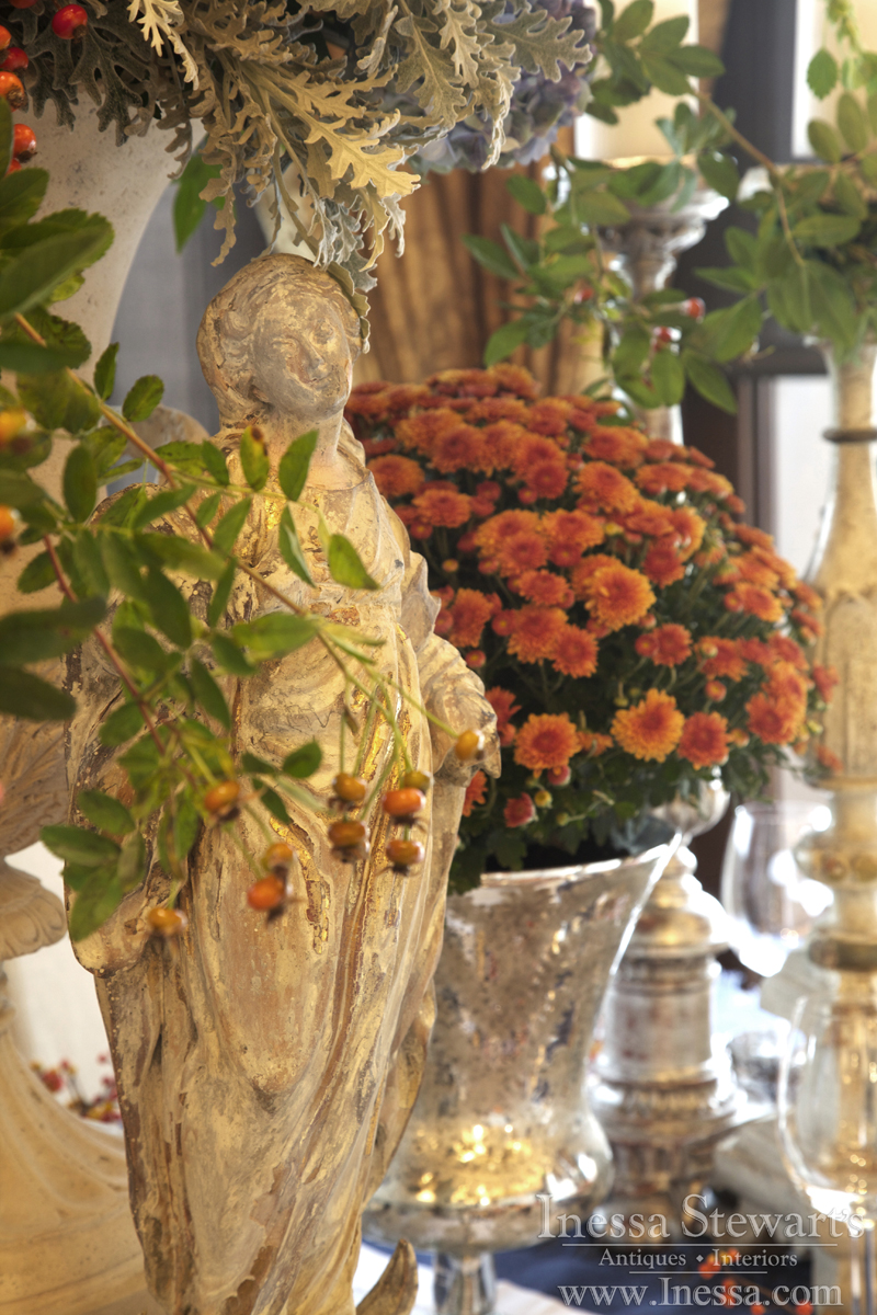 This 18th Century Italian Madonna statue makes an eye-catching centerpiece for our celebration while adding a timeless and tender element to this table setting. The dusty miller, mums, berries, hydrangeas, lilies and roses in rusty hues complete this vibrant, seasonal tableau!