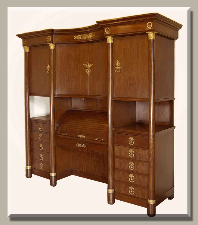 Empire style ~ this genre was as far reaching as the emperor Napoleon himself. Emulated in the Russian court, as far away as the Americas a modified version evolved as the Federal style during the first part of the 19th century. It all started when Napoleon Bonaparte crowned himself as emperor in 1804 and began to build his empire. This era is often referred to as First Empire Period. Antique Empire French furniture had intentionally rejected the carved, ornate and elaborate styles of the Bourbon Kings. Empire furniture was typically dominated by Greco-Roman and Egyptian motifs. Bold designs were stiff and imposing with an aura of studied dignity~ reflective of Napoleon’s imperial majesty. Mahogany was the wood of choice, imported from the Americas and accented with ormolu mounts. Ormolu of this period was finely detailed, chased and gilded. Being the furniture’s only ornament it was as jewelry on the simplistic, austere forms. Some furniture was gilded or highlighted with gilt paint. Marble tops of commodes and tables had sharp edges and were usually in grey, black or white in color. Today’s decorative motifs are ironically associated with the style ~ the Napoleonic Bee, the round laurel wreath with “N” initial and of course the Imperial Eagle and Swan.