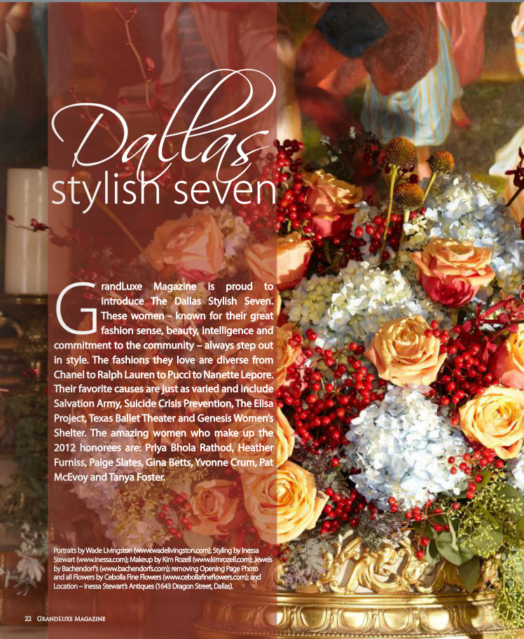 I admit that I was nervous when Carolyn Tillery and Tim Miller (editor and president of Grand Luxe Magazine, respectively) first told me about this project. The seven most stylish ladies in Dallas would be coming to our antique showroom on the corner of Dragon and Oak Lawn to take part in this high fashion layout for the September issue. My trepidation was unnecessary, as the experience was both amazing and unforgettable!