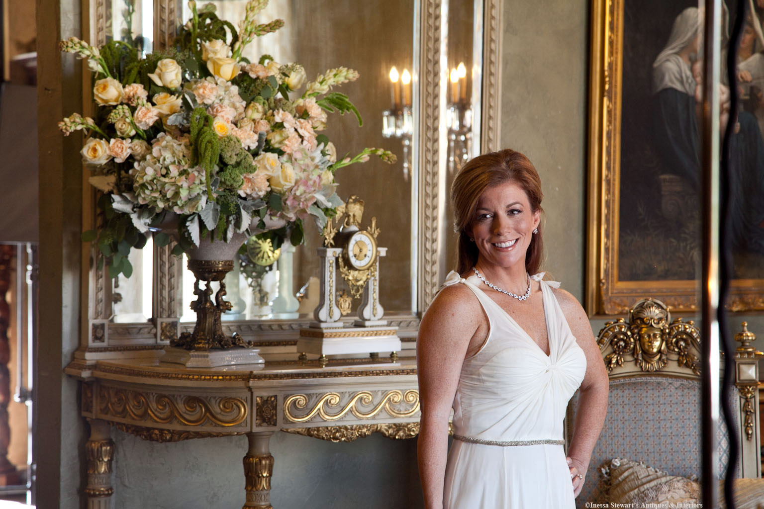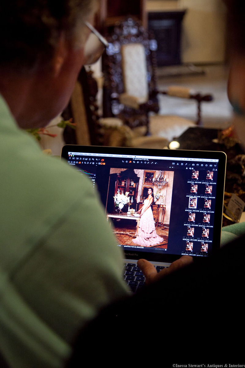 Our whole staff dove headfirst into the project; we could not contain our collective excitement. Everyone worked so hard to set up seven different vignettes filled with antique furniture, accessories, lighting and art ~ each creating the perfect setting for the individual honoree’s gown selection. It was truly a joy to work with such a talented team that was assembled by the Grand Luxe staff, which reminded me about my own modeling days and long hours in front of the camera.