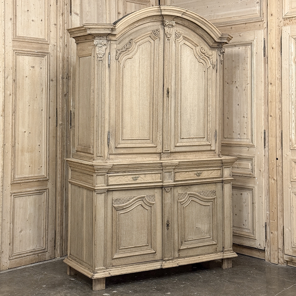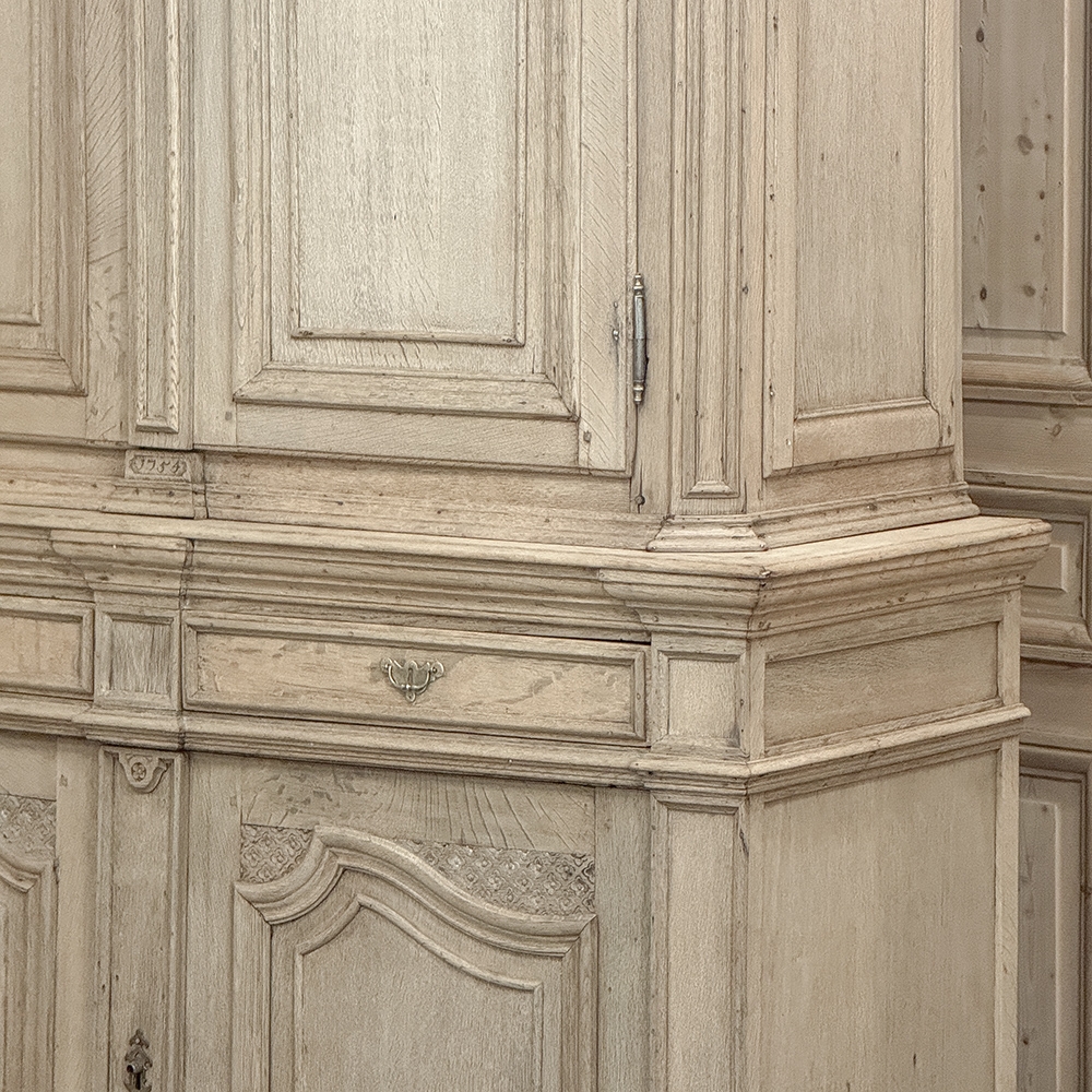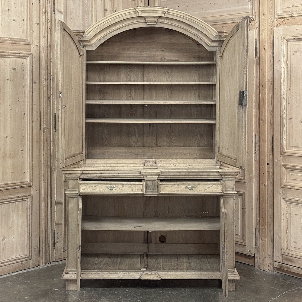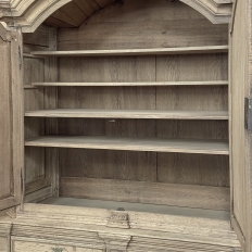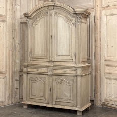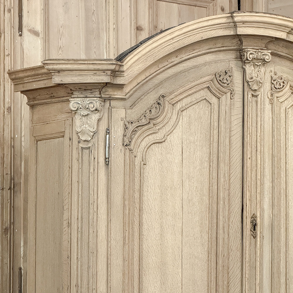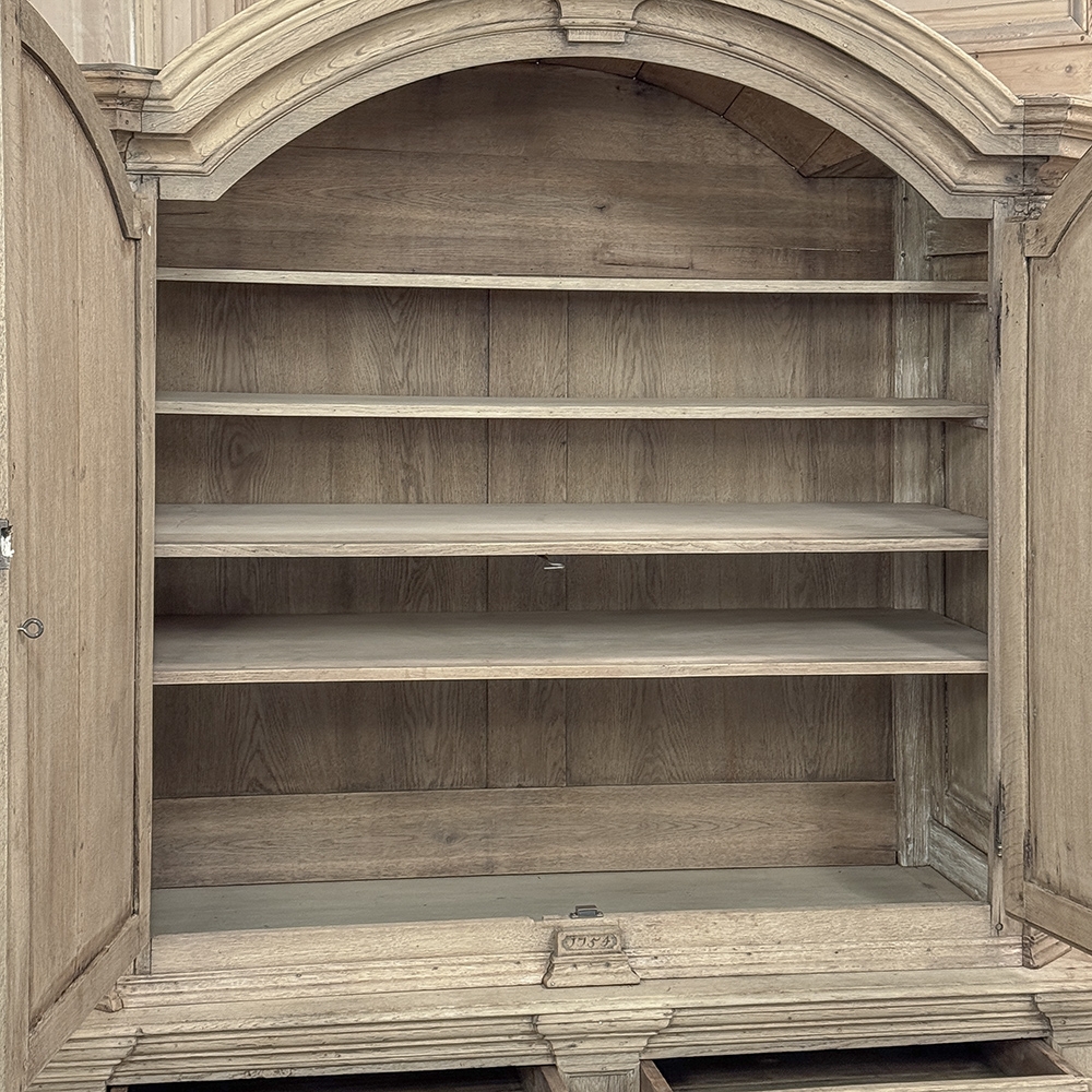 18th Century French Louis XIV Cabinet ~ Armoire in Stripped Oak is a majestic testament to the incredible craftsmen of France, who combined architecture, style and timeless flair into one impressive piece. Utilizing indigenous old-growth white oak, a bold arched crown was fashioned, boldly molded in multiple tiers to accentuate the impact, and overlooking the arched doors of the upper tier. The corners not only project out from the piece, but are defined by mitered molding and corbels matched by the corbel centered at the top of the crown. Stylized shell motifs adorn the intricate molding detail of the cabinet doors which open to reveal five surfaces. The lower tier is a variation of the upper design, but slightly deeper for a cavernous interior, and features a brace of drawers separately distinguished by molding. Painstakingly stripped using our proprietary process that retains the patina and sheer natural beauty of the old wood, all performed by our expert in-house staff.
