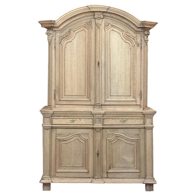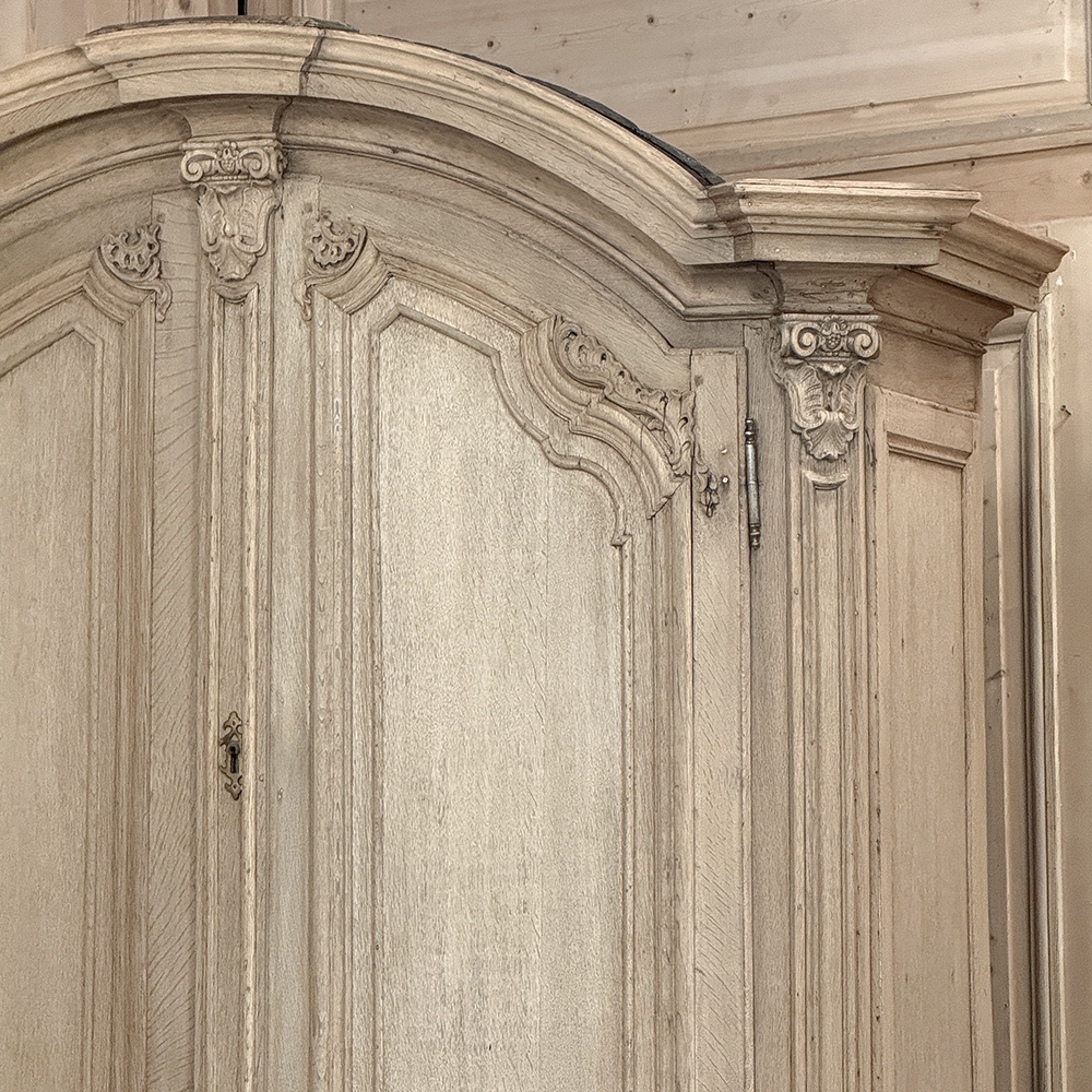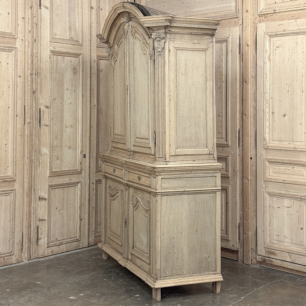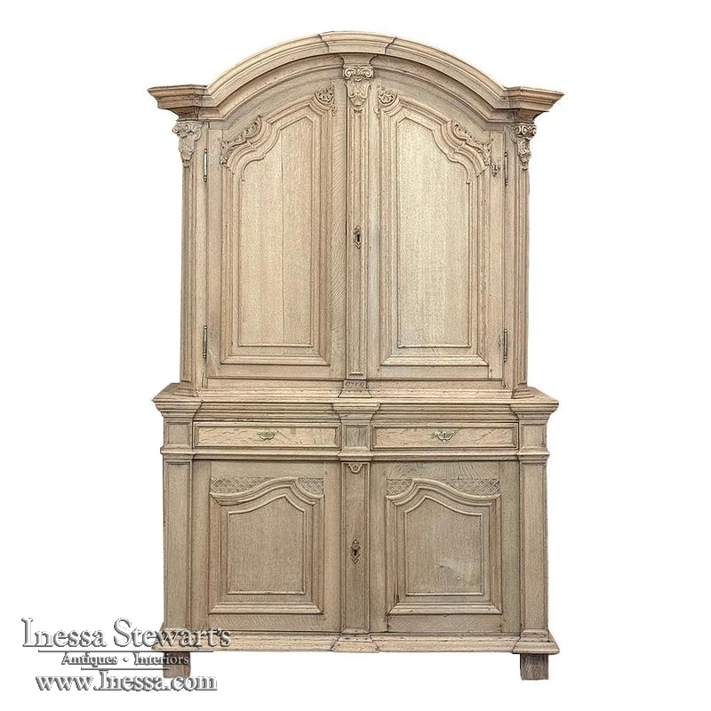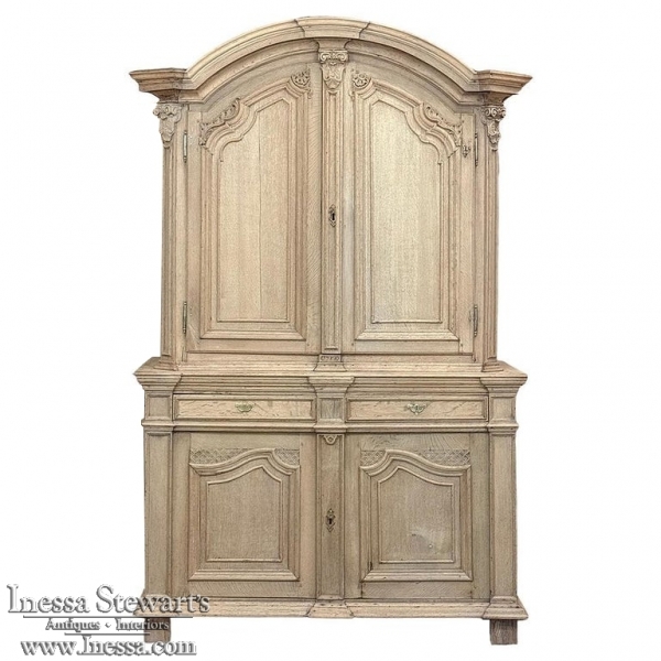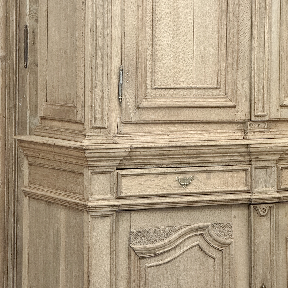 18th Century French Louis XIV Cabinet ~ Armoire in Stripped Oak is a majestic testament to the incredible craftsmen of France, who combined architecture, style and timeless flair into one impressive piece. Utilizing indigenous old-growth white oak, a bold arched crown was fashioned, boldly molded in multiple tiers to accentuate the impact, and overlooking the arched doors of the upper tier. The corners not only project out from the piece, but are defined by mitered molding and corbels matched by the corbel centered at the top of the crown. Stylized shell motifs adorn the intricate molding detail of the cabinet doors which open to reveal five surfaces. The lower tier is a variation of the upper design, but slightly deeper for a cavernous interior, and features a brace of drawers separately distinguished by molding. Painstakingly stripped using our proprietary process that retains the patina and sheer natural beauty of the old wood, all performed by our expert in-house staff.
