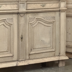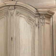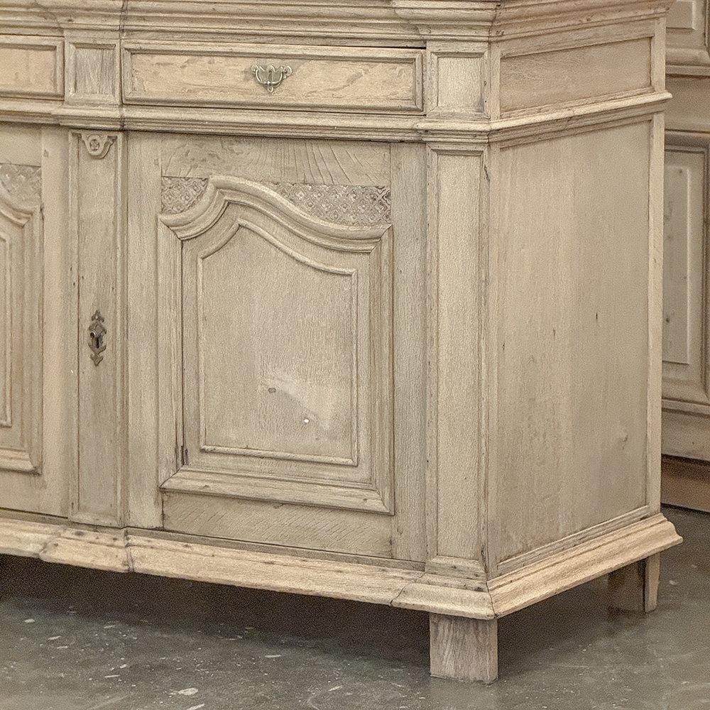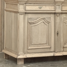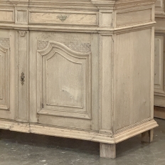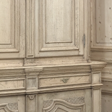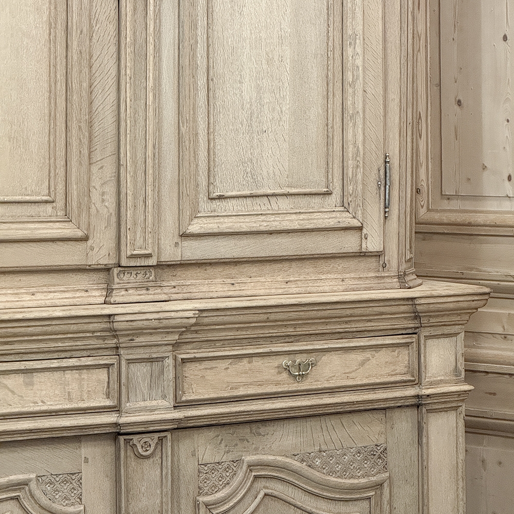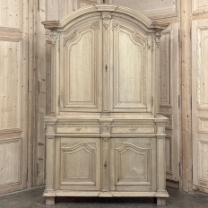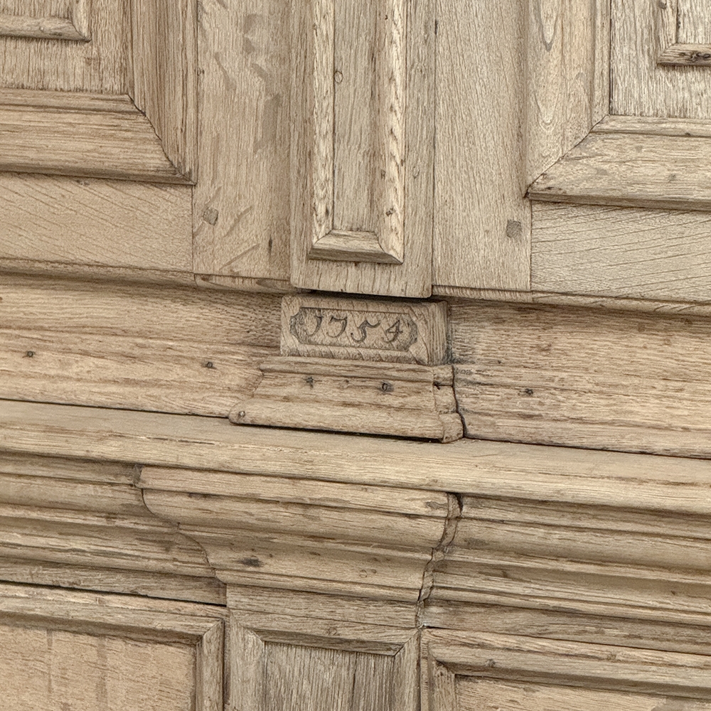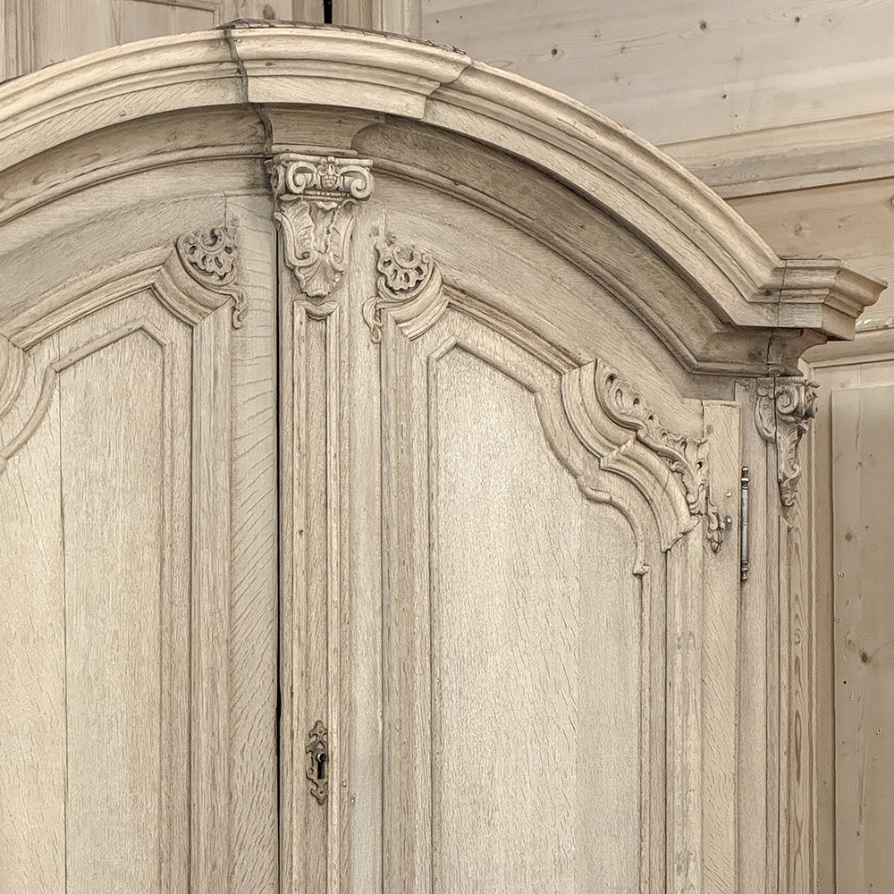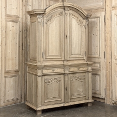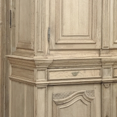 18th Century French Louis XIV Cabinet ~ Armoire in Stripped Oak is a majestic testament to the incredible craftsmen of France, who combined architecture, style and timeless flair into one impressive piece. Utilizing indigenous old-growth white oak, a bold arched crown was fashioned, boldly molded in multiple tiers to accentuate the impact, and overlooking the arched doors of the upper tier. The corners not only project out from the piece, but are defined by mitered molding and corbels matched by the corbel centered at the top of the crown. Stylized shell motifs adorn the intricate molding detail of the cabinet doors which open to reveal five surfaces. The lower tier is a variation of the upper design, but slightly deeper for a cavernous interior, and features a brace of drawers separately distinguished by molding. Painstakingly stripped using our proprietary process that retains the patina and sheer natural beauty of the old wood, all performed by our expert in-house staff.
