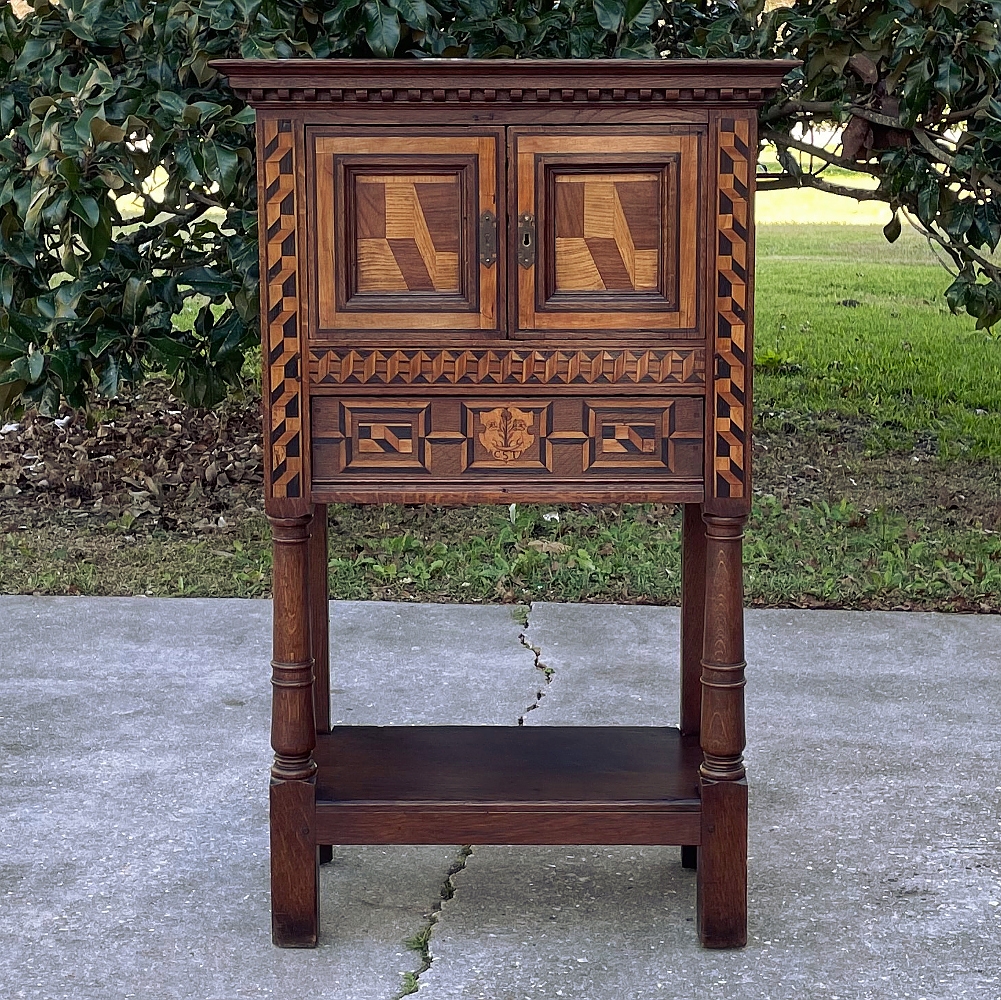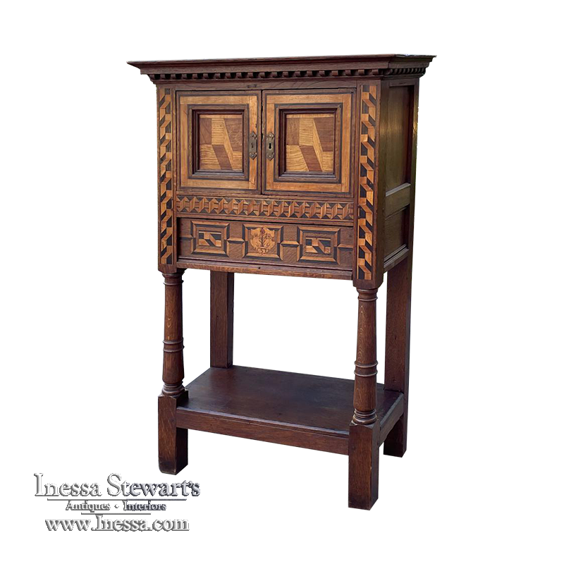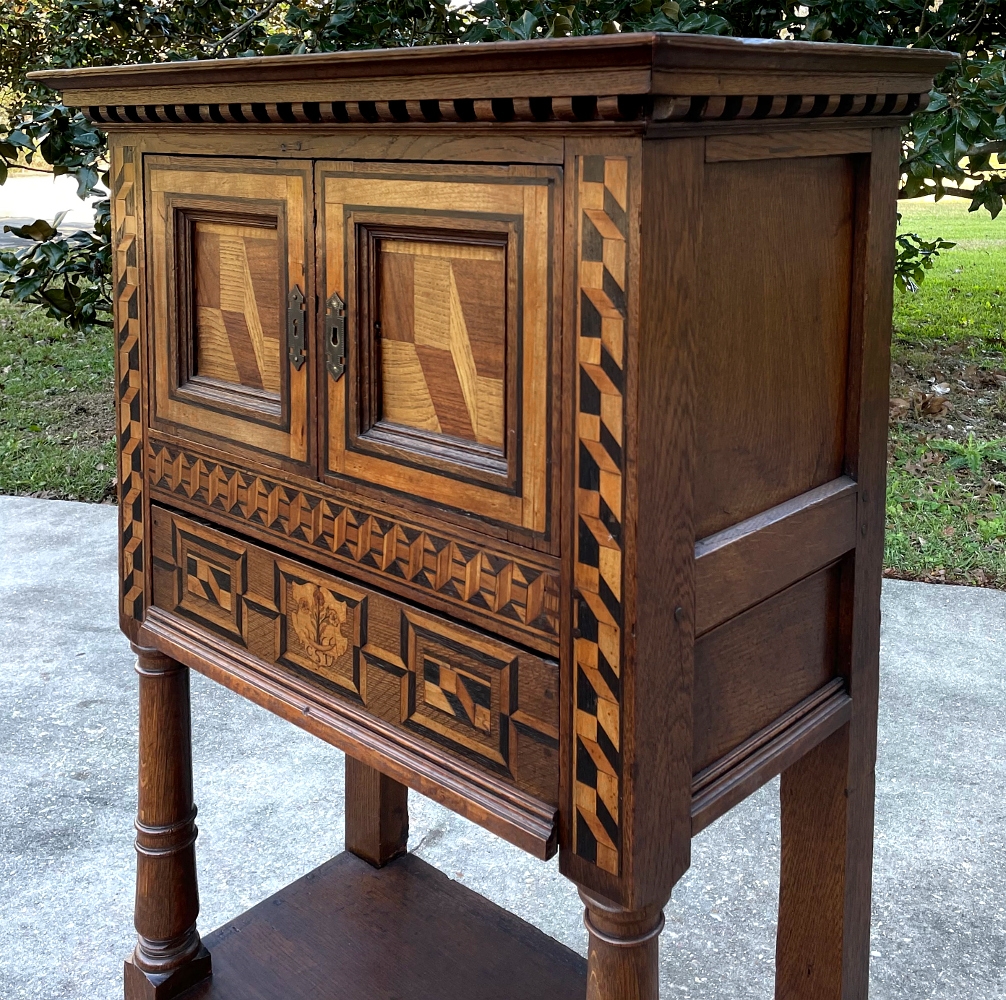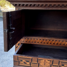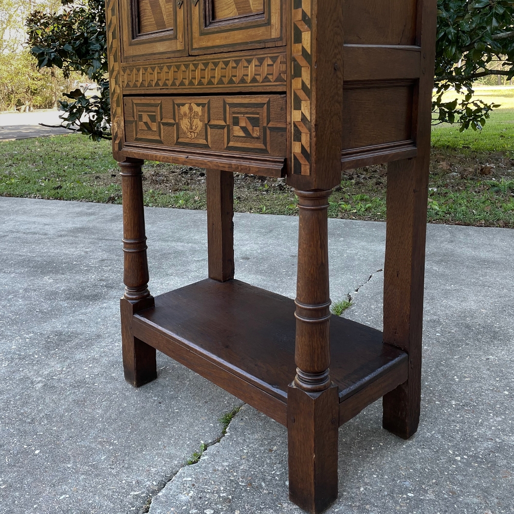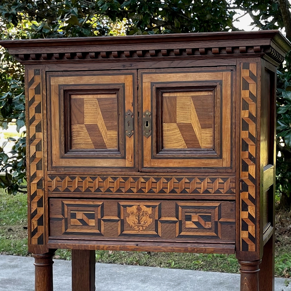 18th Century Italian Marquetry Raised Cabinet is a remarkable example of Old World craftsmanship with surprisingly modernistic and abstract qualities! Commissioned by a patron with the initials CST, it features geometric designs created by the positioning and orientation of different species of woods. Called trompe l'oeuil by the French, or "fool the eye", some of the designs appear to be three dimensional. The forms on the cabinet doors are especially intriguing, as are those on the full width drawer. Dentil trim appears below the bold crown molding, and the entire cabinet is set upon turned legs in front and timber legs at the rear which also support a full width lower shelf. Designed to hold prized items like tobacco, tea, or fine liquor, the cabinets were kept locked at all times. Note the pegged mortise & tenon construction, plus the hand-hewn planks that form the back side.