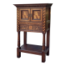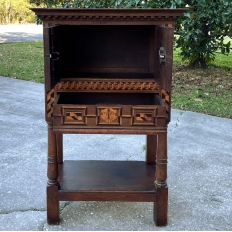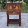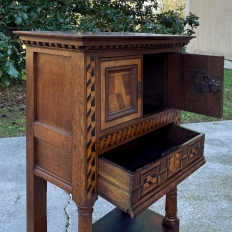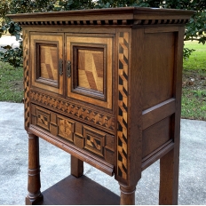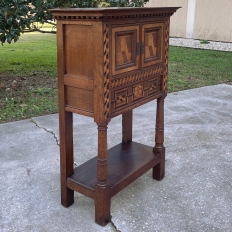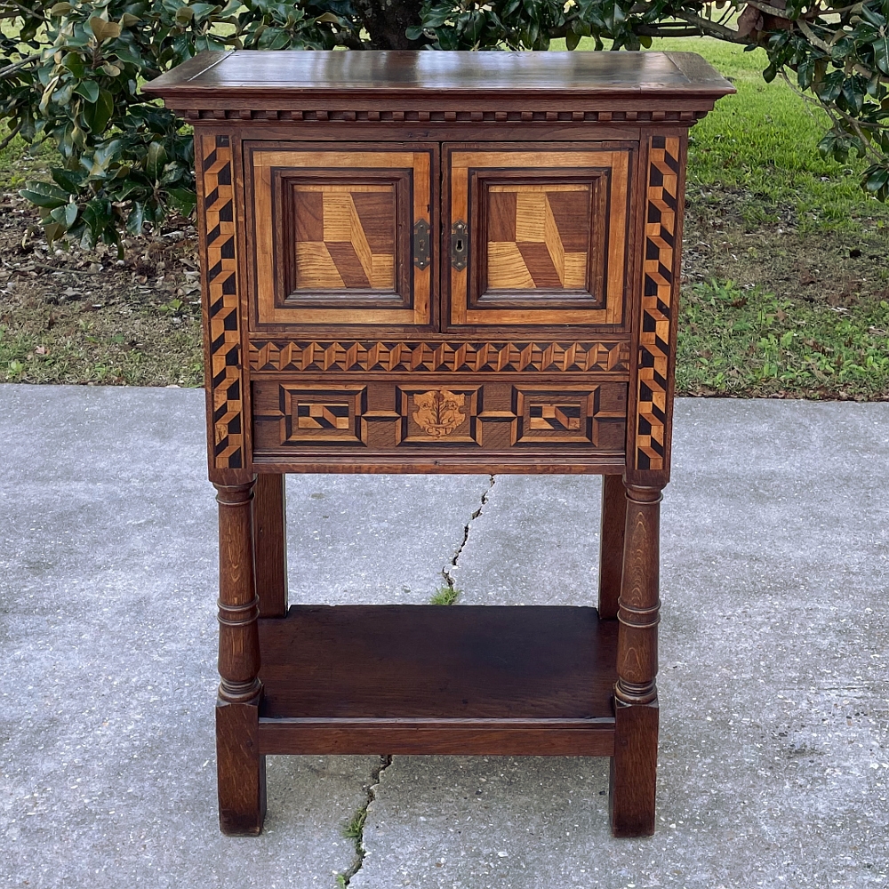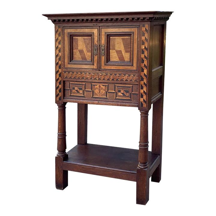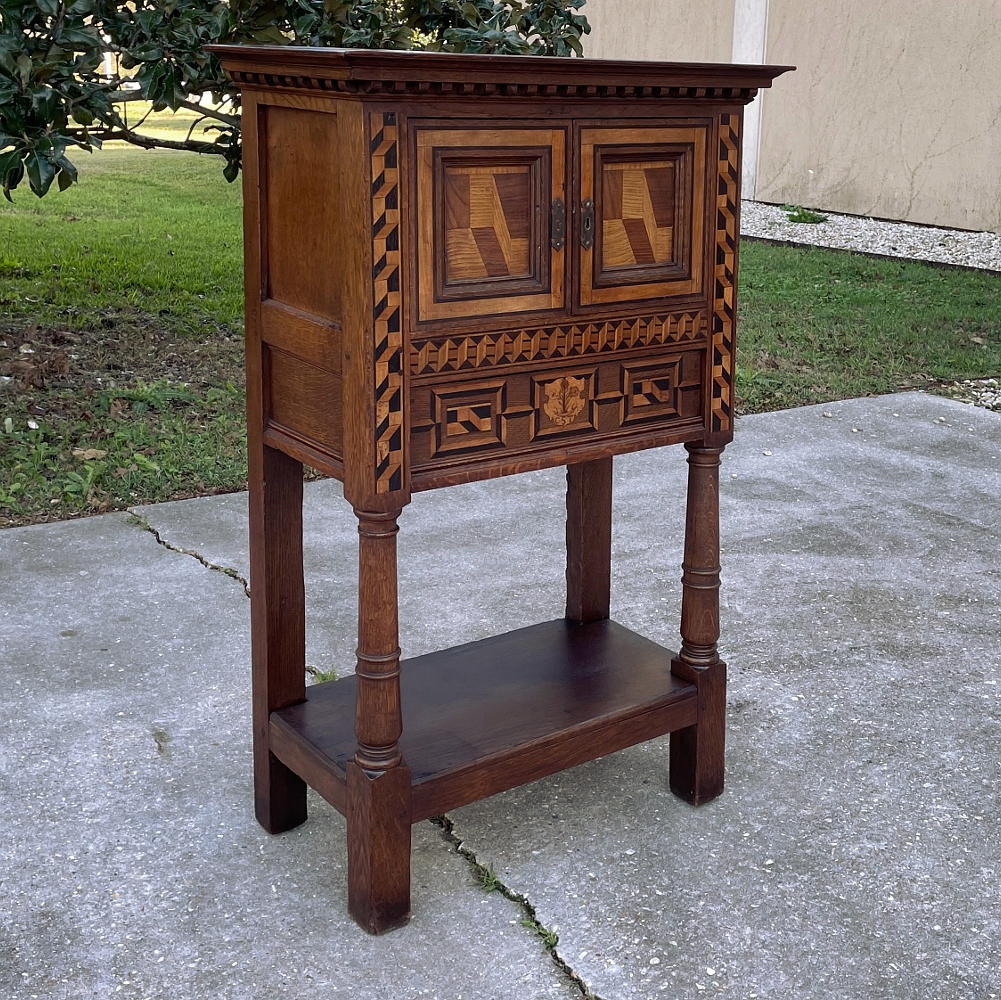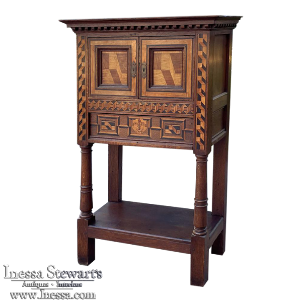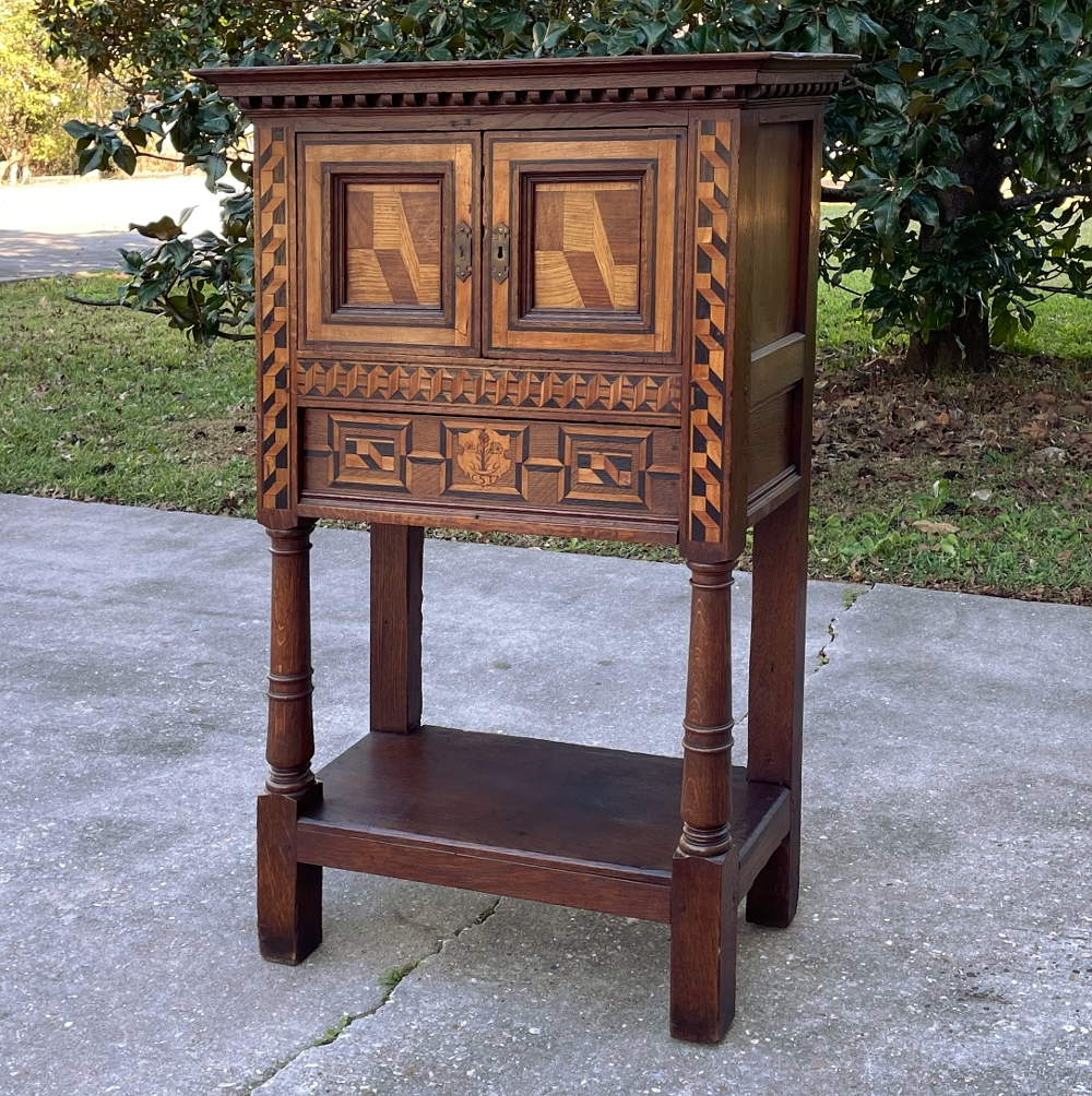 18th Century Italian Marquetry Raised Cabinet is a remarkable example of Old World craftsmanship with surprisingly modernistic and abstract qualities! Commissioned by a patron with the initials CST, it features geometric designs created by the positioning and orientation of different species of woods. Called trompe l'oeuil by the French, or "fool the eye", some of the designs appear to be three dimensional. The forms on the cabinet doors are especially intriguing, as are those on the full width drawer. Dentil trim appears below the bold crown molding, and the entire cabinet is set upon turned legs in front and timber legs at the rear which also support a full width lower shelf. Designed to hold prized items like tobacco, tea, or fine liquor, the cabinets were kept locked at all times. Note the pegged mortise & tenon construction, plus the hand-hewn planks that form the back side.