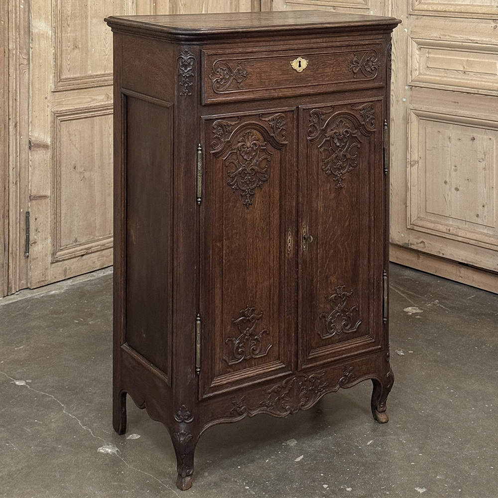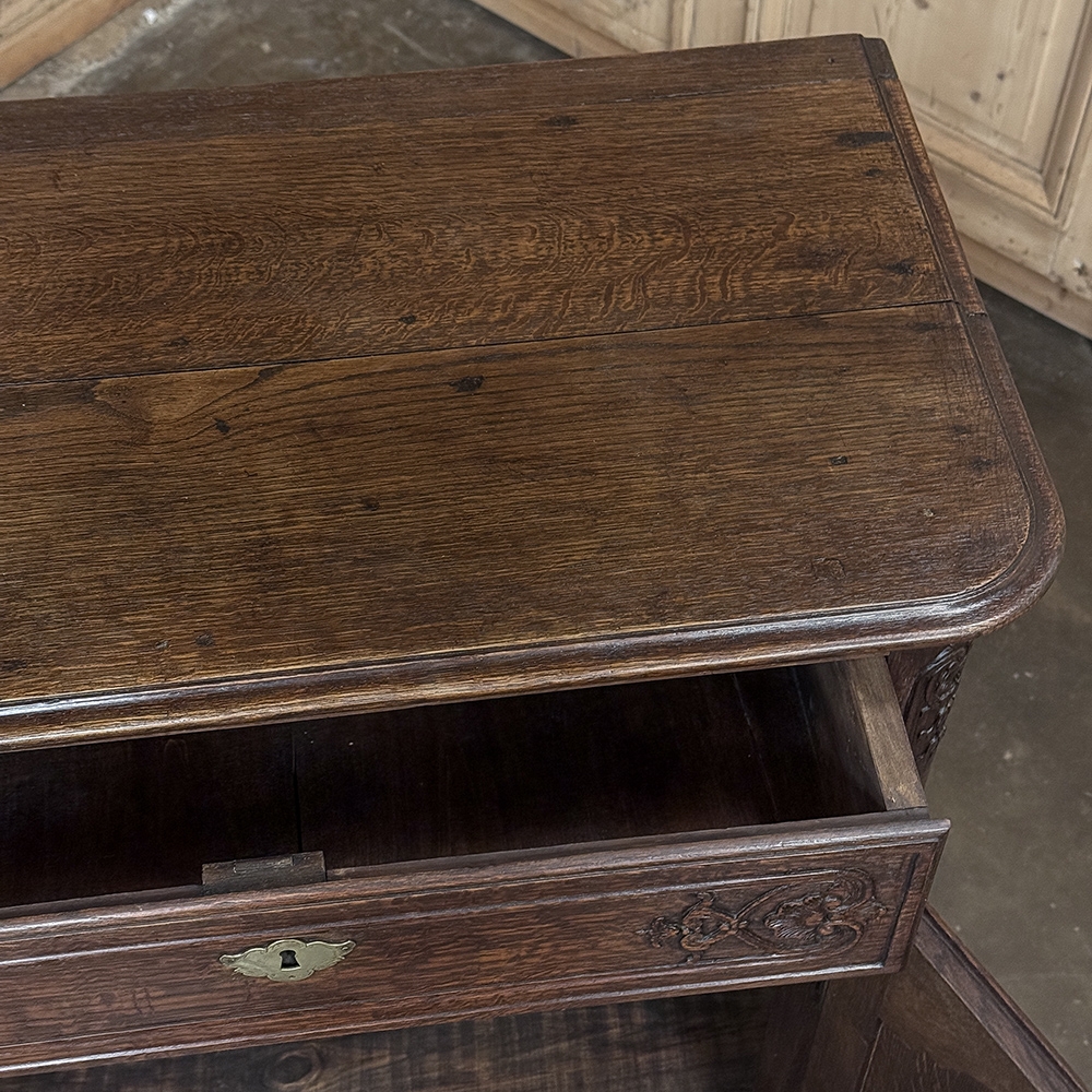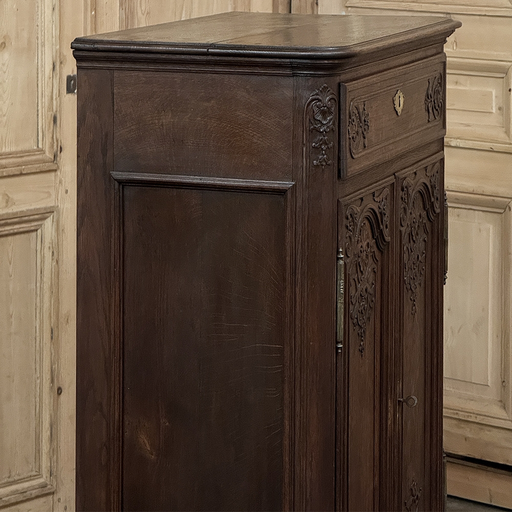 19th Century Country French Liegoise Confiturer ~ Cabinet was hand-crafted from dense, old-growth indigenous white oak by the master artisans of Liege. The storied region has centuries of history in the creation of fine hand-made goods of all types, but is most known in antique circles for its furniture. This example is also of an intriguing design, ideal for narrow spaces while still exuding a refined Country French charm thanks to its hand-carved embellishment. Usually one door affairs, this example boasts a brace of doors not just carved, but hung with brass hinges and fitted with brass key guards. A contoured and carved apron with scrolled feet rounds out the package below, while a full width drawer fitted with a brass key guard finishes out the top. Just enough surface and storage to make use of a space between windows, a corner, or other such types of spaces, with less than a foot and a half in depth added to the appeal!
